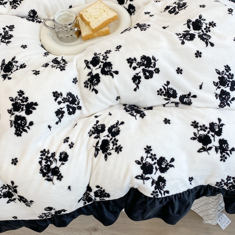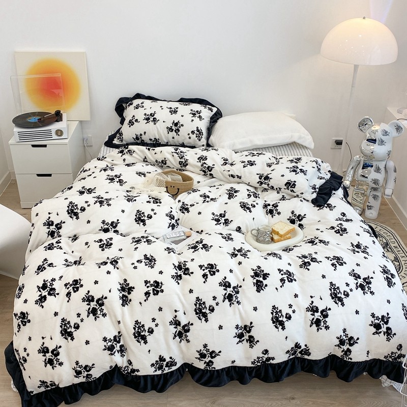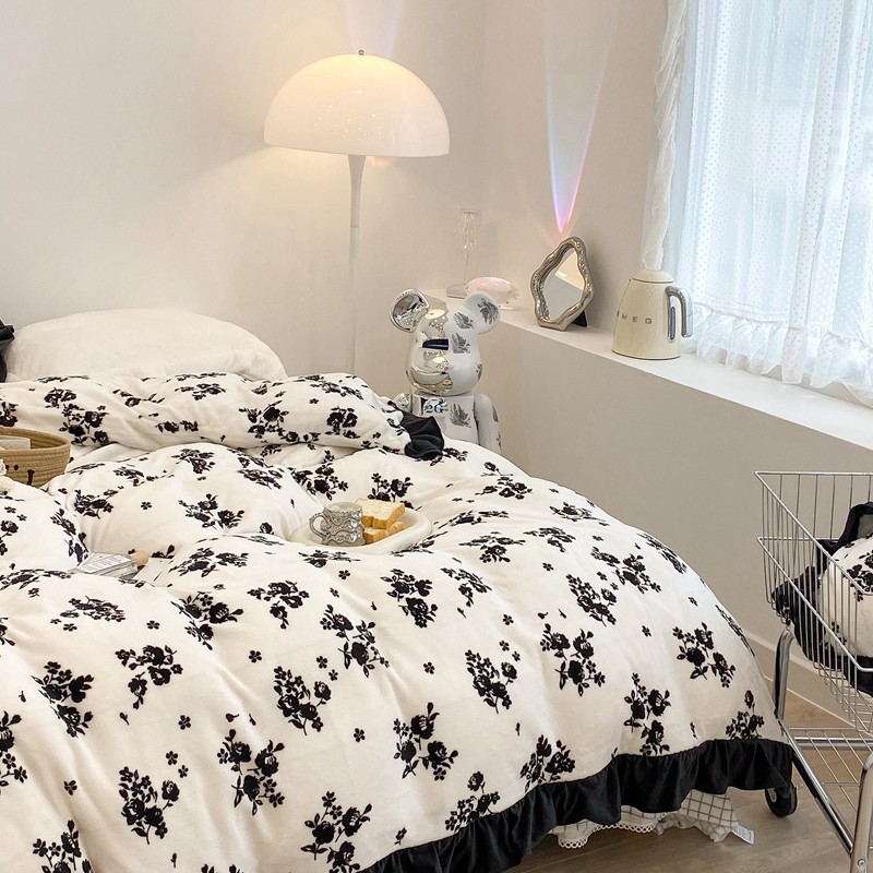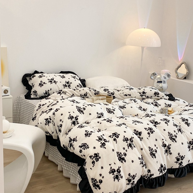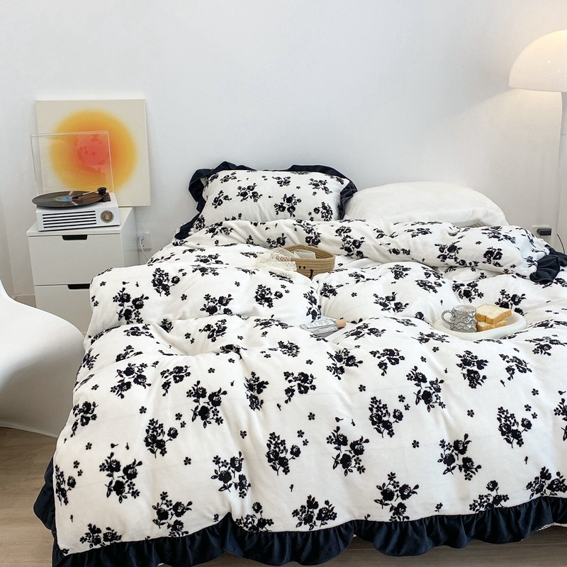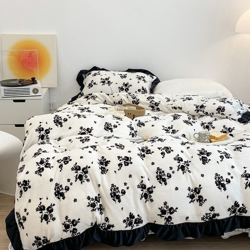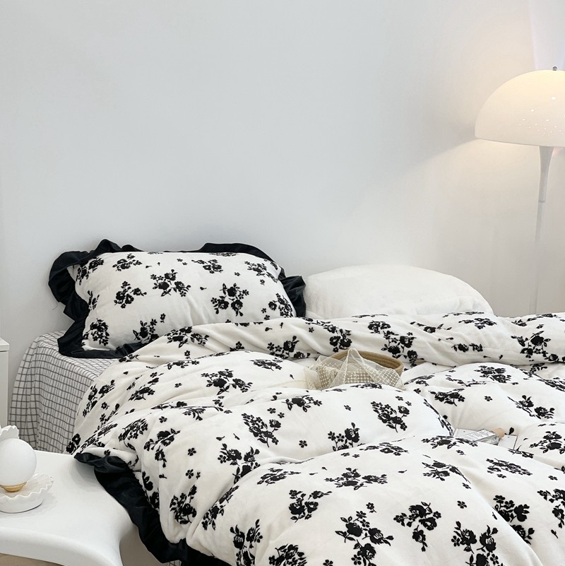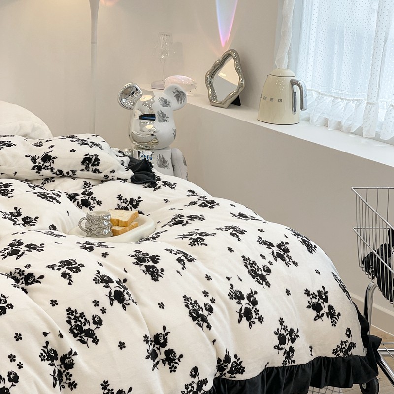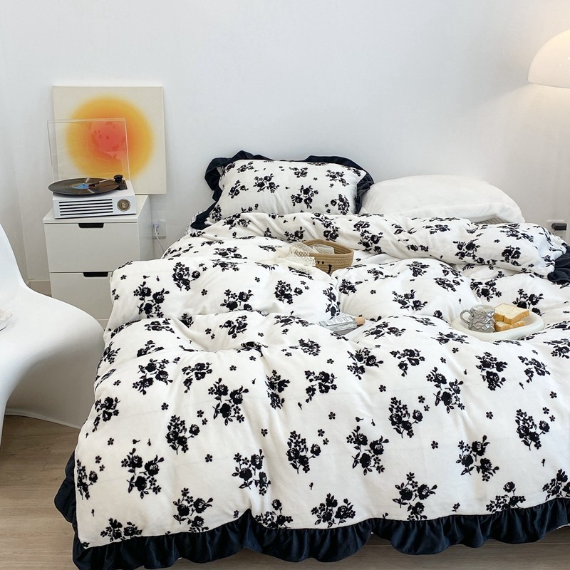 昔可家纺 2021新款黑色花边牛奶绒四件套 小香黑花