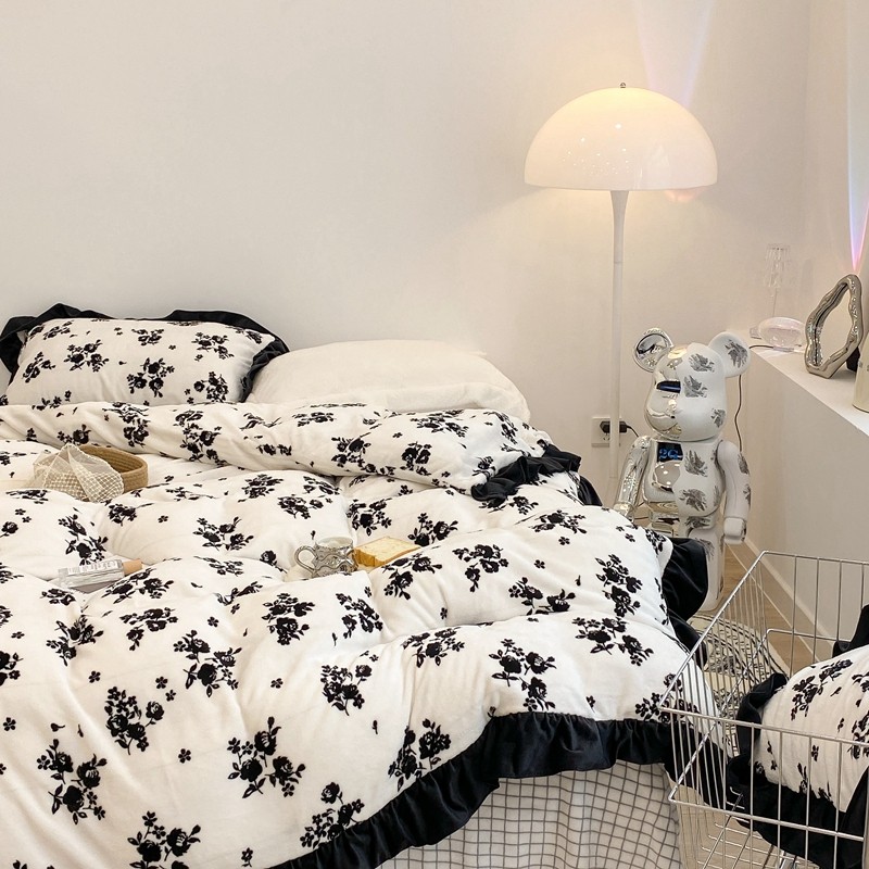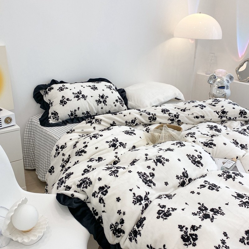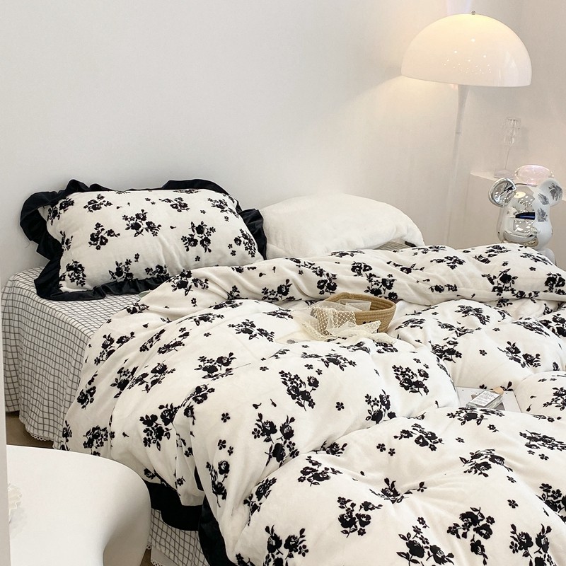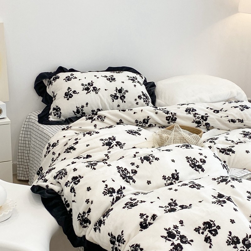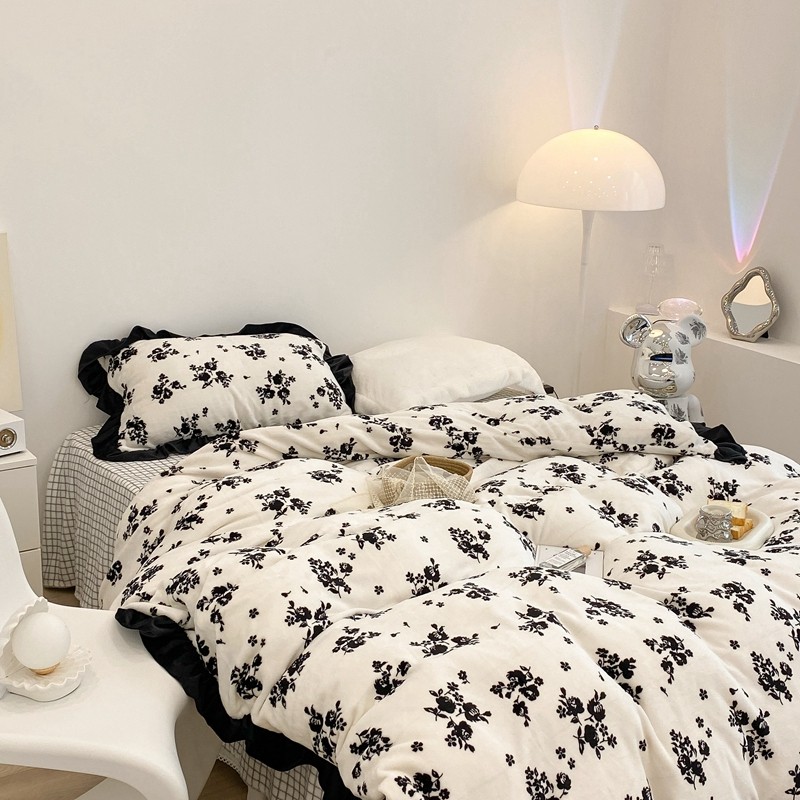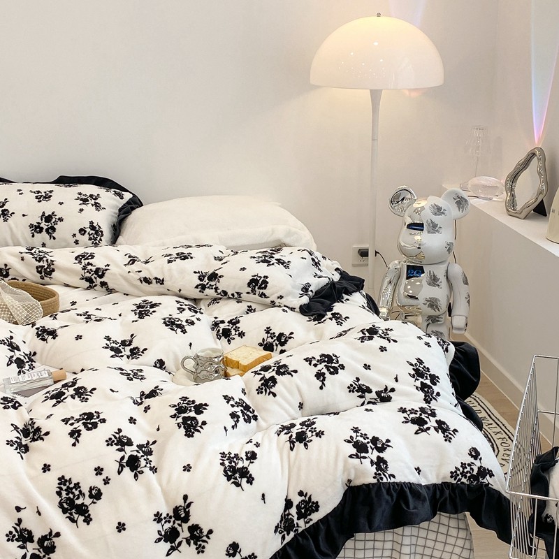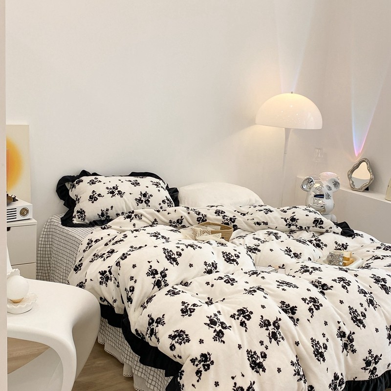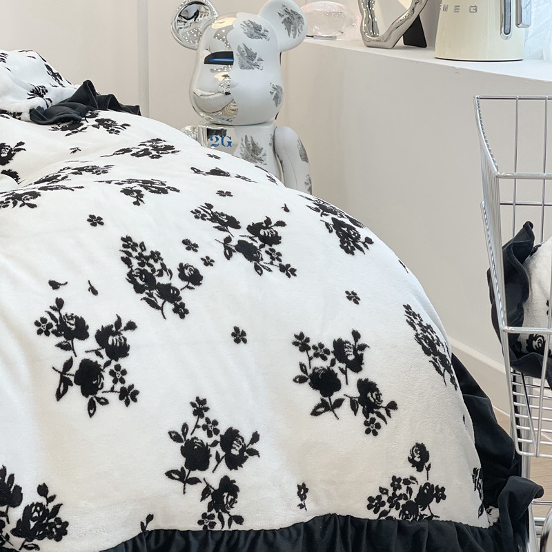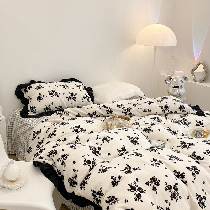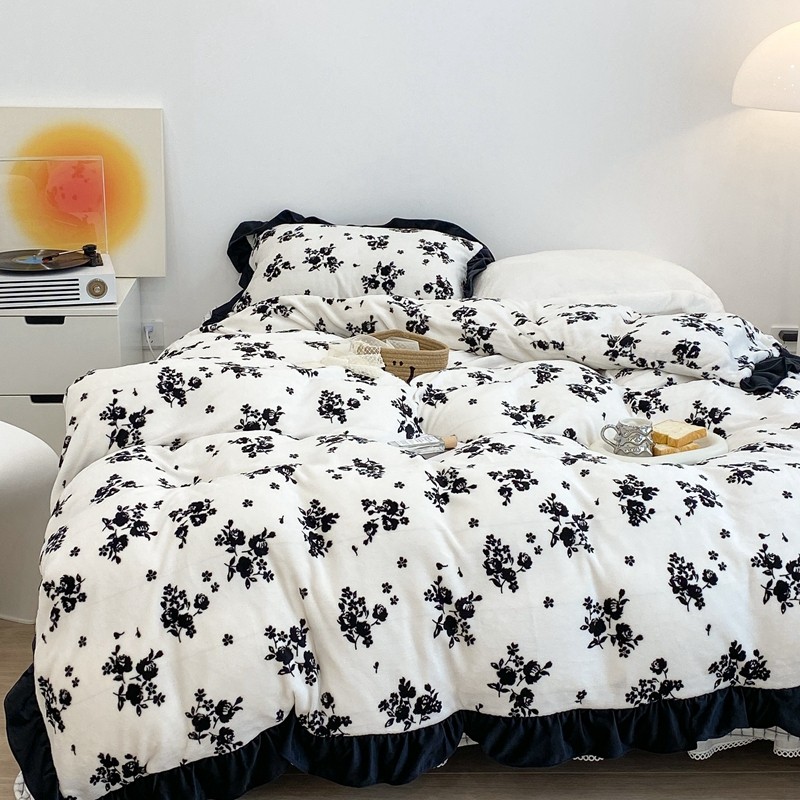 昔可家纺 2021新款黑色花边牛奶绒四件套 小香黑花