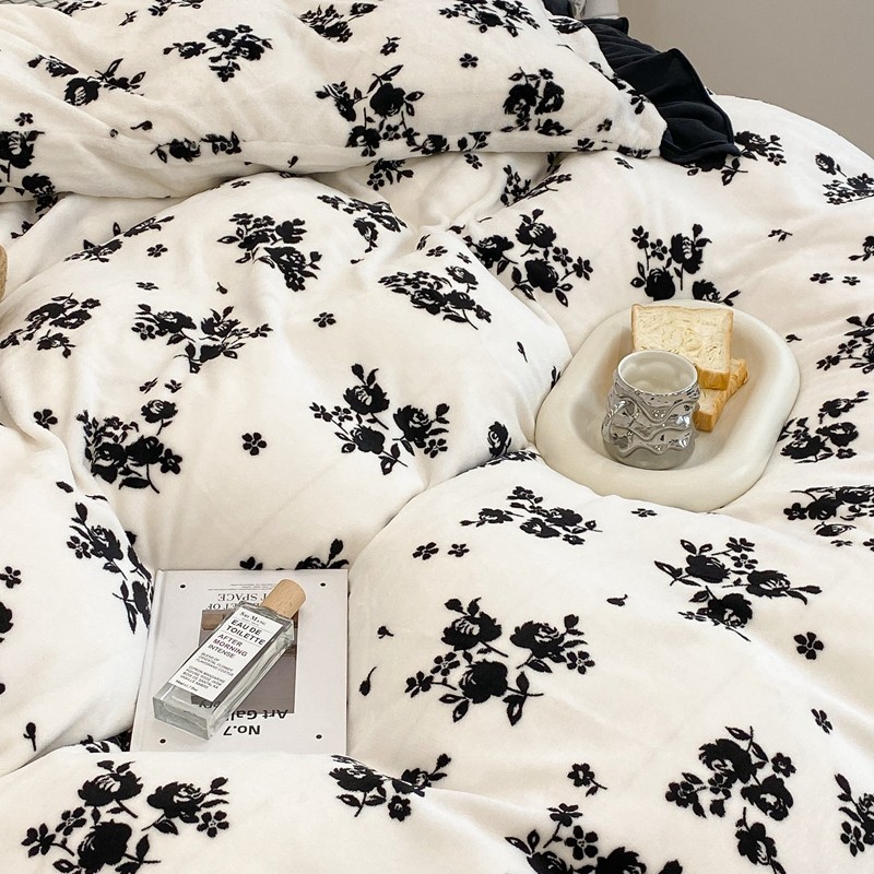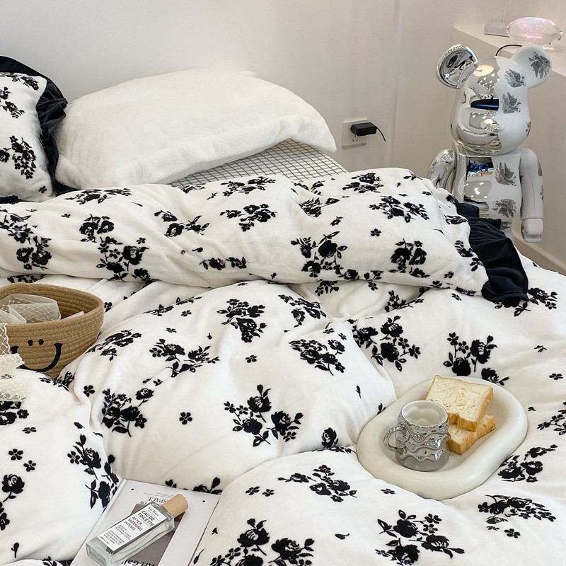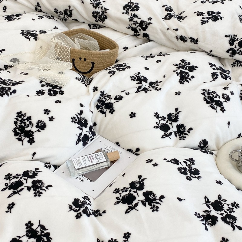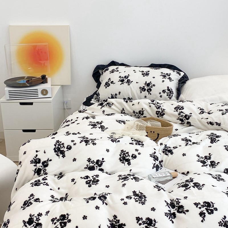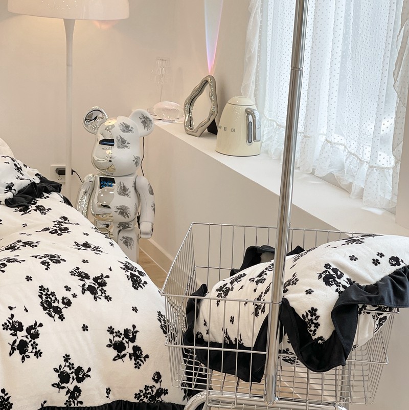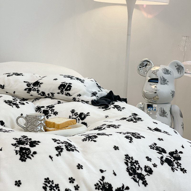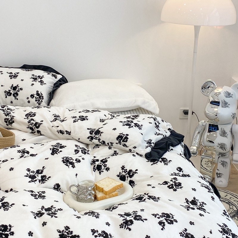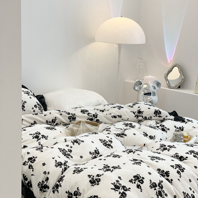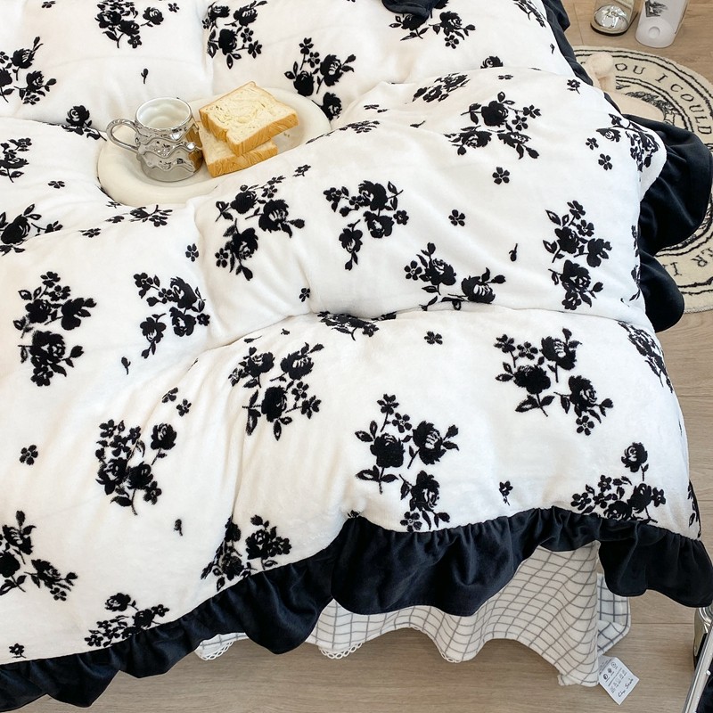 昔可家纺 2021新款黑色花边牛奶绒四件套 小香黑花