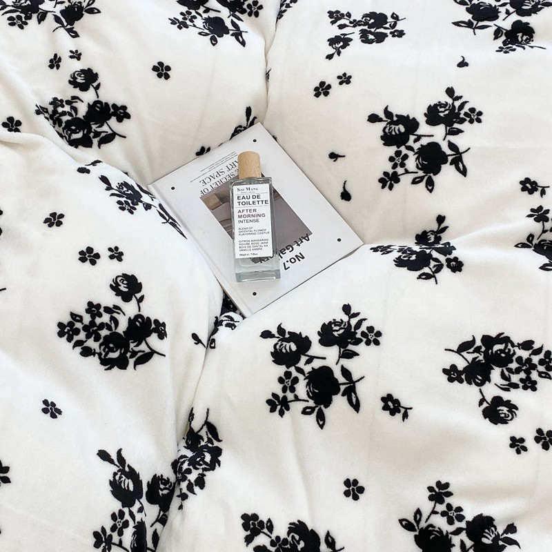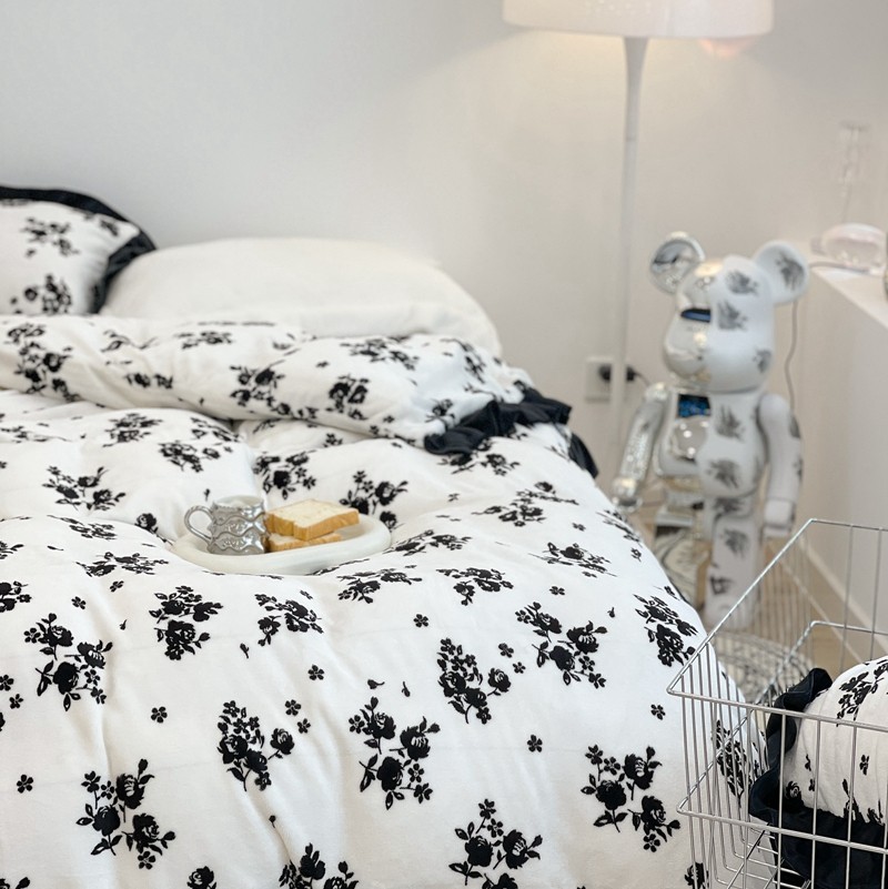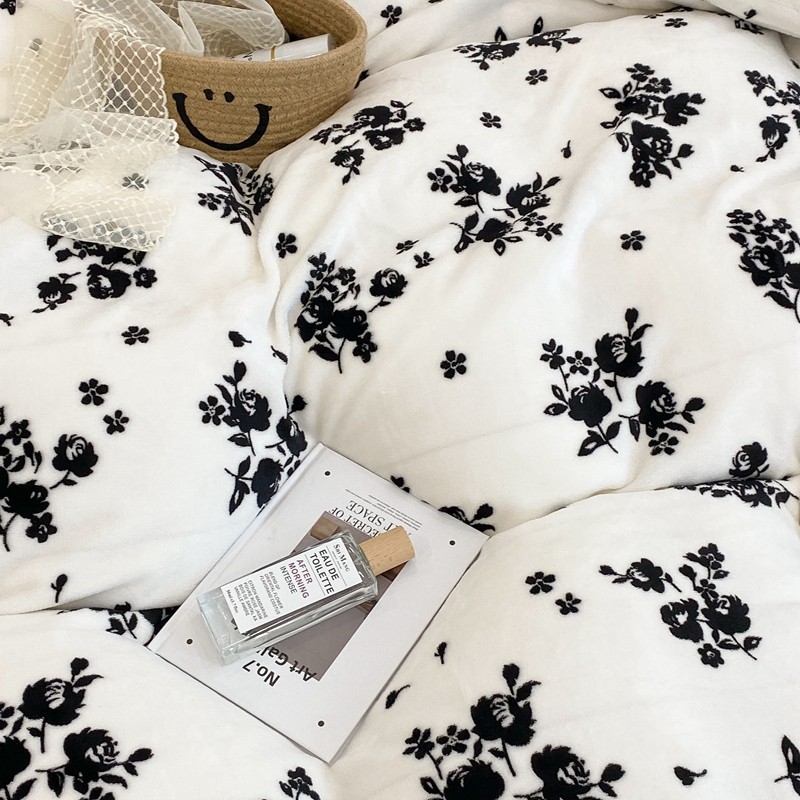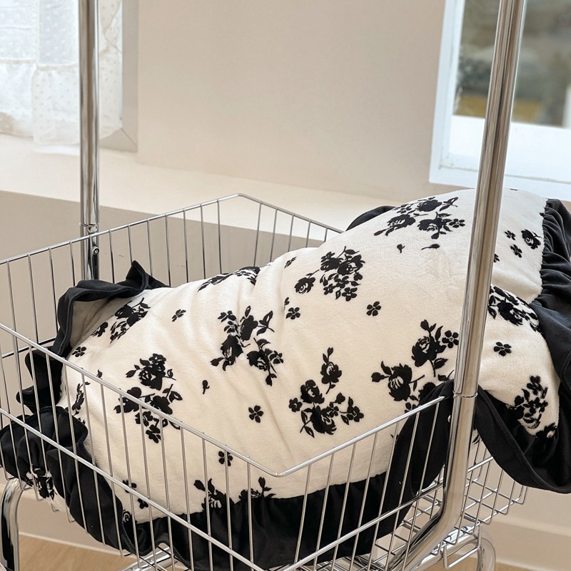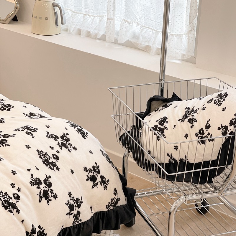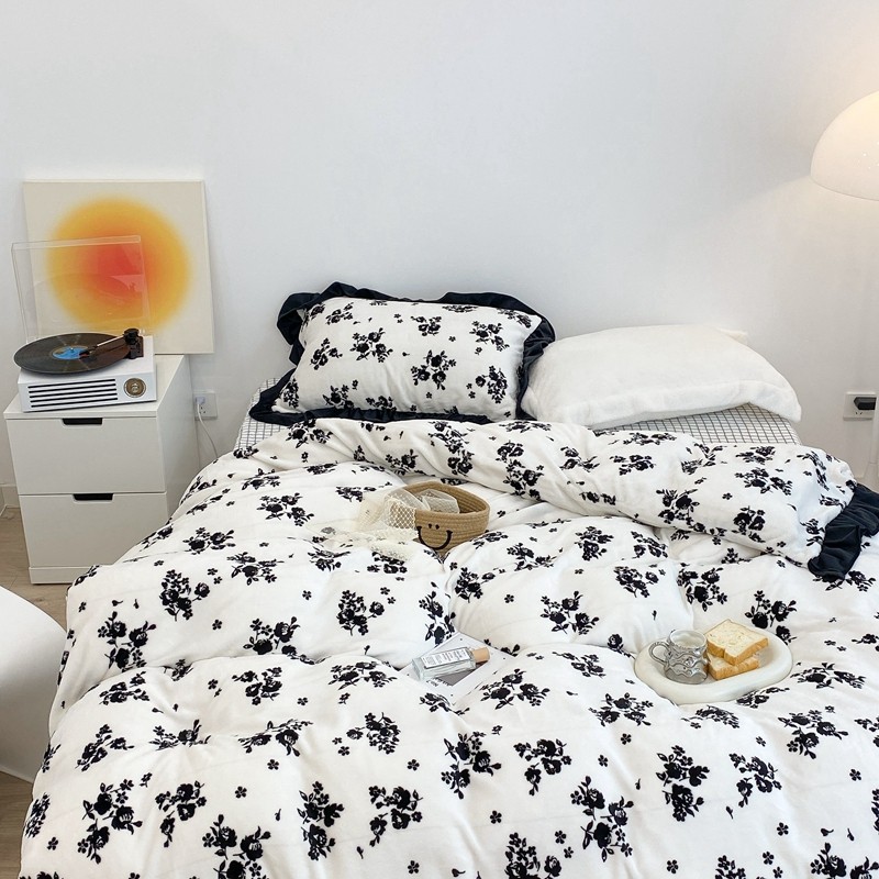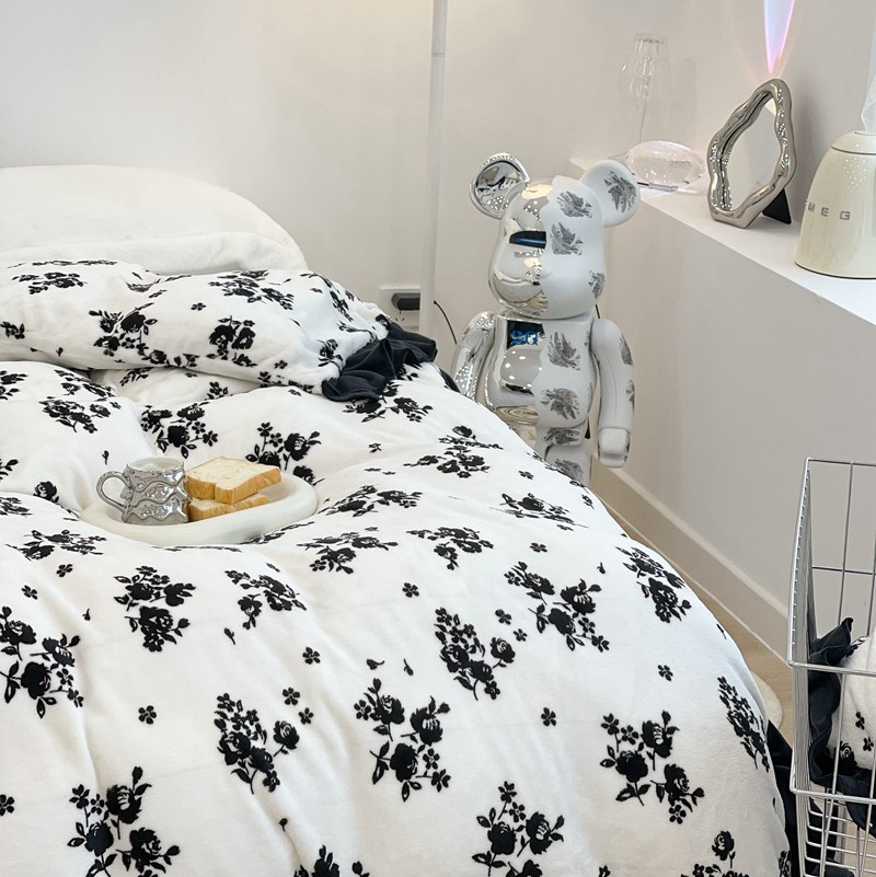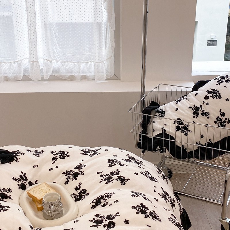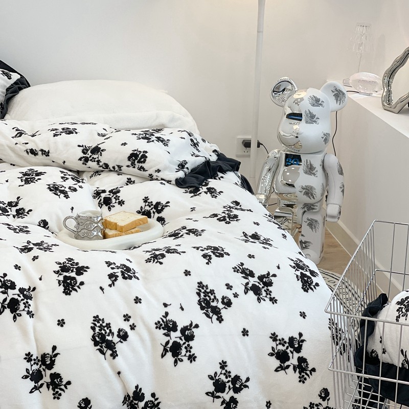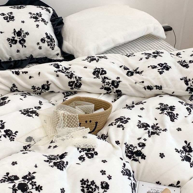 昔可家纺 2021新款黑色花边牛奶绒四件套 小香黑花