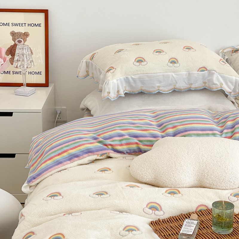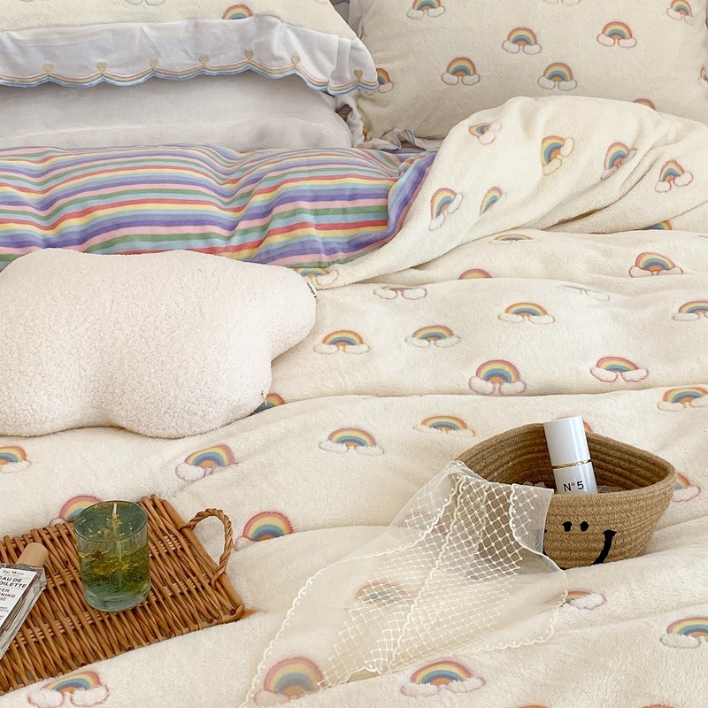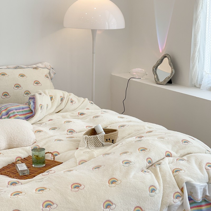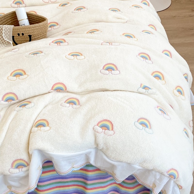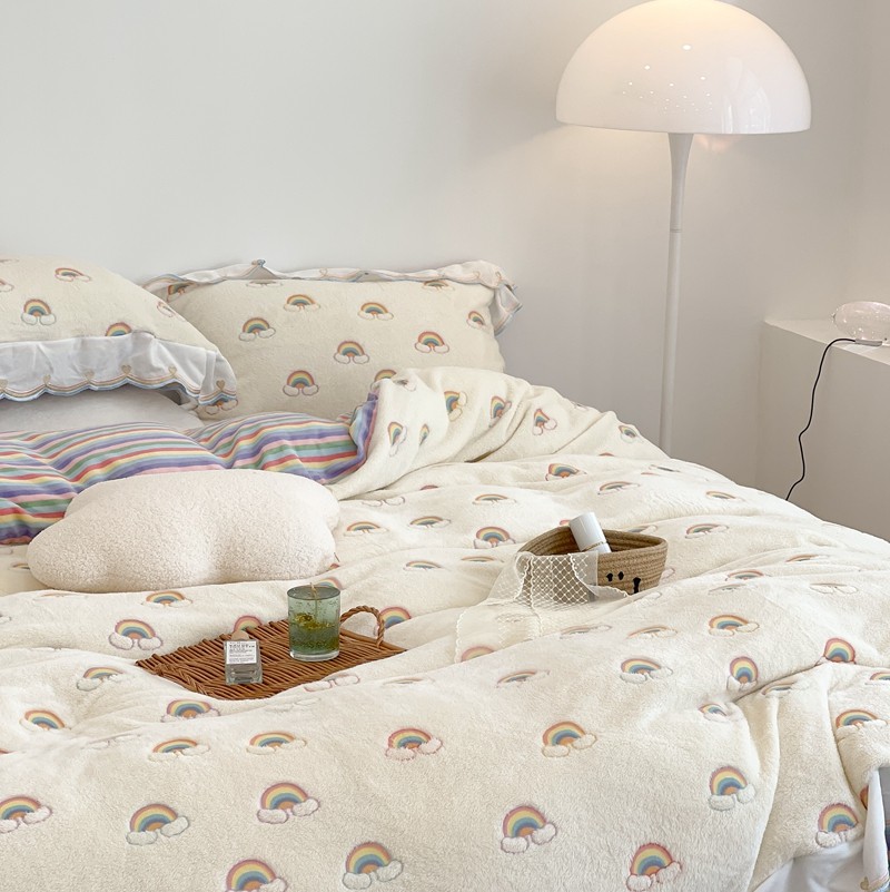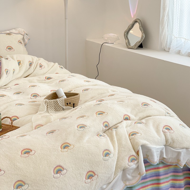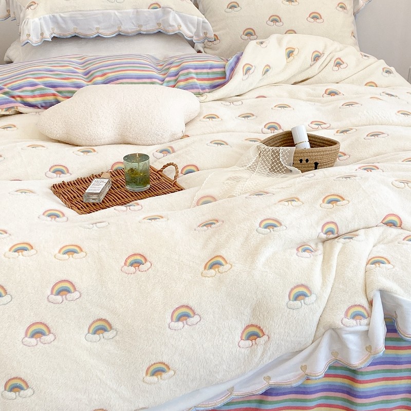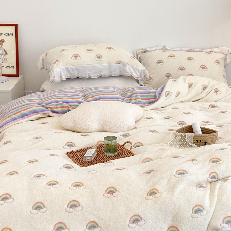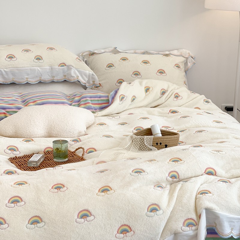 昔可家纺 2021新款coco雪貂绒四件套 小彩虹米白