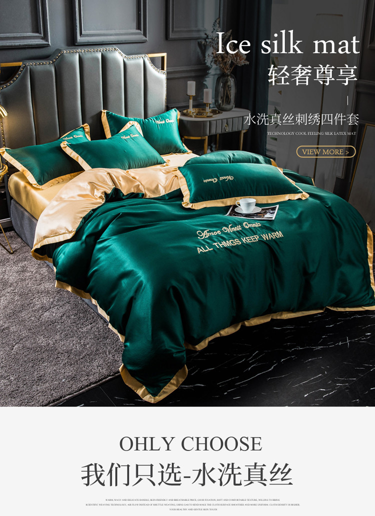 商品名称:欧冠 2022新款水洗真丝盛夏系列四件套 墨绿+姜黄