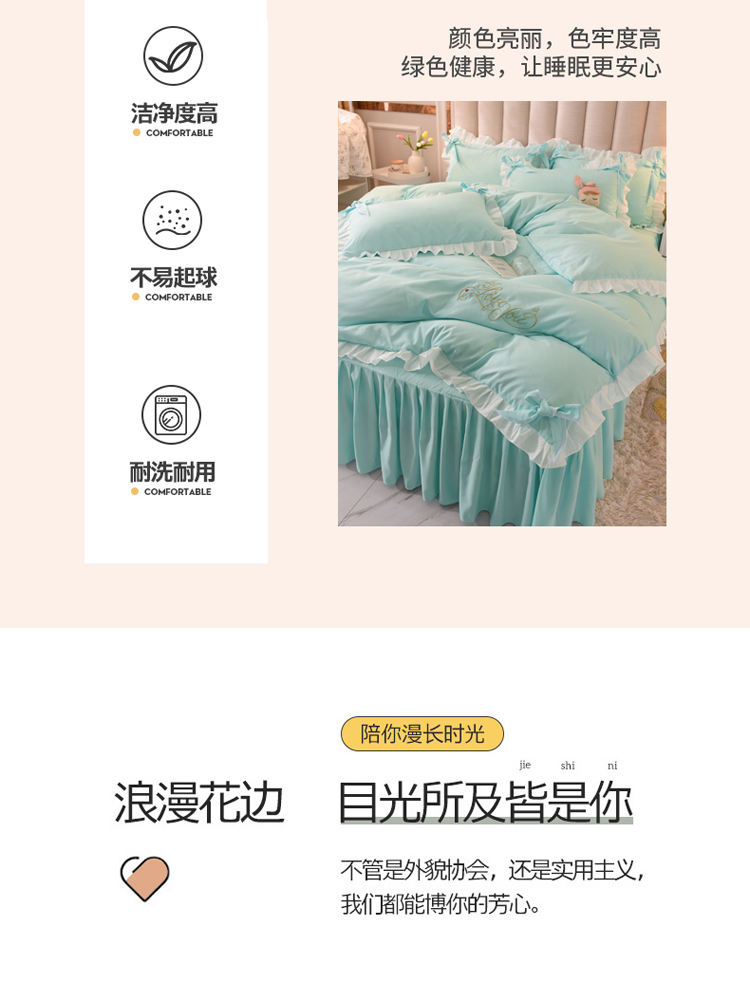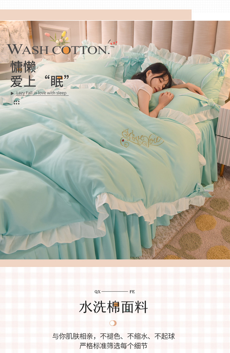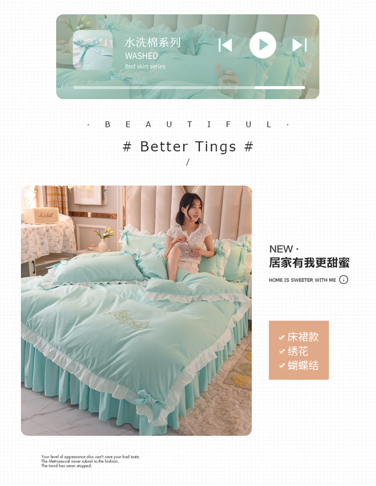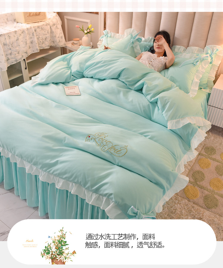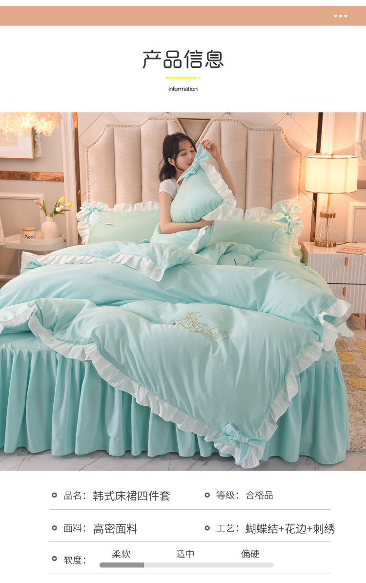 当前位置: 91家纺网 > 商品网购 > 床品套件 > 四件套 > 水洗棉四件套 > 欧冠 2022新款潮系列爱巢款床裙款刺绣四件套 碧绿