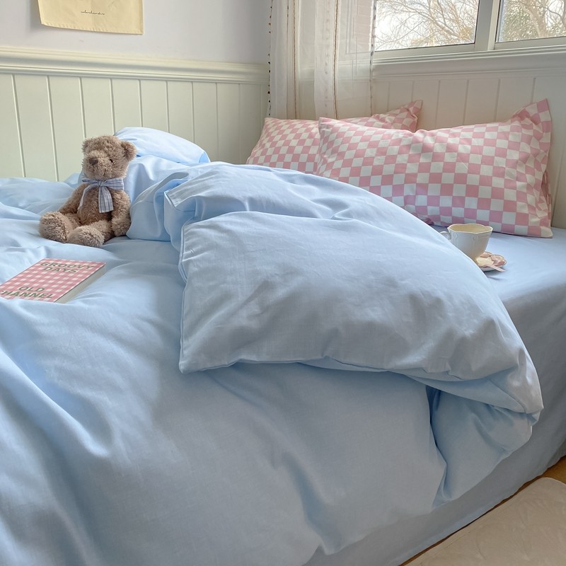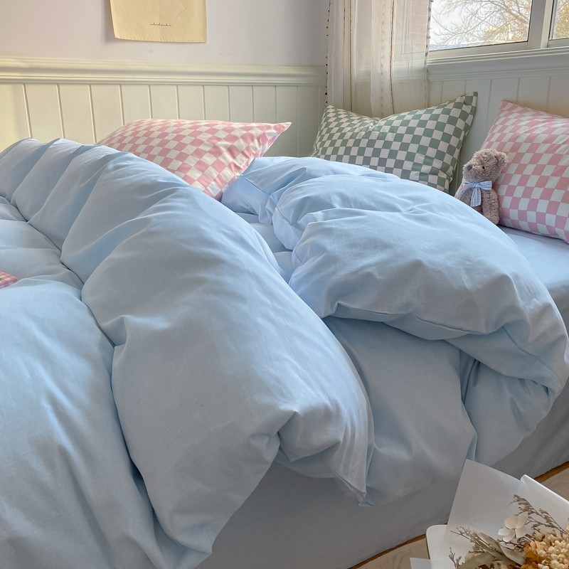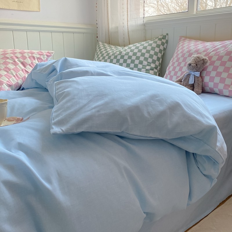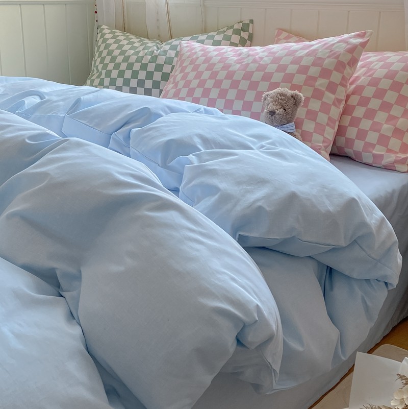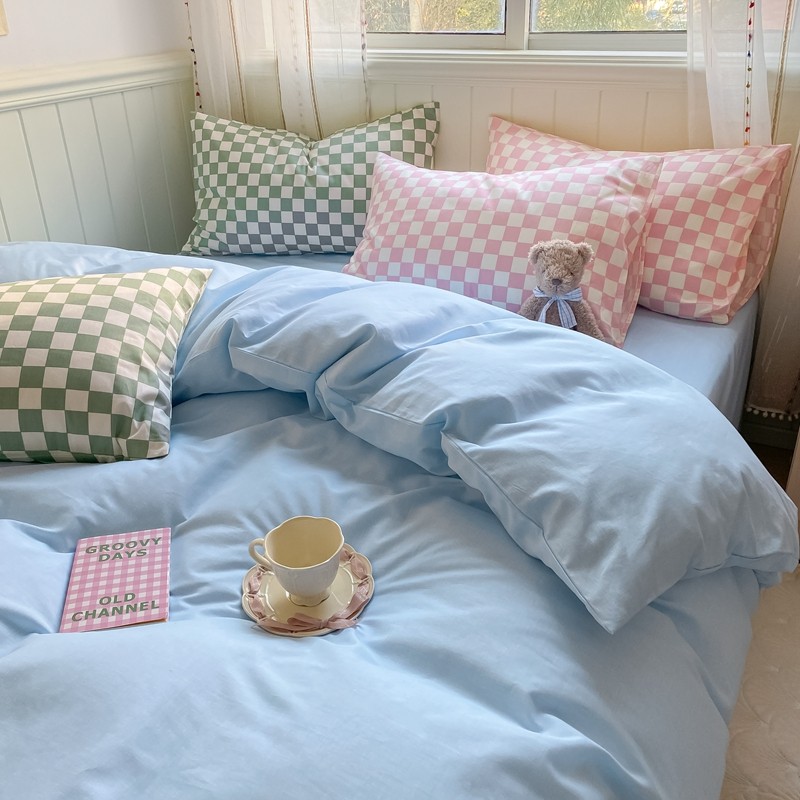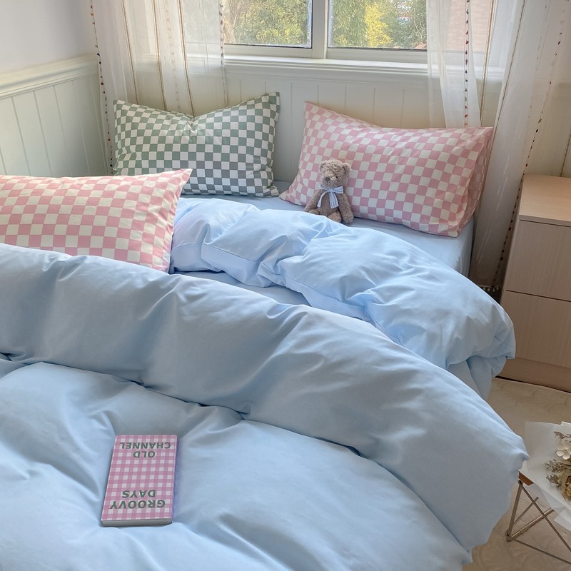 昔可2022新款混搭纯色棋盘格套件四件套 奶蓝粉棋盘