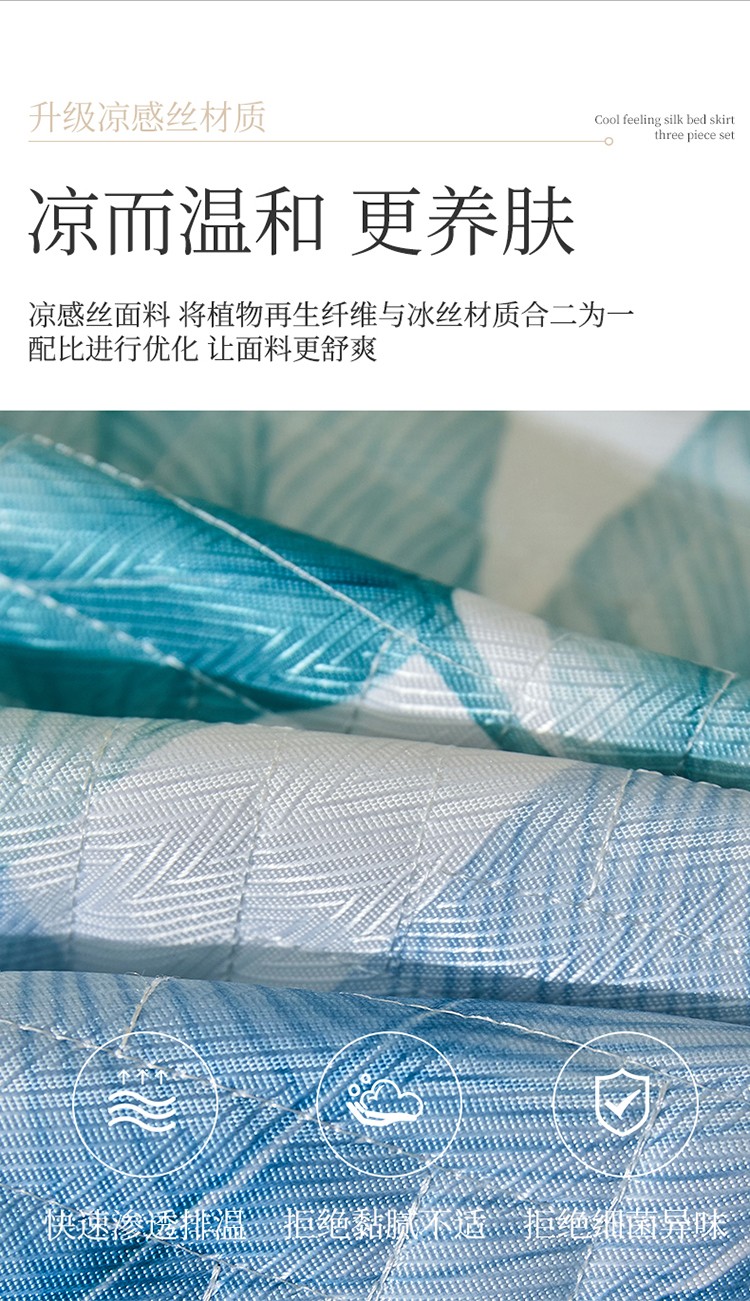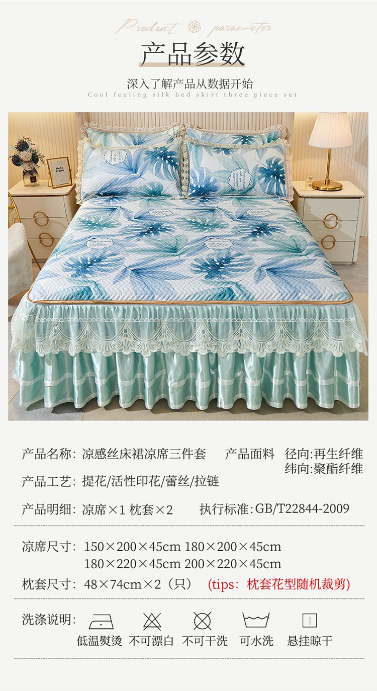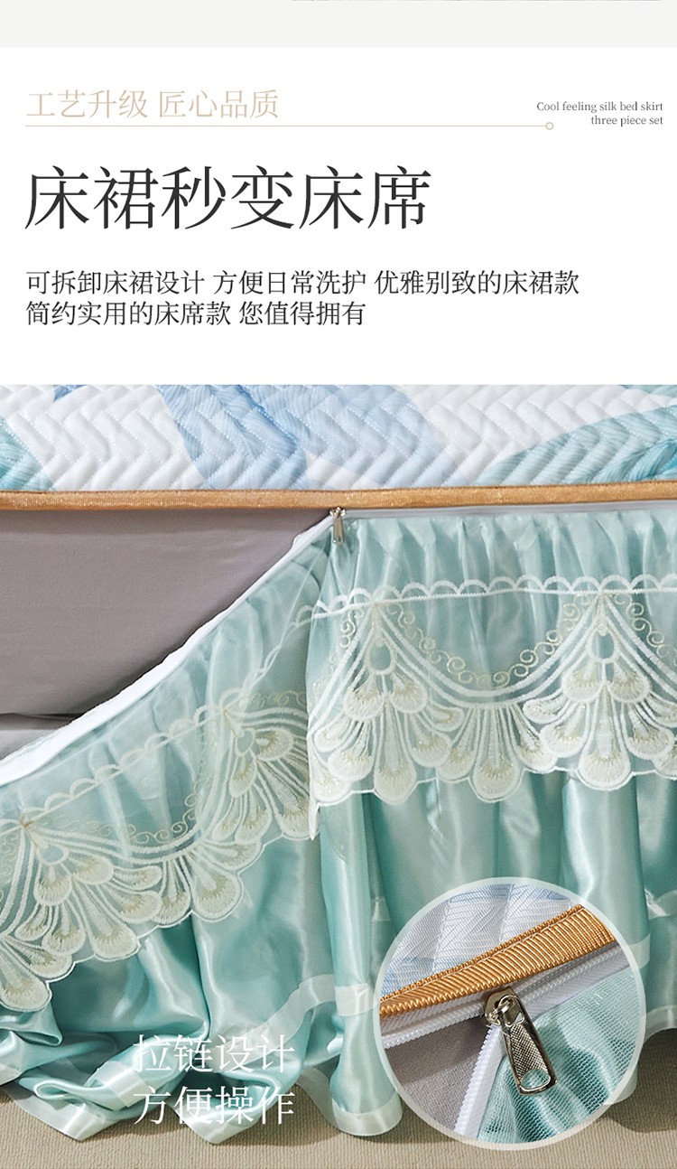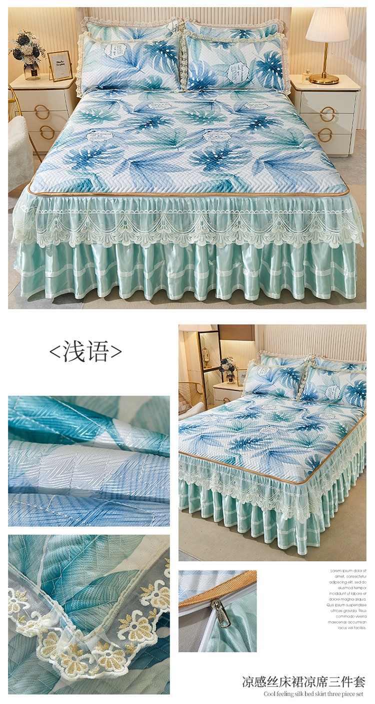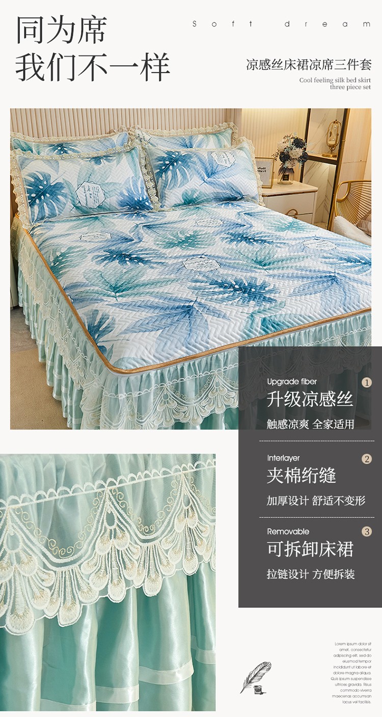 商品名称:网红馆 2025新款凉感丝夹棉绗缝蕾丝床裙款冰丝席三件套 浅语