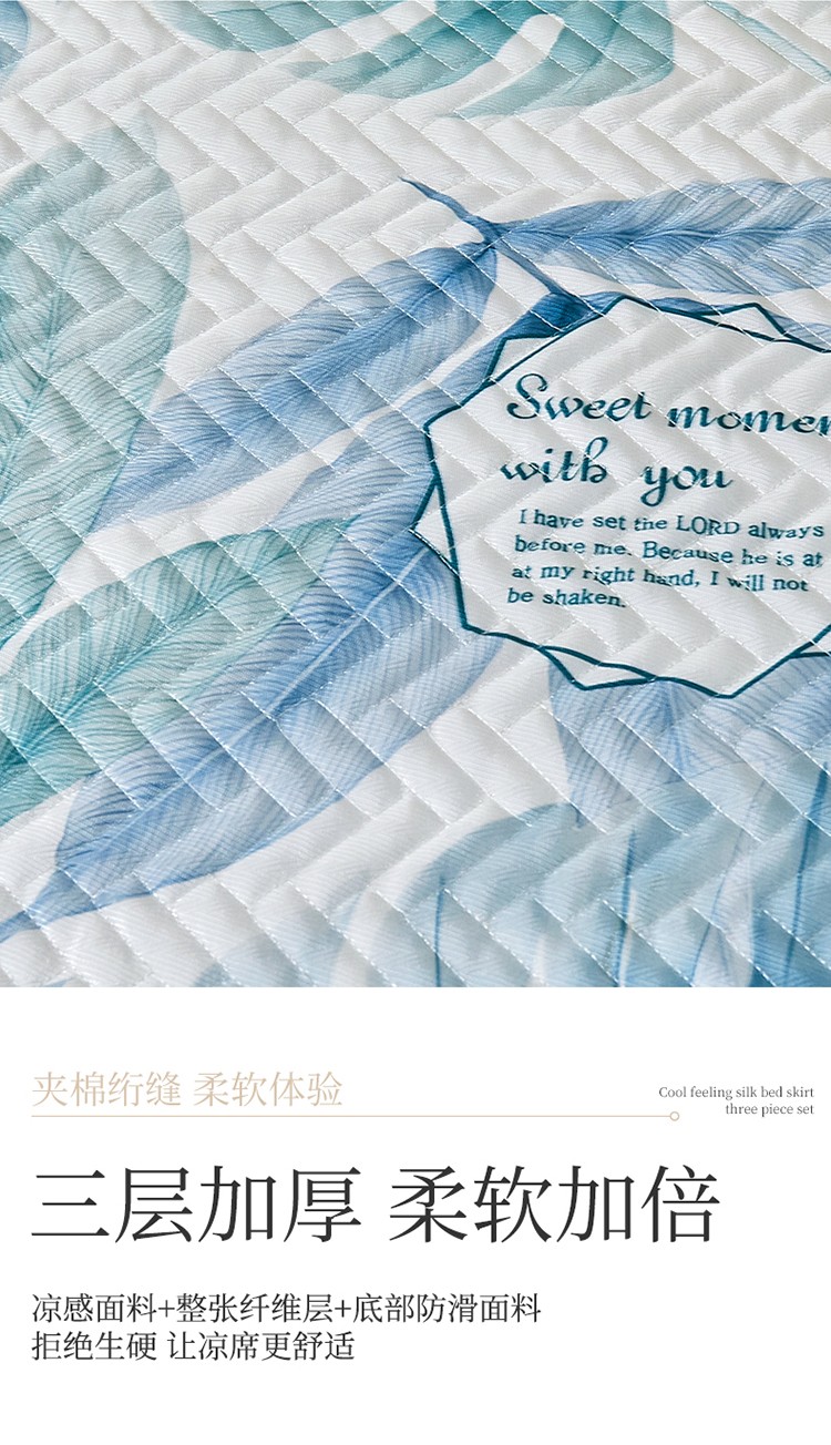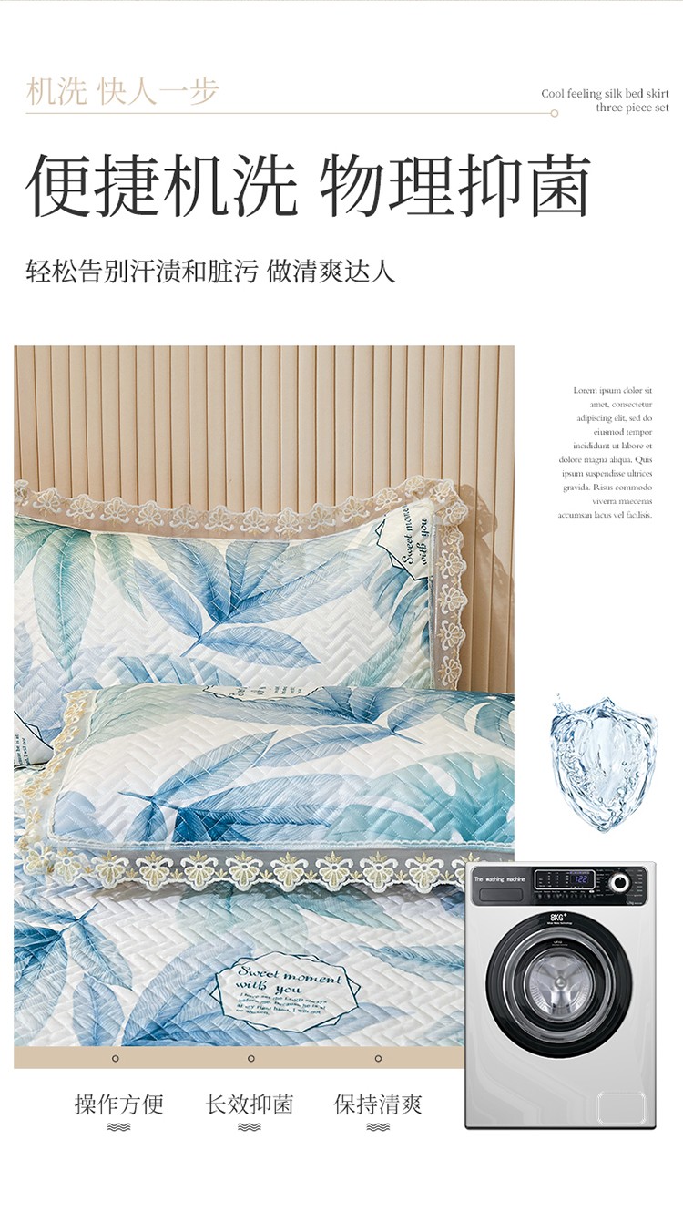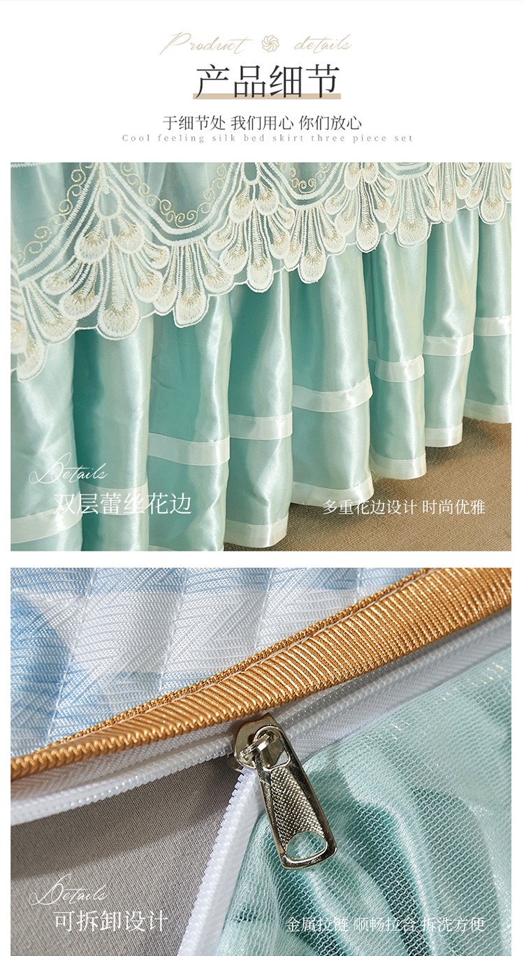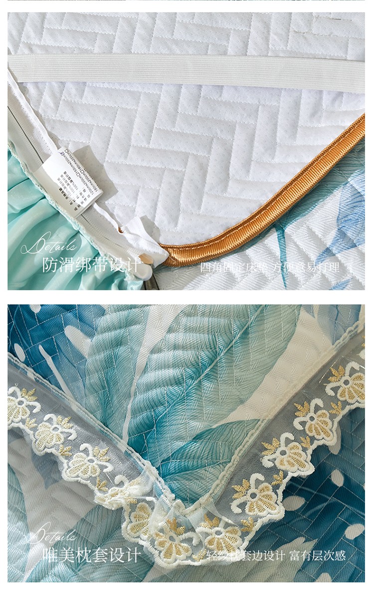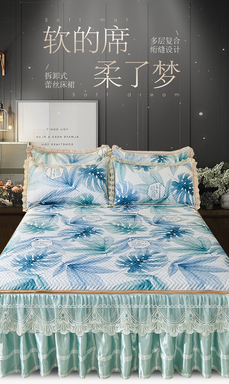 商品名称:网红馆 2025新款凉感丝夹棉绗缝蕾丝床裙款冰丝席三件套 浅语