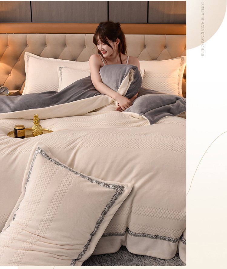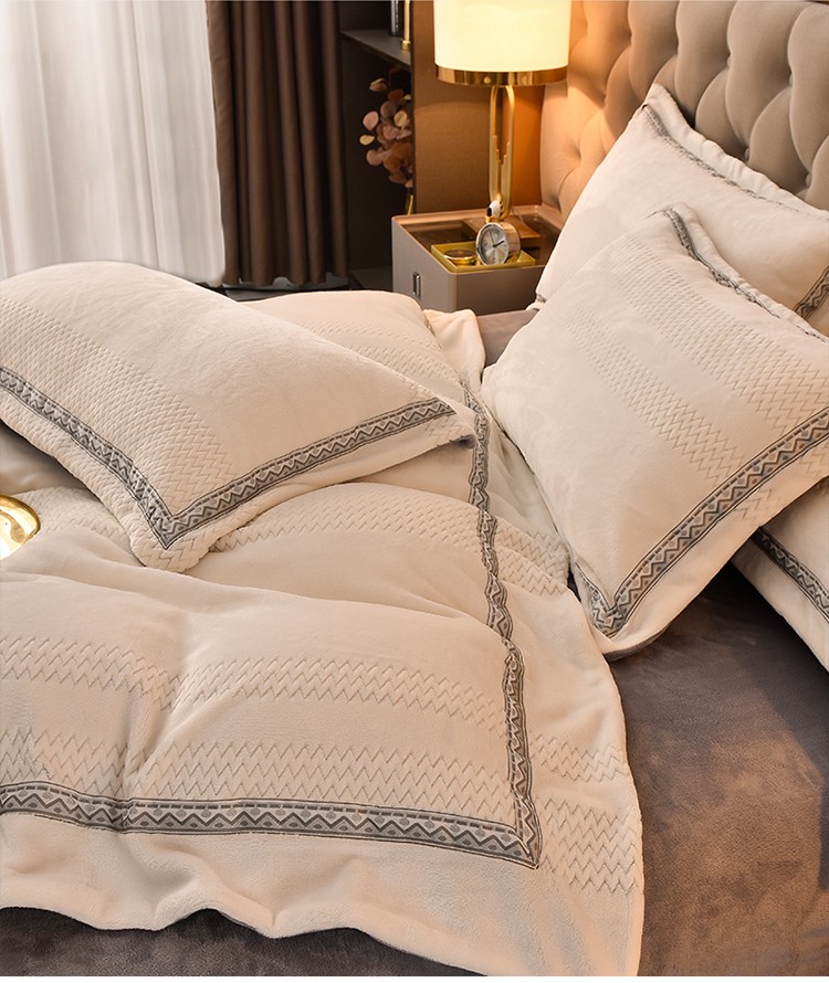 金莎浪 2022新款A类加厚牛奶绒提花四件套-凯利 凯利-米白