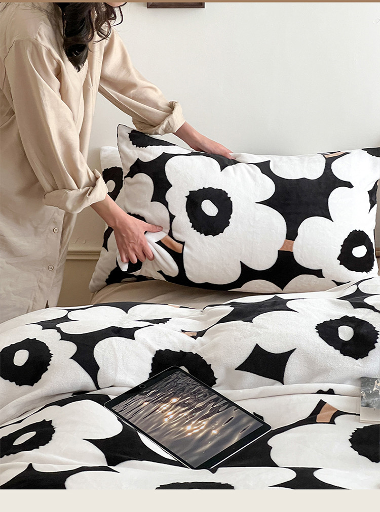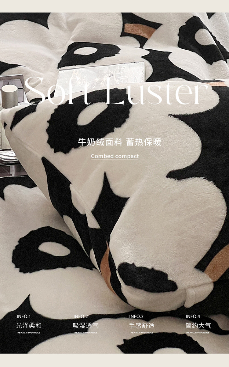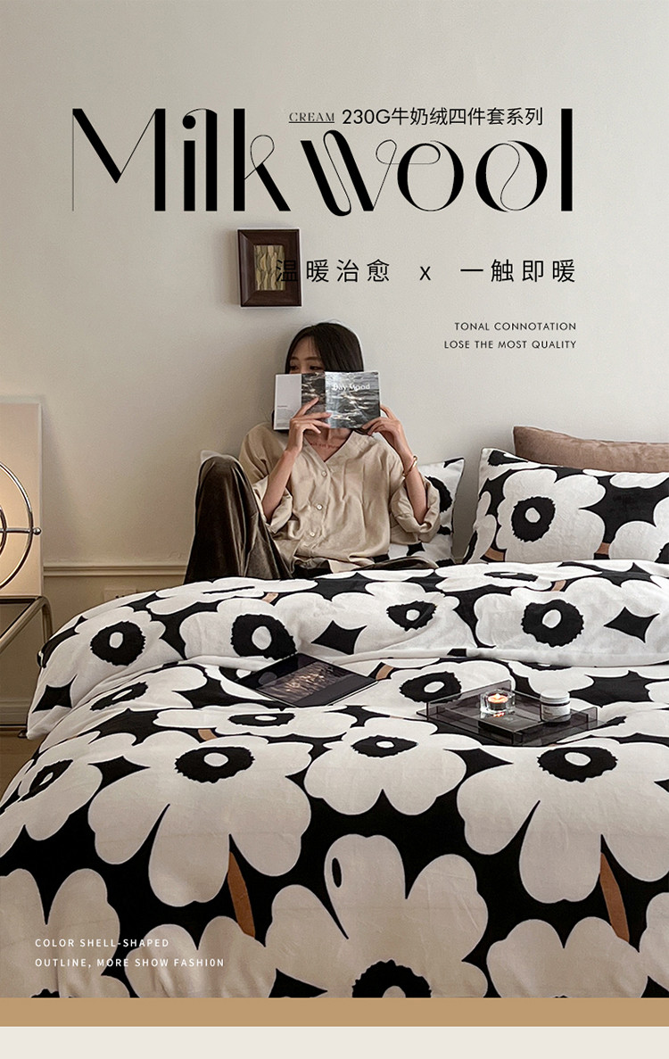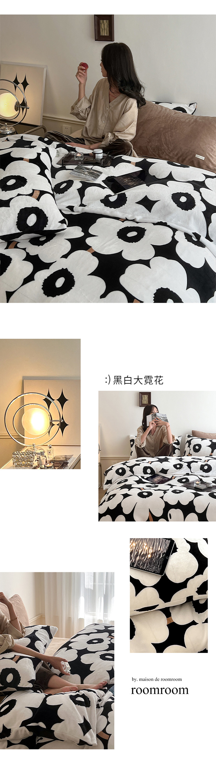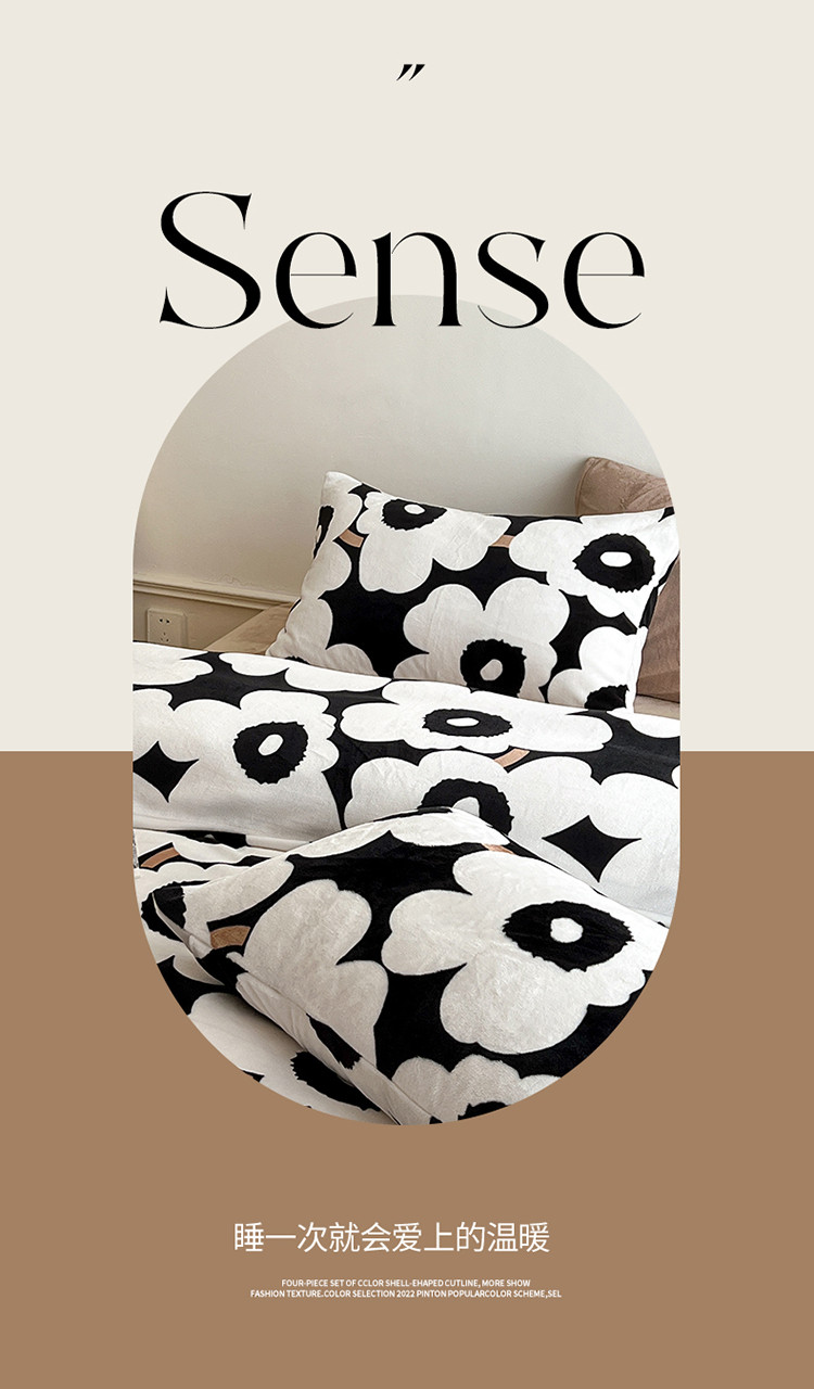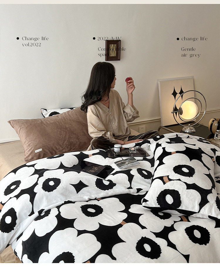 当前位置: 91家纺网 > 商品网购 > 床品套件 > 四件套 > 牛奶绒四件套 > 圆岛家纺 2022新款230克高克重牛奶绒保暖四件套 黑白大霓花