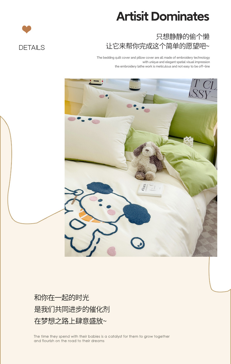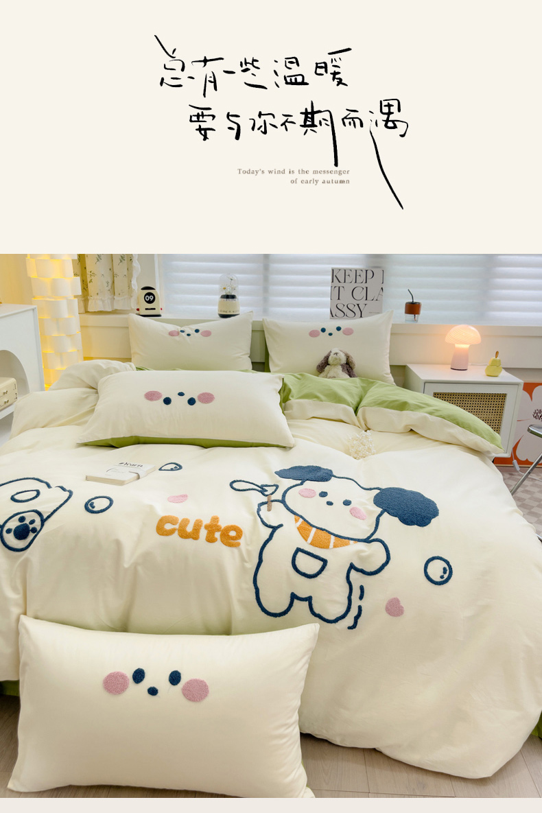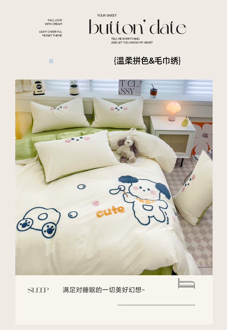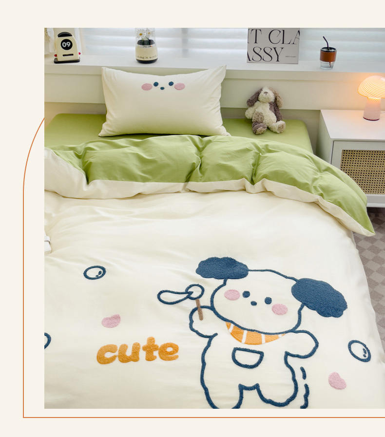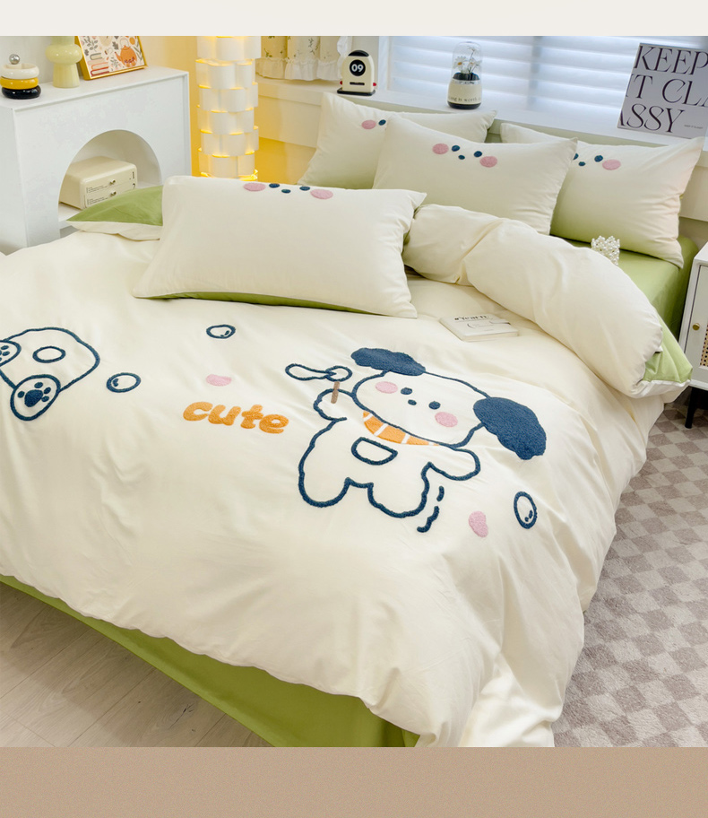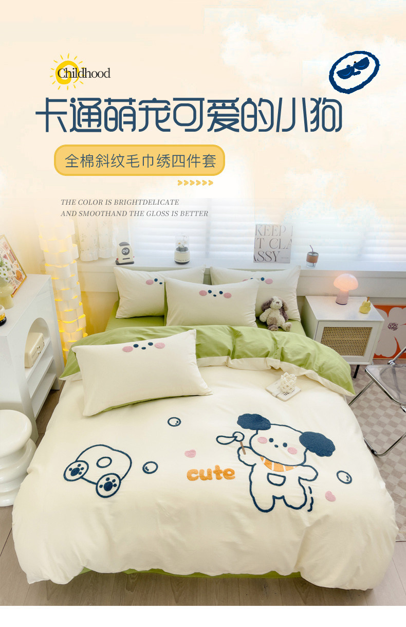 丽涵 2023新款全棉毛巾绣花卡通四件套三件套 小狗吹泡泡-绿色