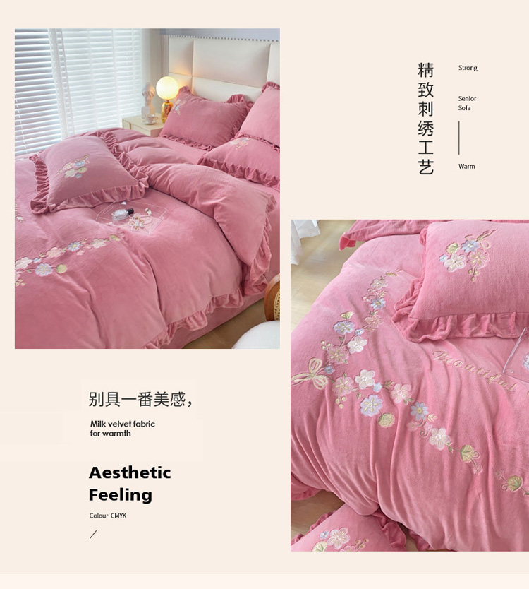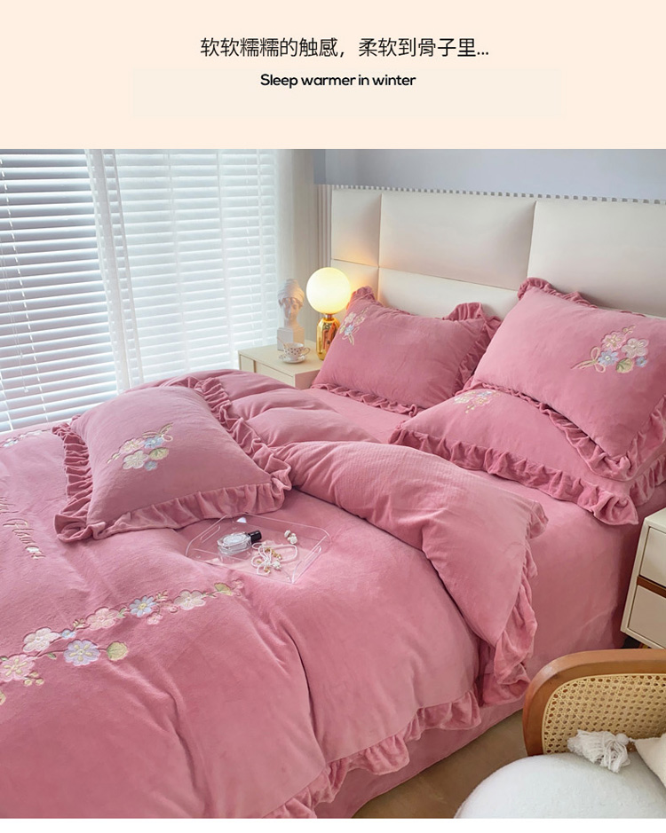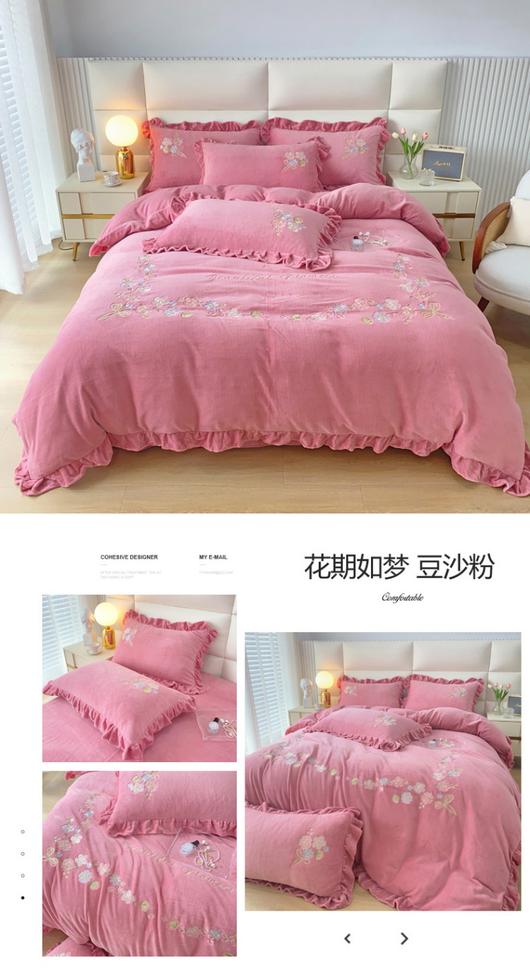 (总)星尚家纺 2024新款加厚保暖全消光牛奶绒夹棉床裙四件套-玫瑰之恋,粉玉,寐紫,浅蓝,水绿