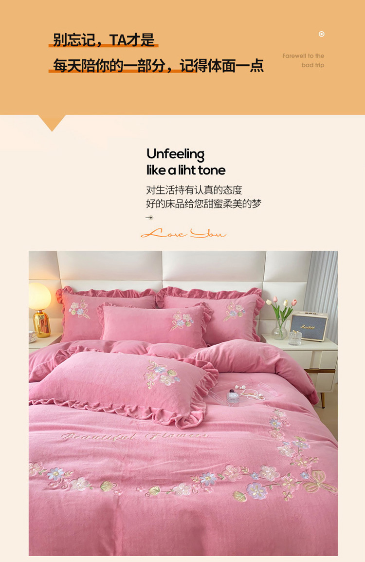 (总)星尚家纺 2024新款全消光A类230g牛奶绒韩版绣花绒四件套-绚丽花语,豆沙粉,浪漫紫,雾霾蓝,樱花粉,晨雾绿