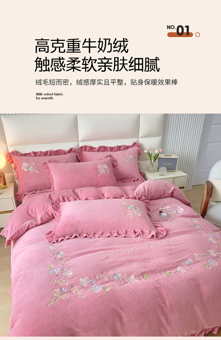 (总)星尚家纺 2024新款全消光230g牛奶绒刺绣保暖四件套-花漾,晨雾绿,豆沙粉,樱花粉