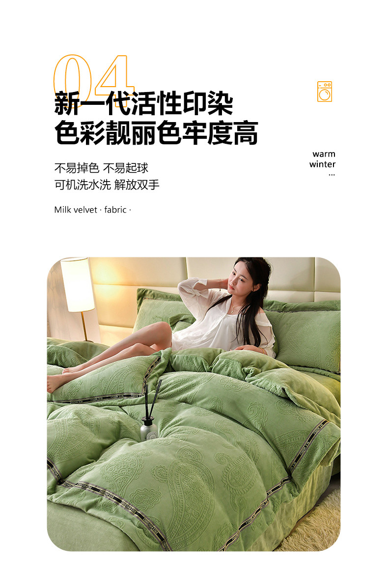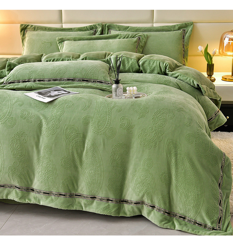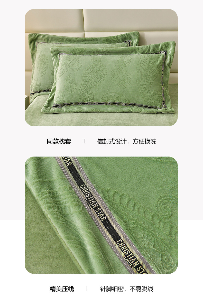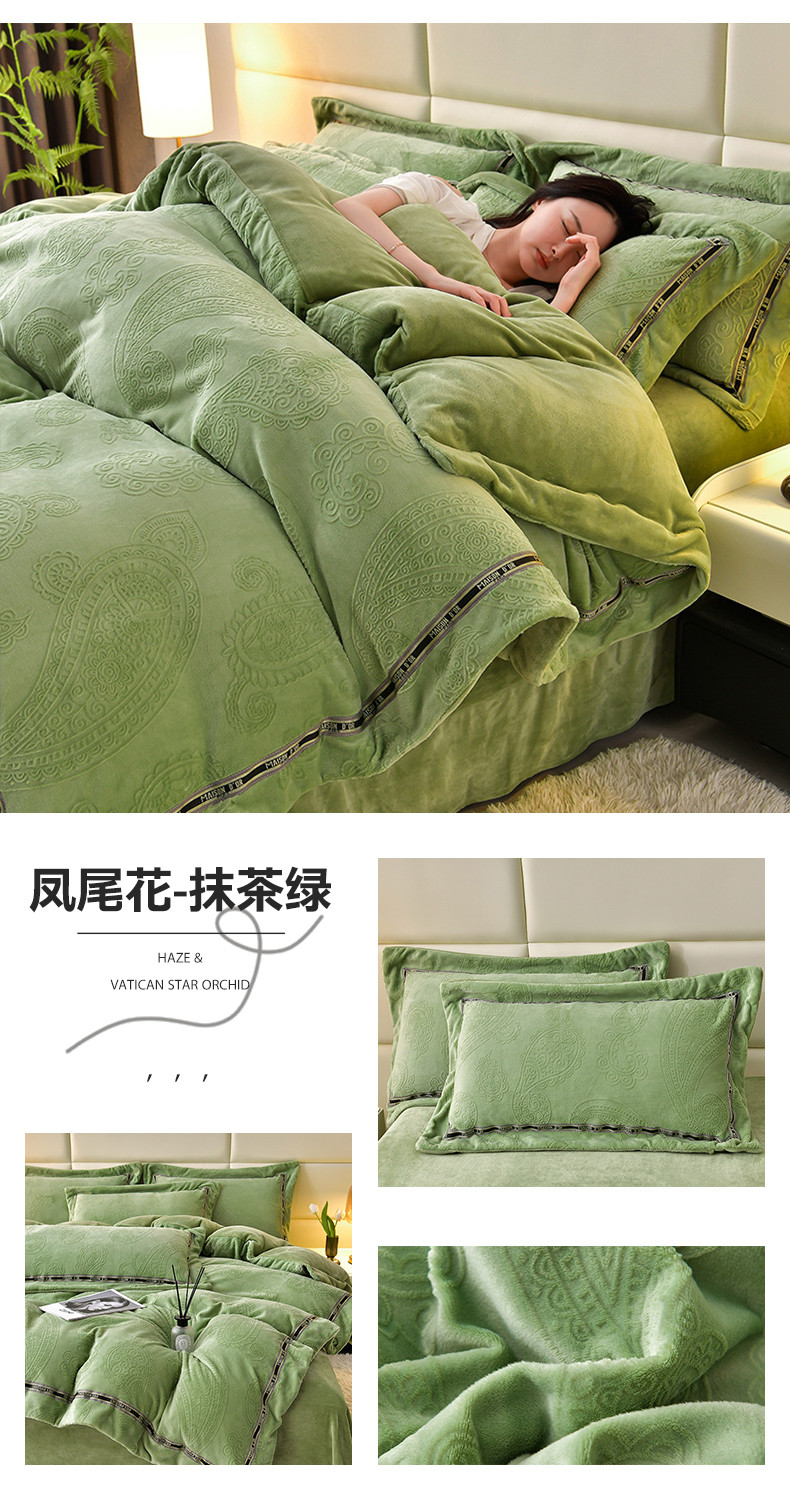 商品名称:妮恒美 2023新款牛奶绒雕花压线款四件套 凤尾花-抹茶绿