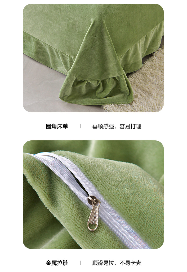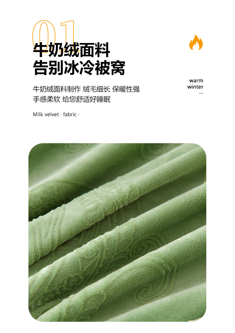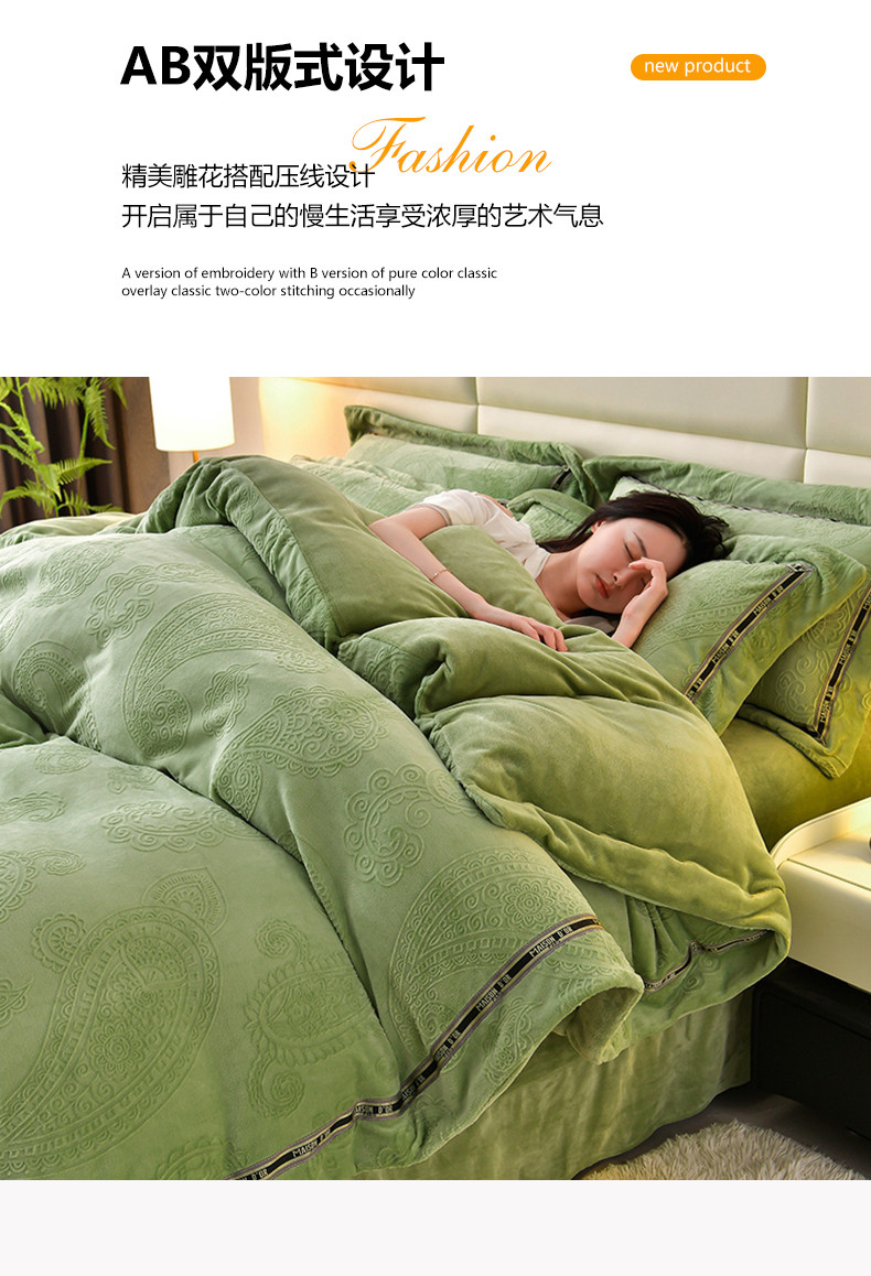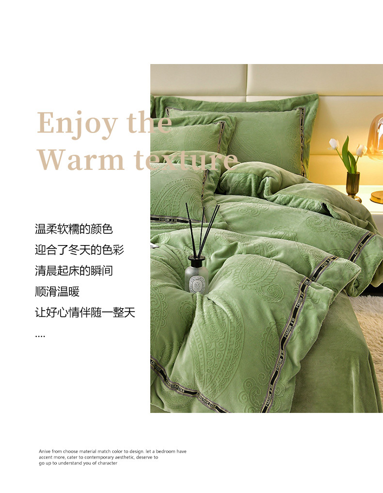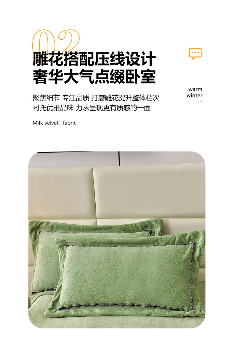 商品名称:妮恒美 2023新款牛奶绒雕花压线款四件套 凤尾花-抹茶绿