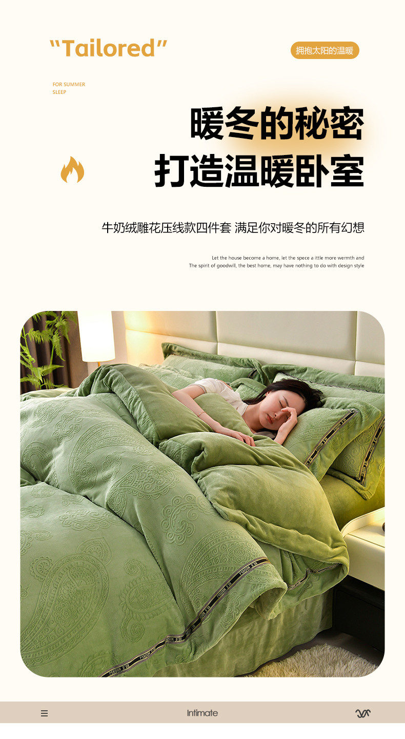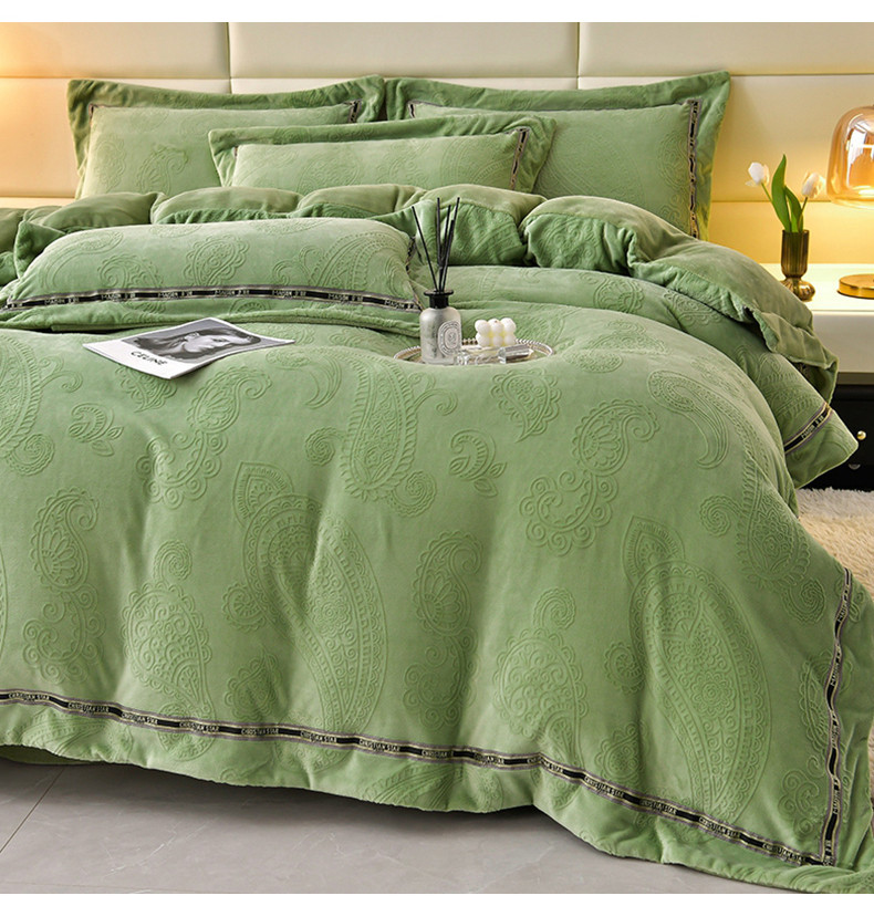 妮恒美 2023新款牛奶绒雕花压线款四件套 凤尾花-抹茶绿