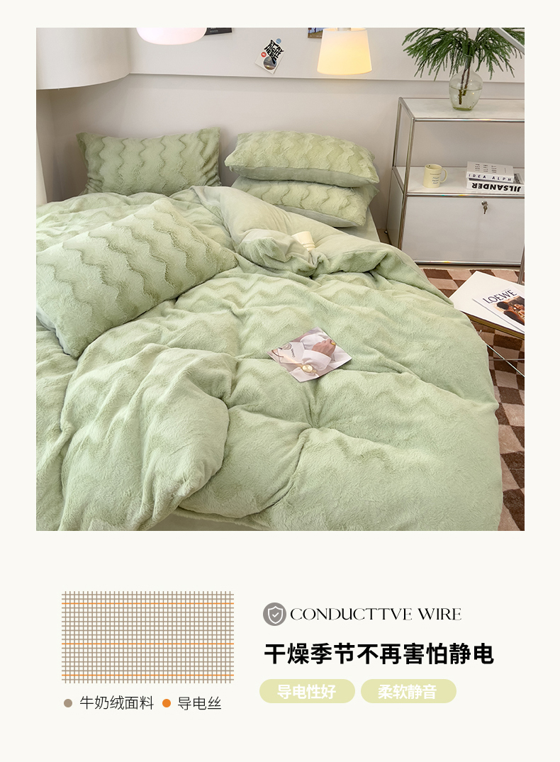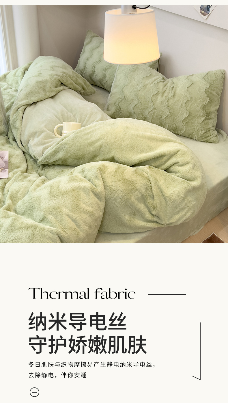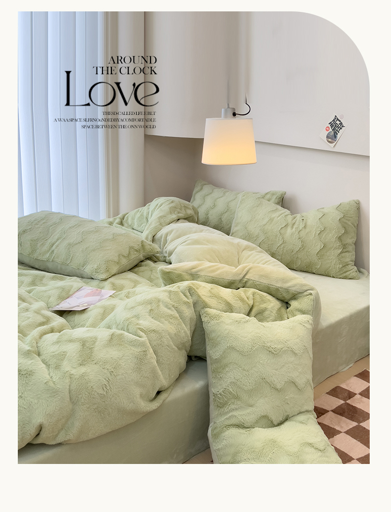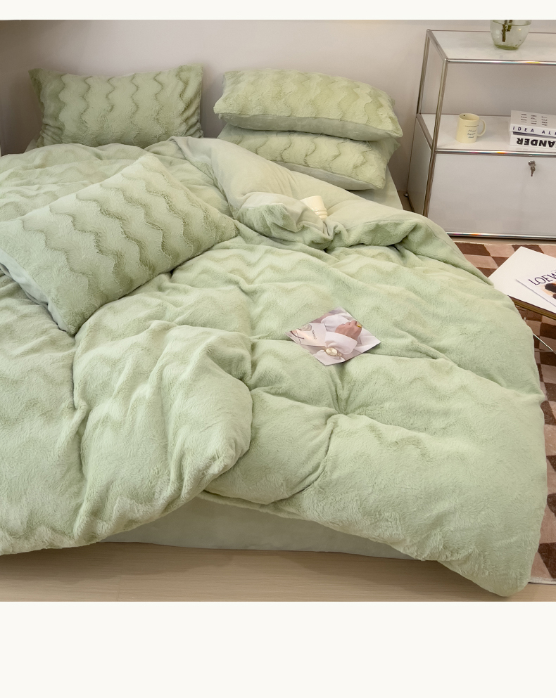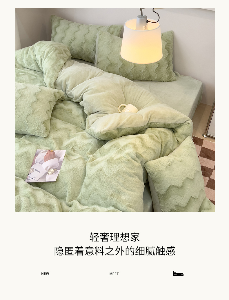 当前位置: 91家纺网 > 商品网购 > 床品套件 > 四件套 > 牛奶绒四件套 > 韩都 2023新款直播爆款320克A类波浪兔毛绒立体剪花纯色牛奶绒四件套-暖冬 暖冬-清新绿