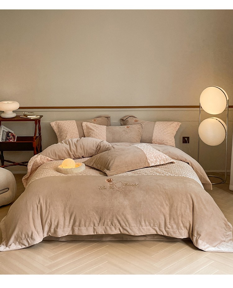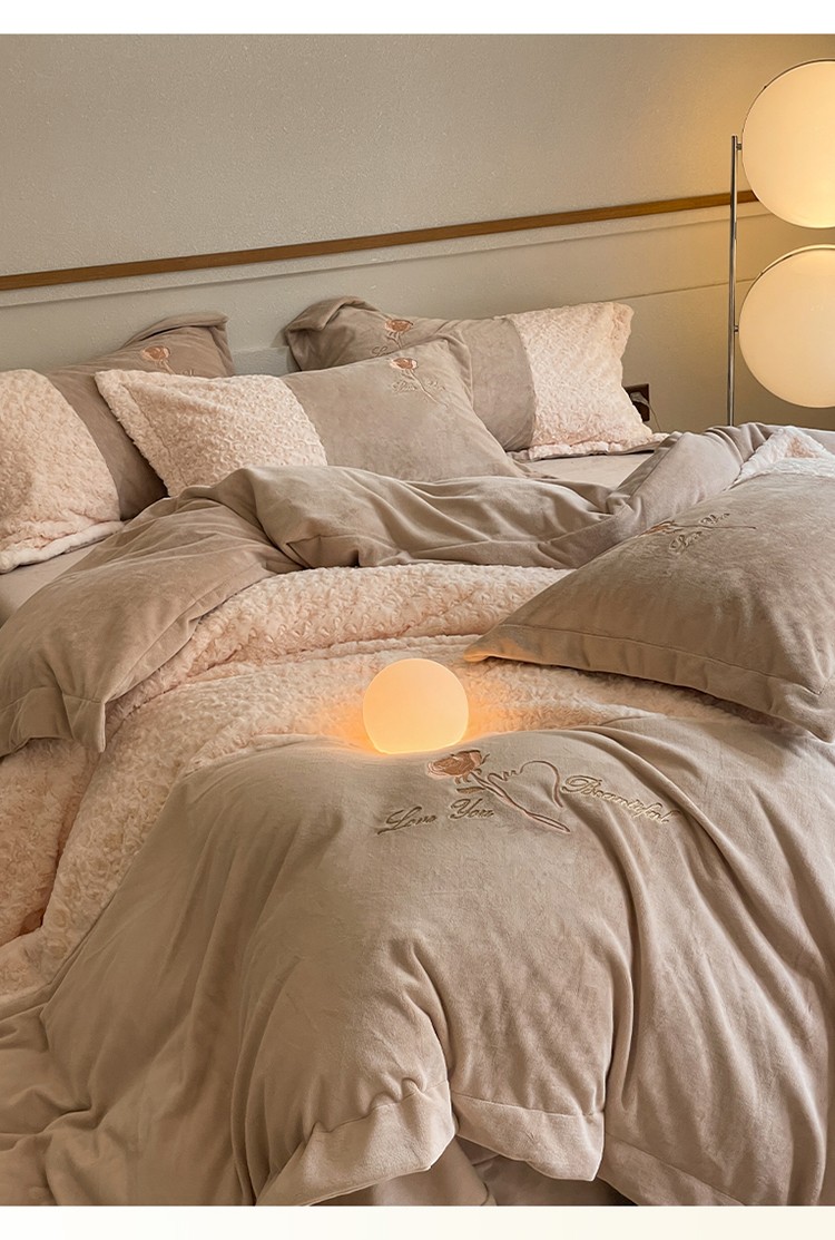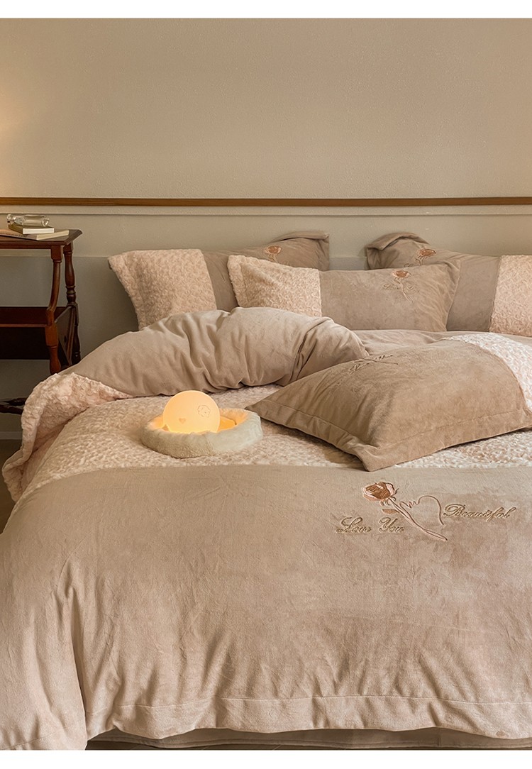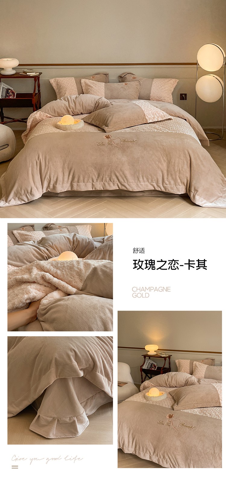 嗯呢23新款高克重双拼兔毛绒牛奶绒保暖刺绣绒四件套 玫瑰之恋-卡其