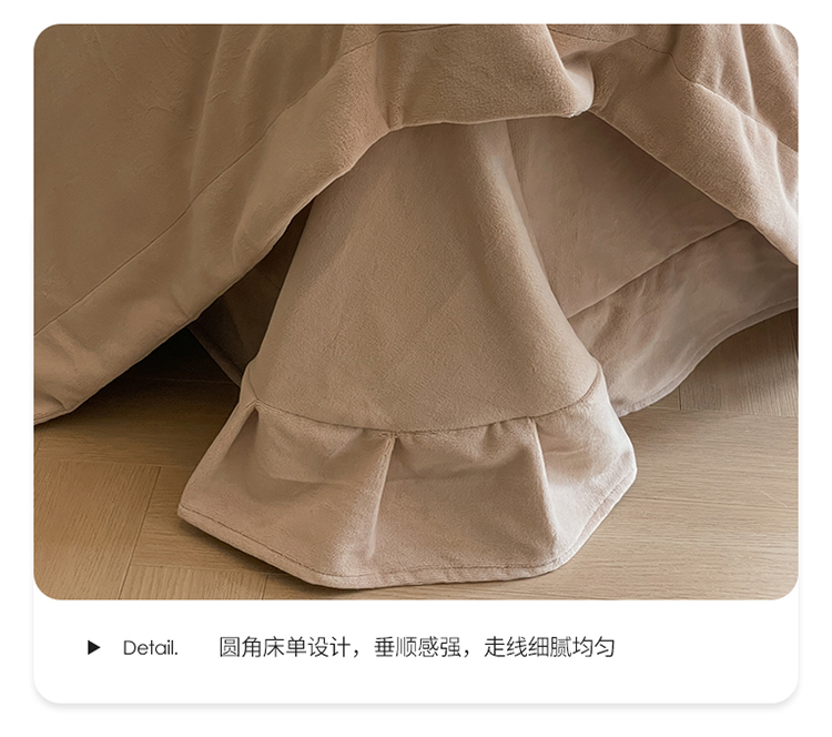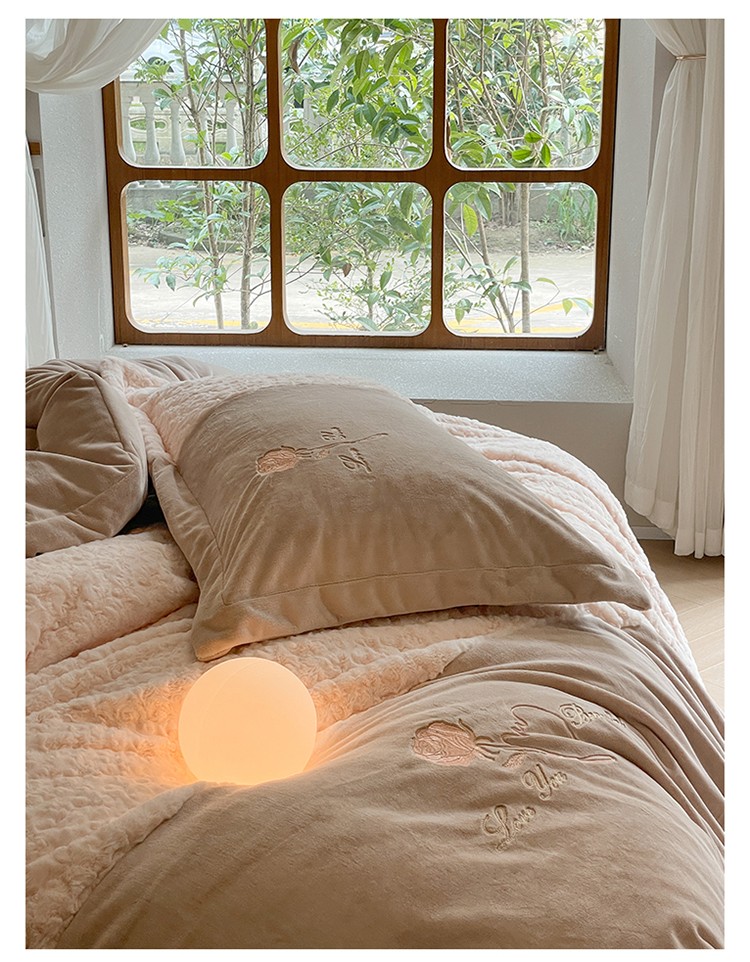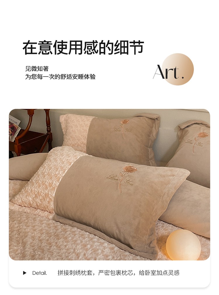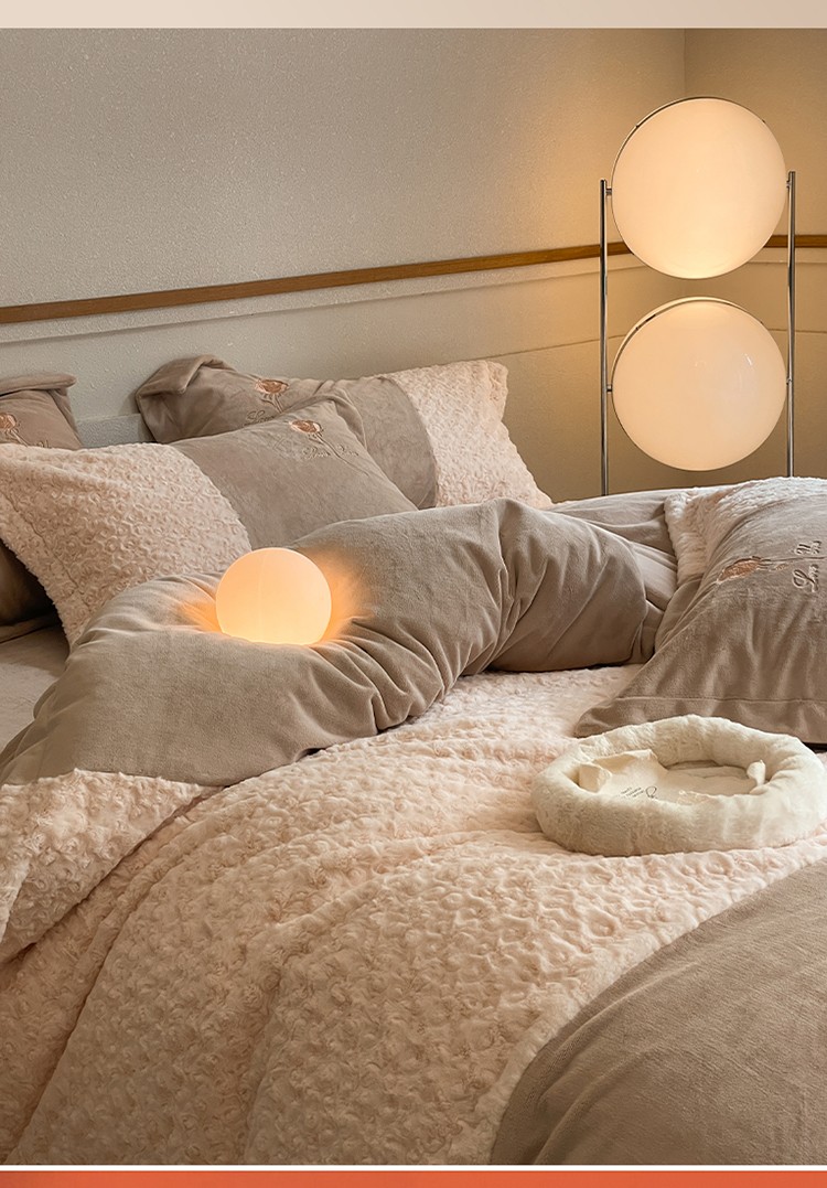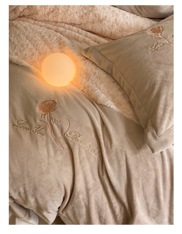嗯呢23新款高克重双拼兔毛绒牛奶绒保暖刺绣绒四件套 玫瑰之恋-卡其