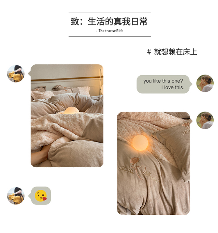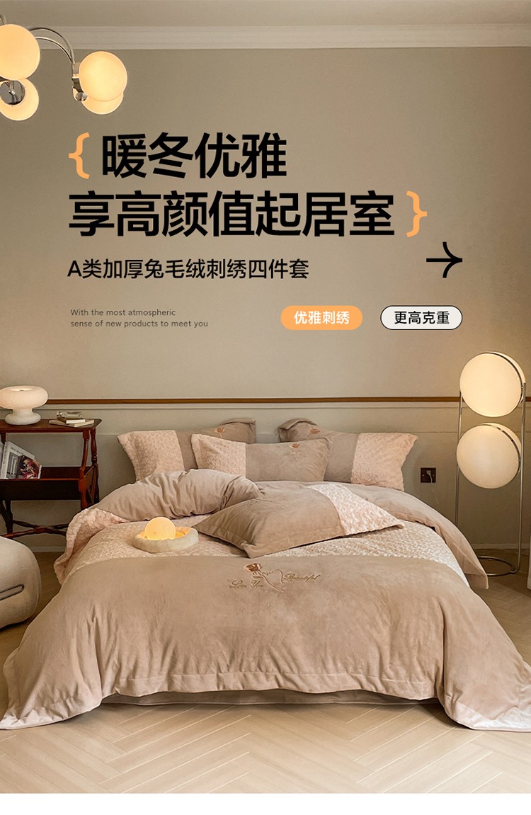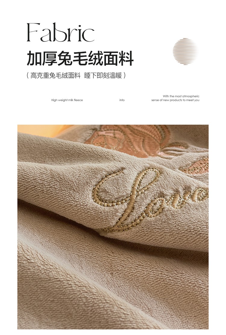 商品名称:嗯呢23新款高克重双拼兔毛绒牛奶绒保暖刺绣绒四件套 玫瑰之恋-卡其