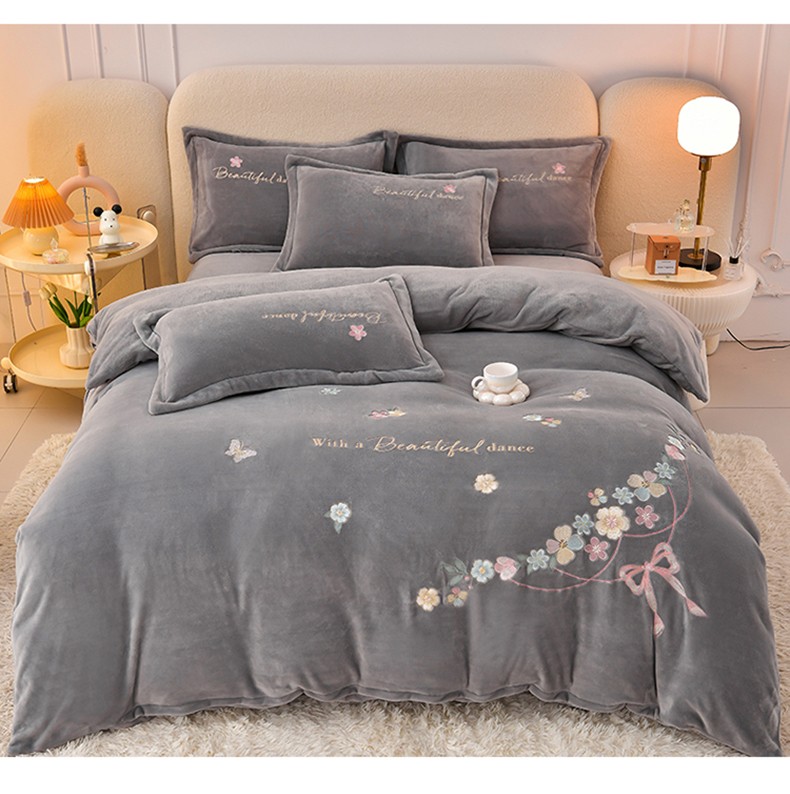 畅畅家纺 2023高克重牛奶绒刺绣花四件套金貂法莱宝宝水晶雪花绒四件套 花海 -高级灰