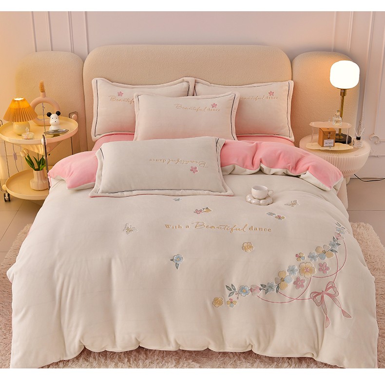 畅畅家纺 2023高克重牛奶绒刺绣花四件套金貂法莱宝宝水晶雪花绒四件套 花海-奶白+粉