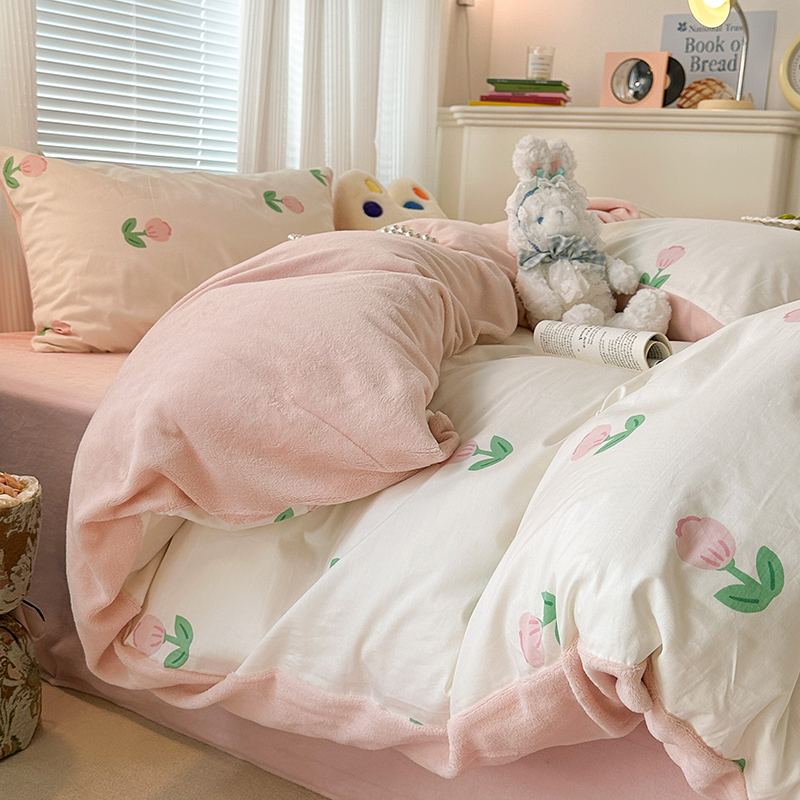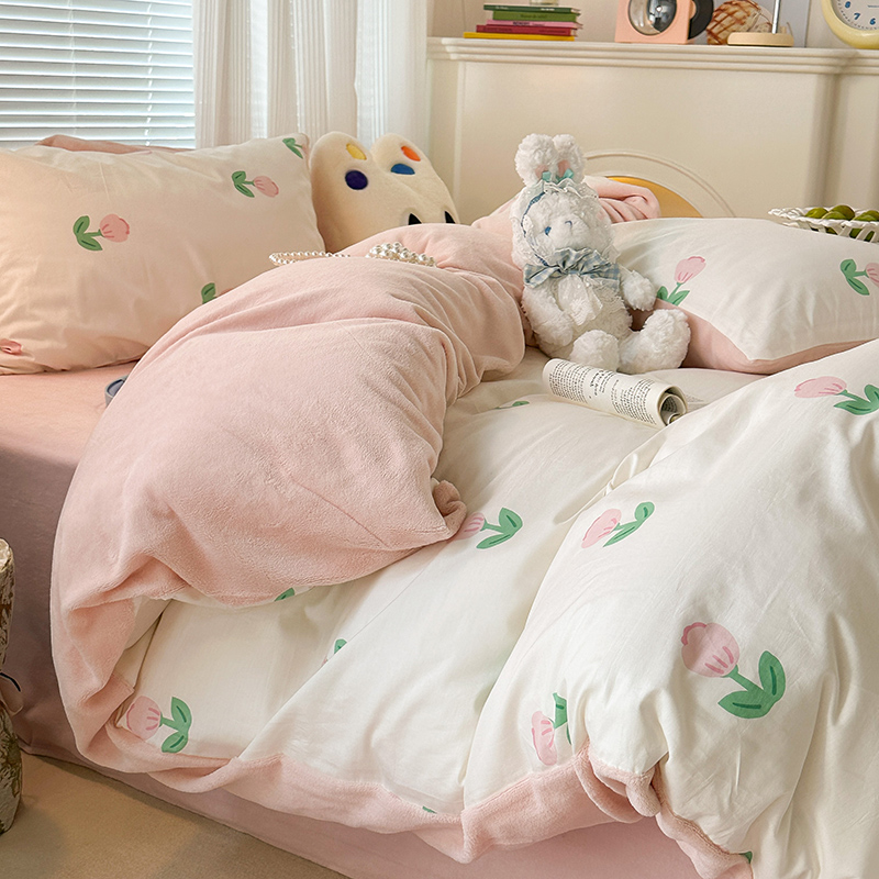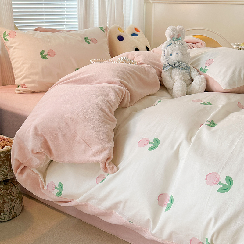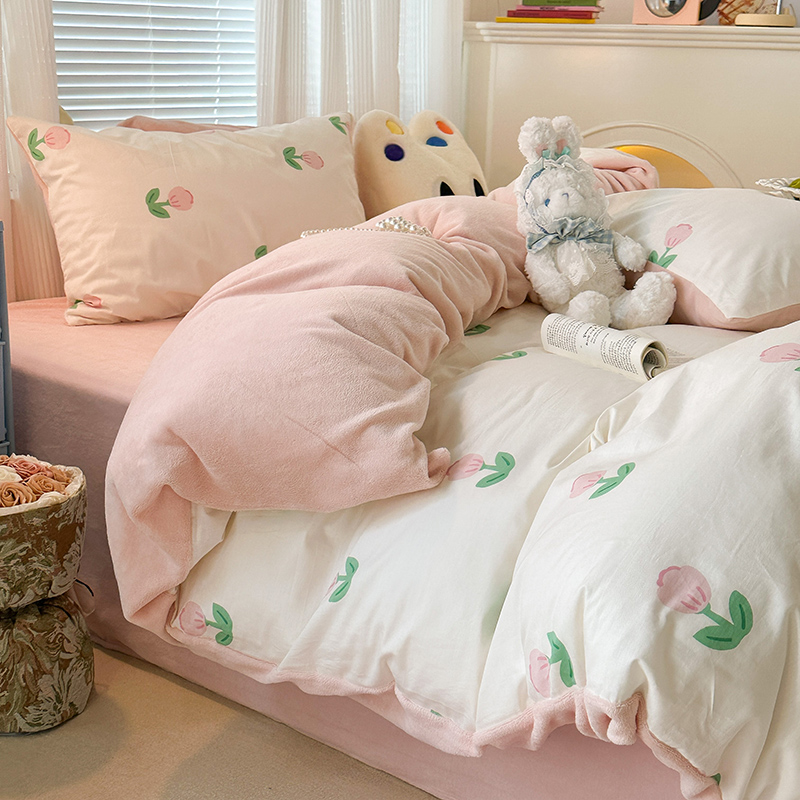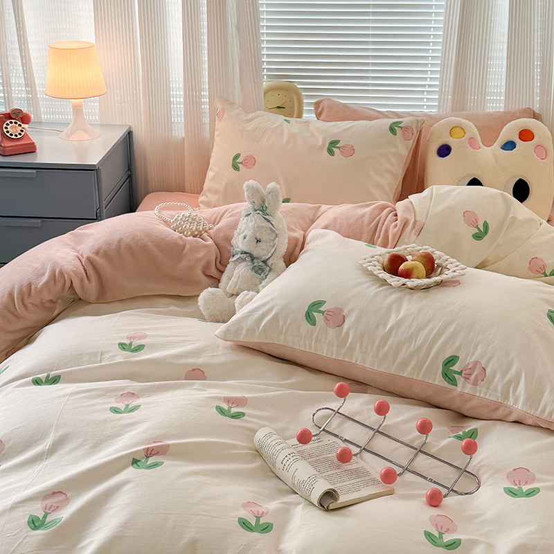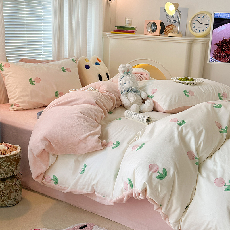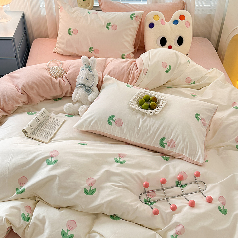 昔可家纺 2023新款y2k卡通印花系列棉加绒四件套 粉嫩小郁金
