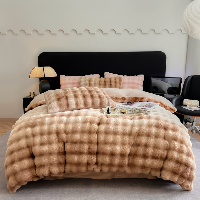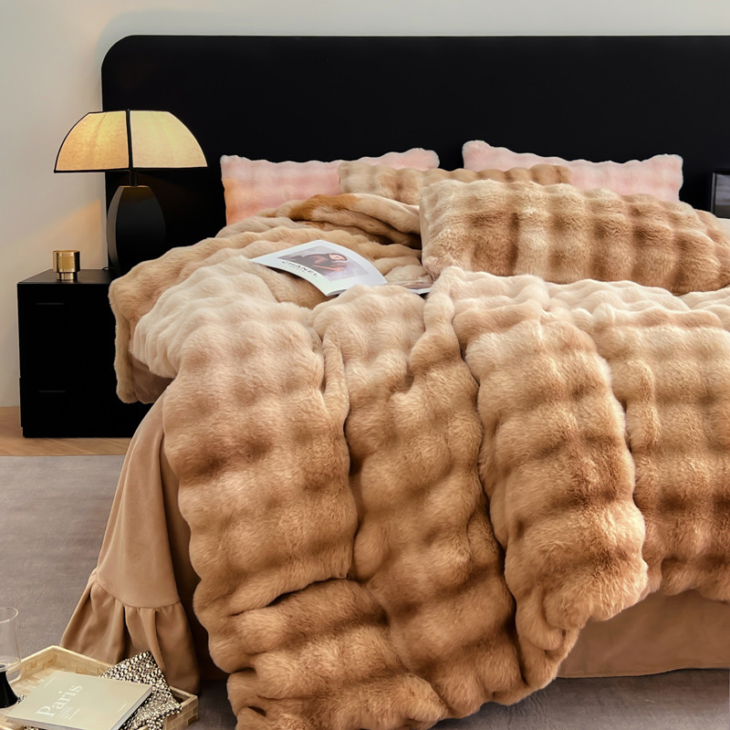 商品名称:满座家居 2025新款秋冬爆款七彩大泡泡兔兔绒兔毛绒牛奶绒四件套 七彩咖