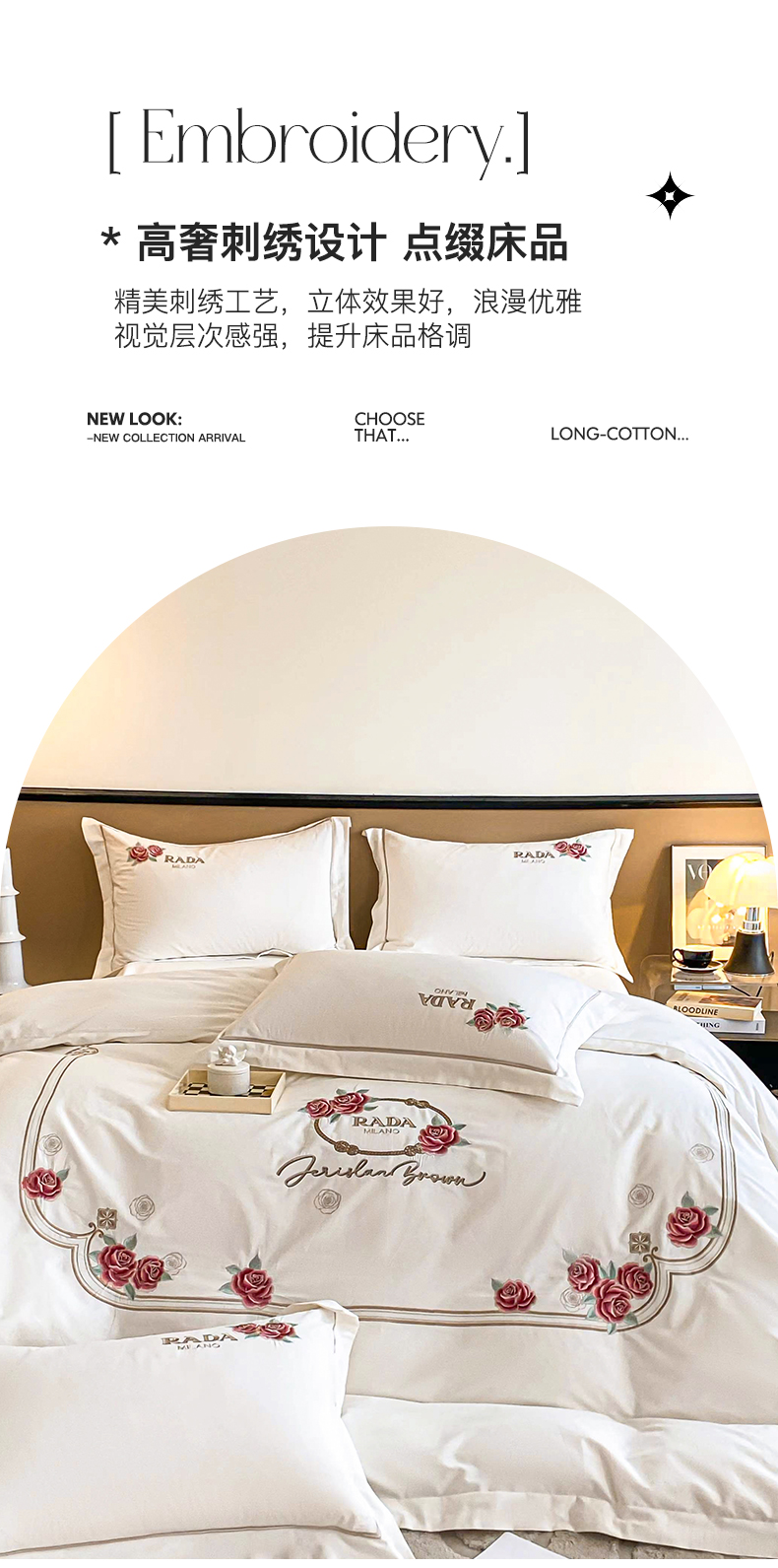 理想家家纺 2023新款全棉磨毛刺绣四件套 玫瑰庄园 白