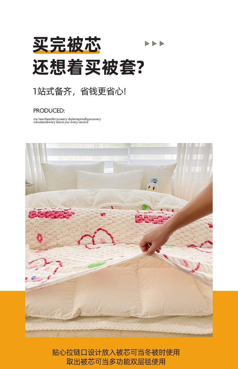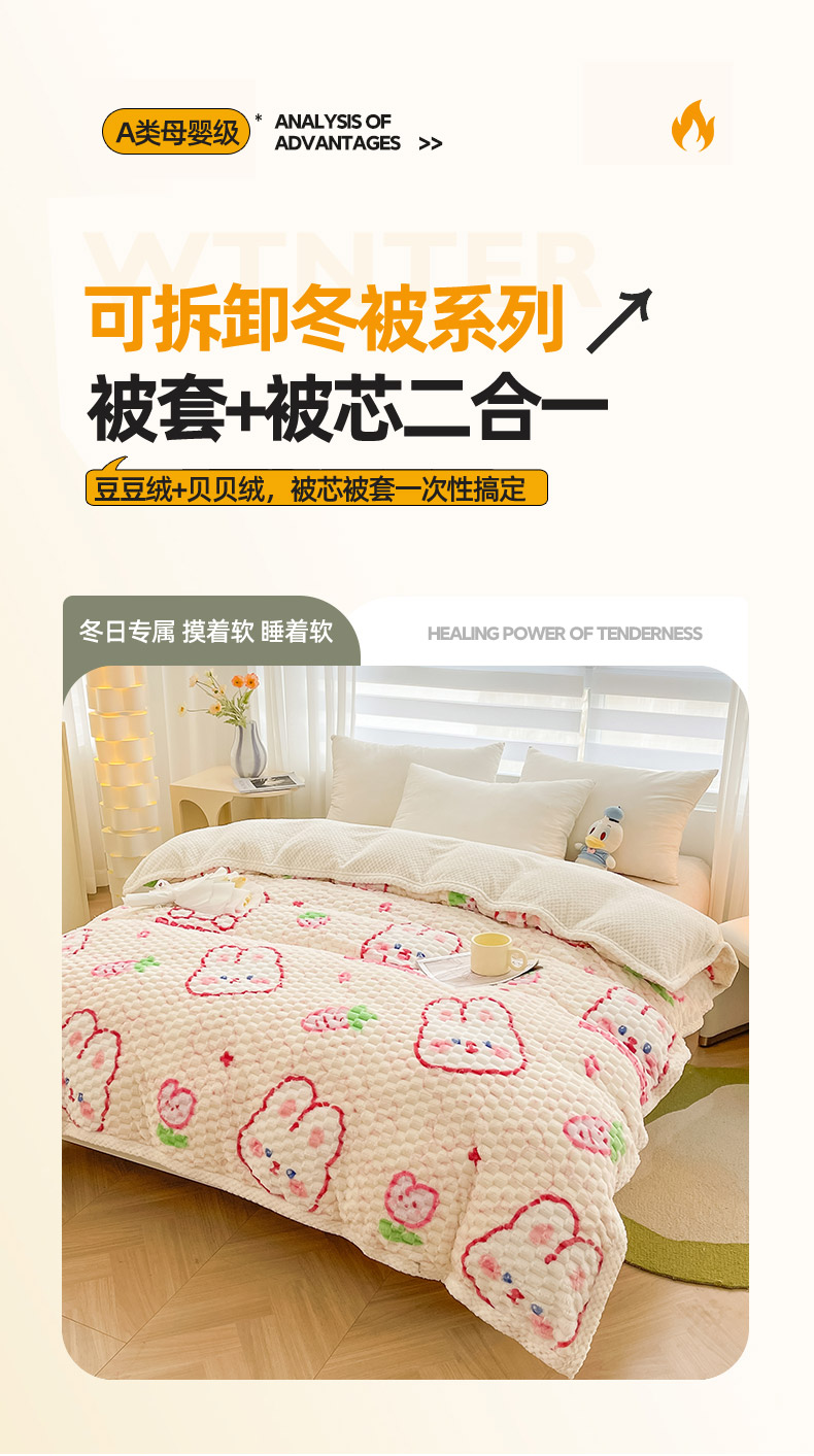 (总)熙宴家纺 2025新款可拆卸冬被被套+被芯二合一可拆洗豆豆绒棉花被子被芯,爱心兔,草绿,大脚熊,粉朵朵花,粉色,欢乐兔,卡其,奶昔白,幸运花,紫花瓣