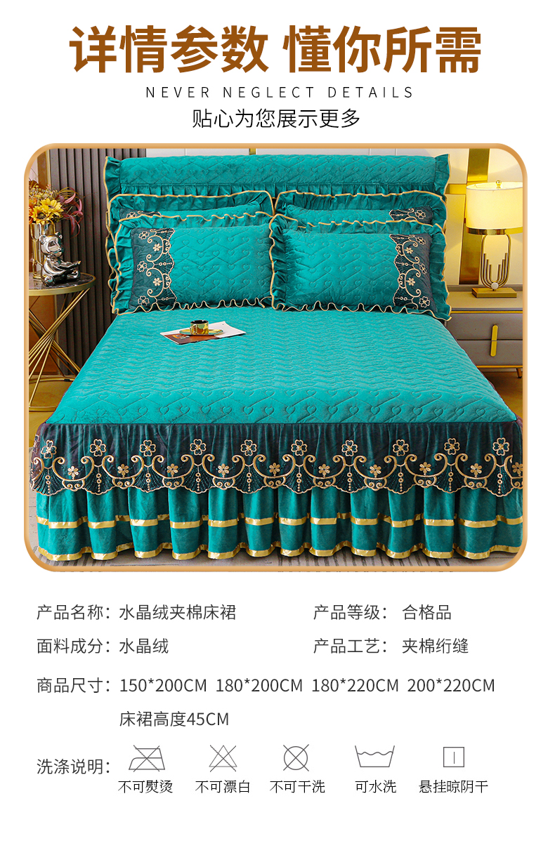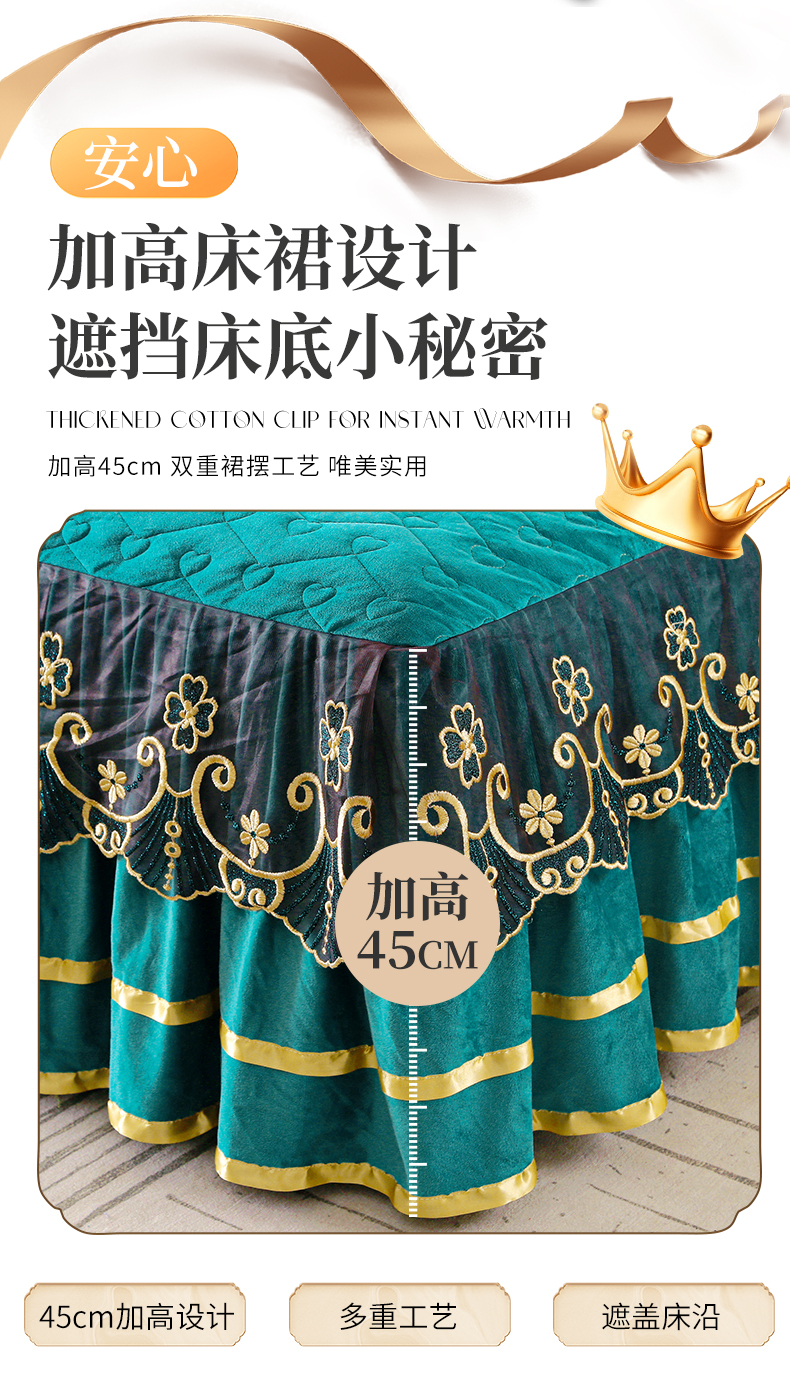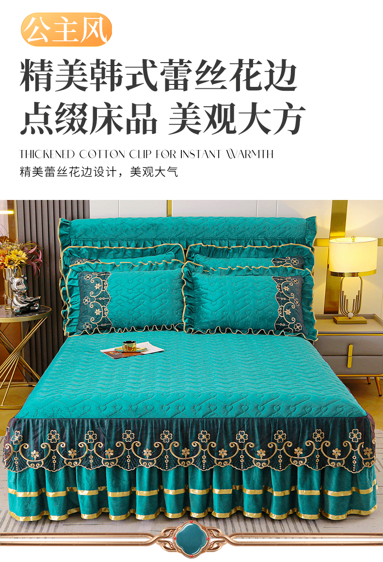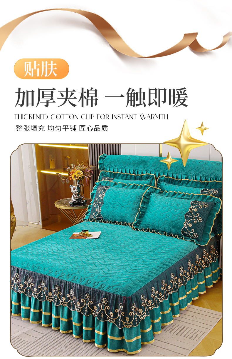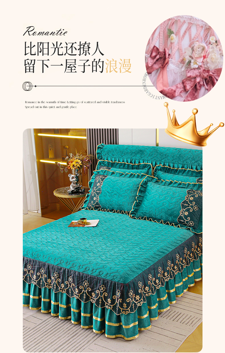 (总)屹成家纺2025新款水晶绒夹棉绗缝蕾丝床裙三件套(塞纳河畔)床裙单件起售价不低于105元,大红,豆沙,翡翠绿,粉玉,橄榄绿,蔚蓝,银灰