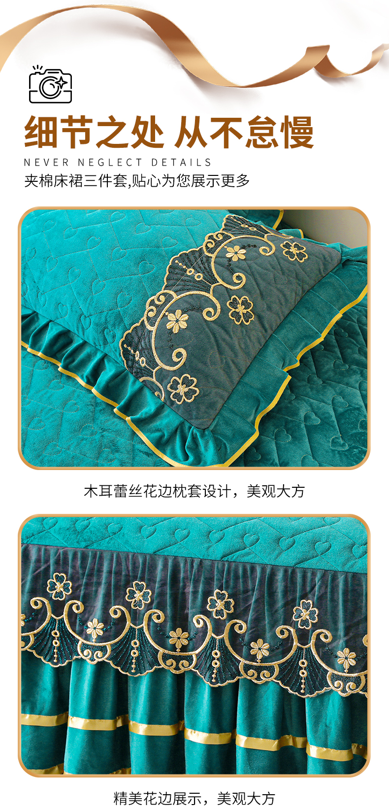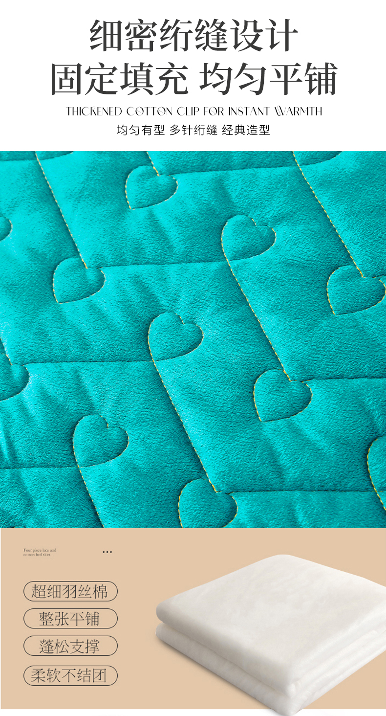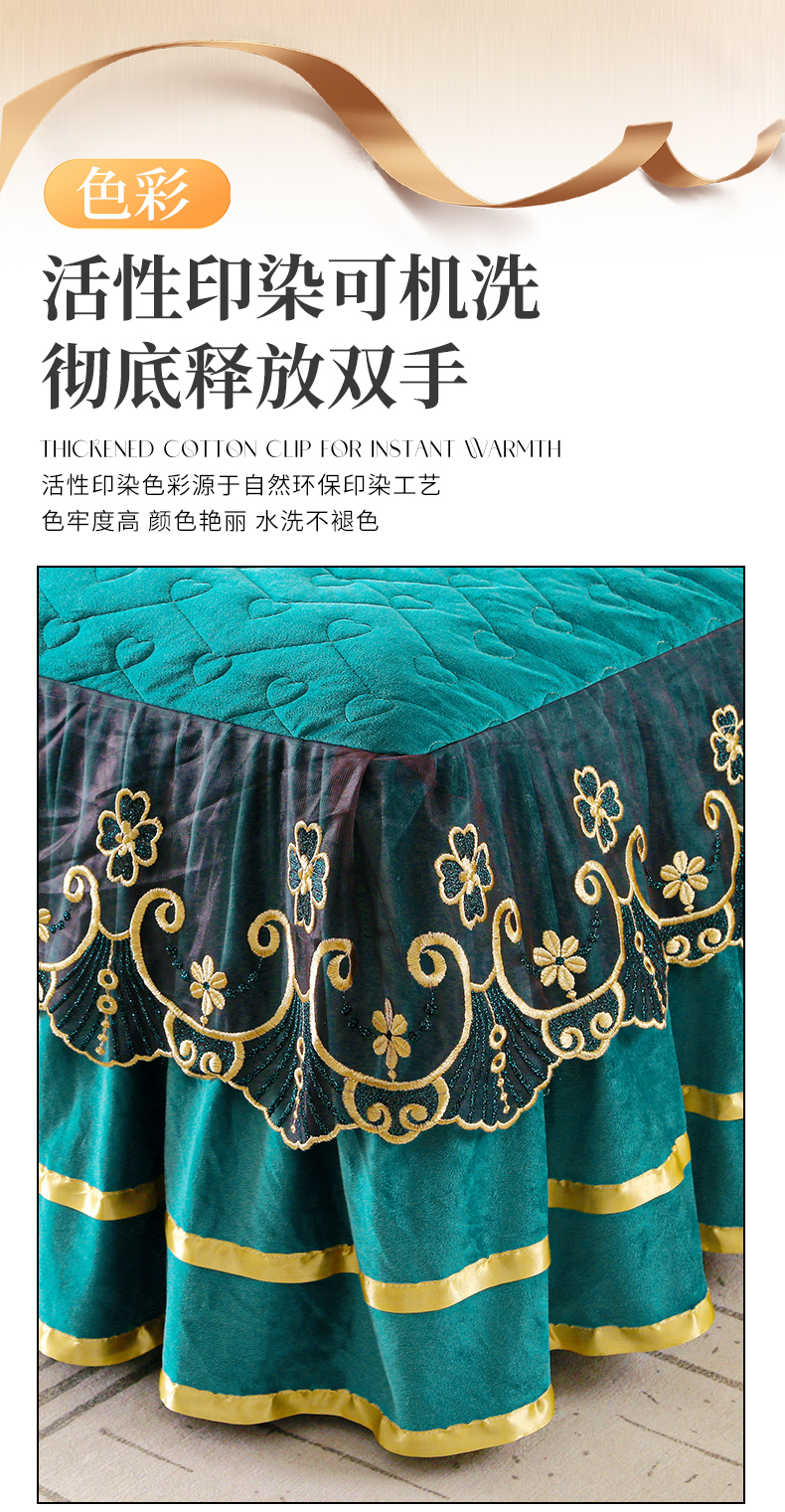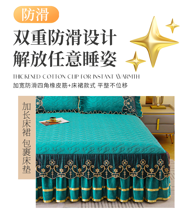 (总)屹成家纺2025新款水晶绒夹棉绗缝蕾丝床裙三件套(塞纳河畔)床裙单件起售价不低于105元,大红,豆沙,翡翠绿,粉玉,橄榄绿,蔚蓝,银灰
