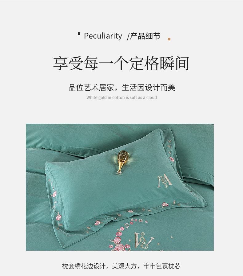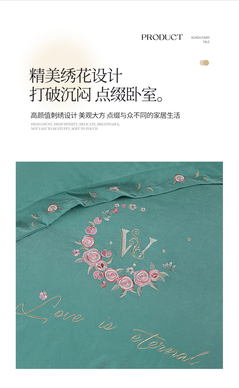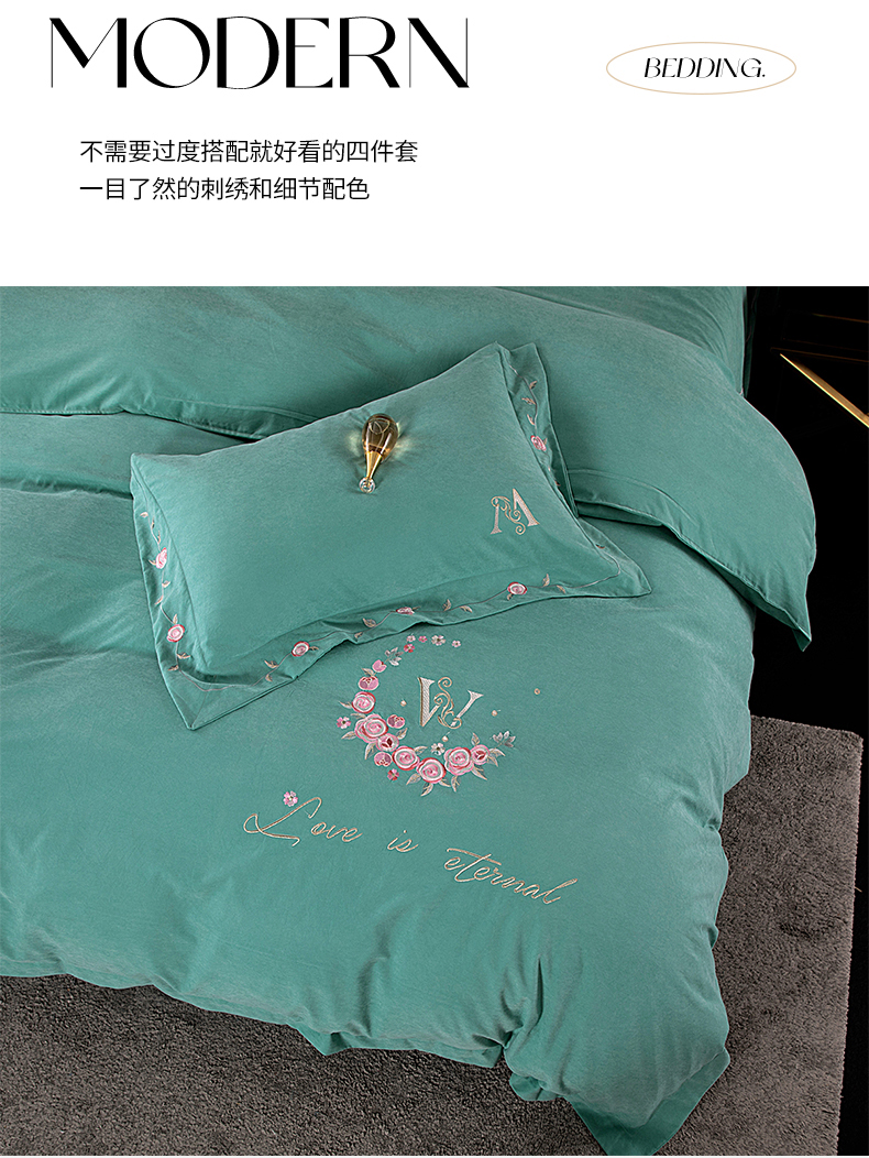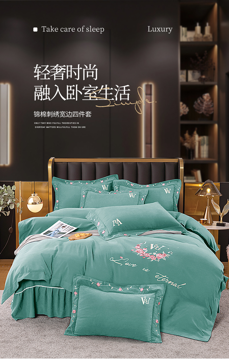 商品名称:伊而梦 2023新款锦棉宽边绣花四件套--浪漫情缘 浪漫情缘-青碧色