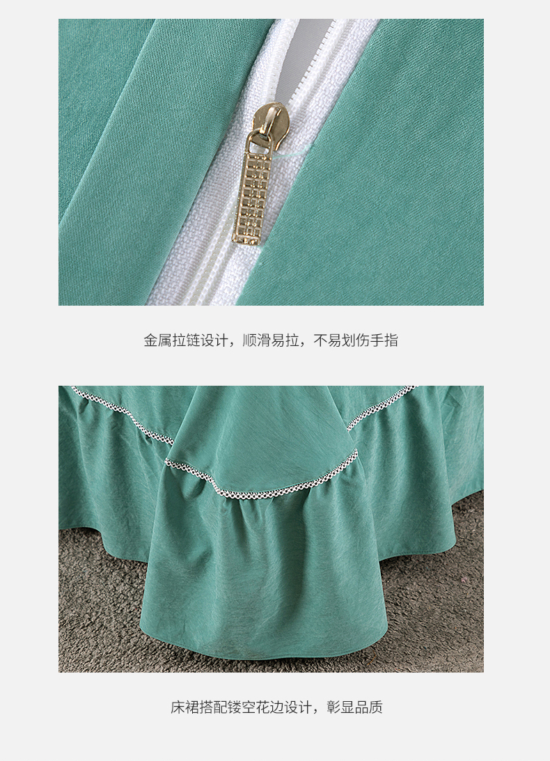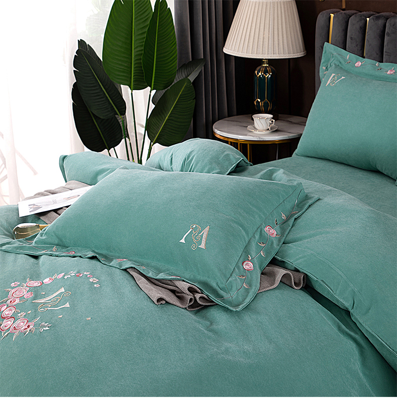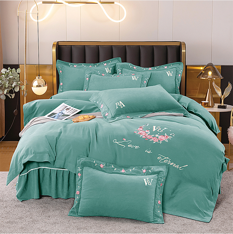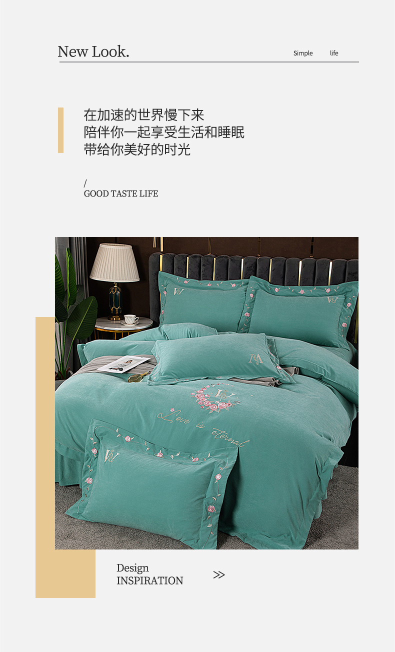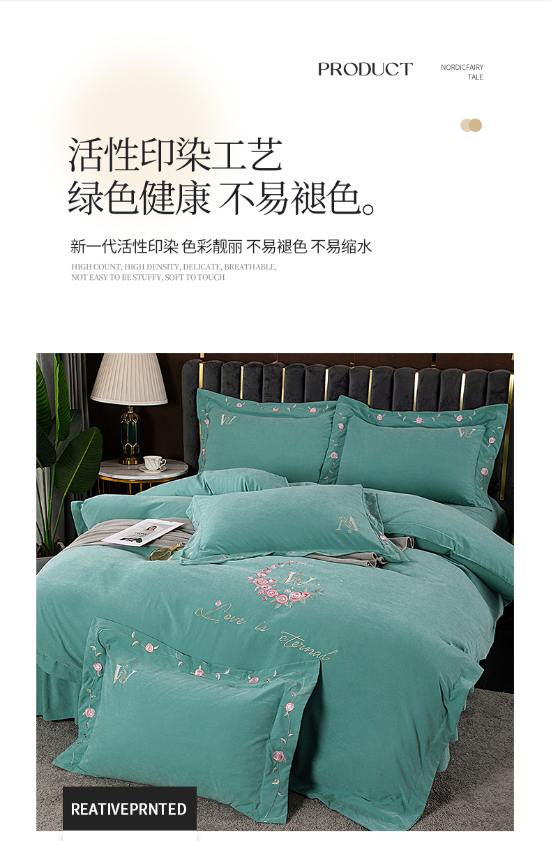 商品名称:伊而梦 2023新款锦棉宽边绣花四件套--浪漫情缘 浪漫情缘-青碧色