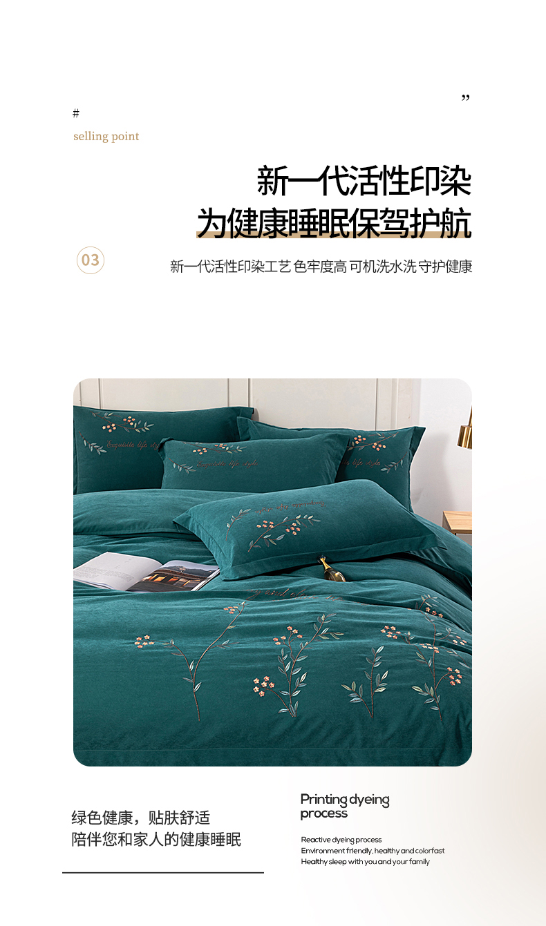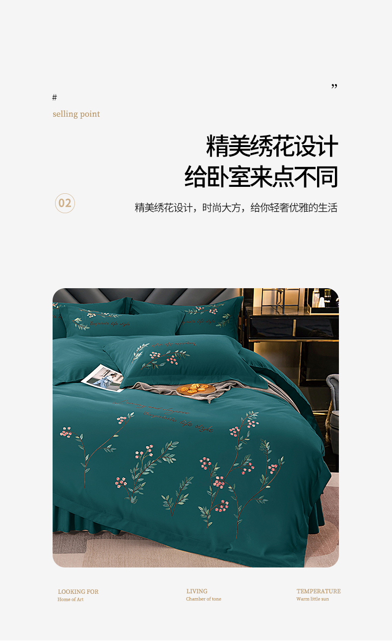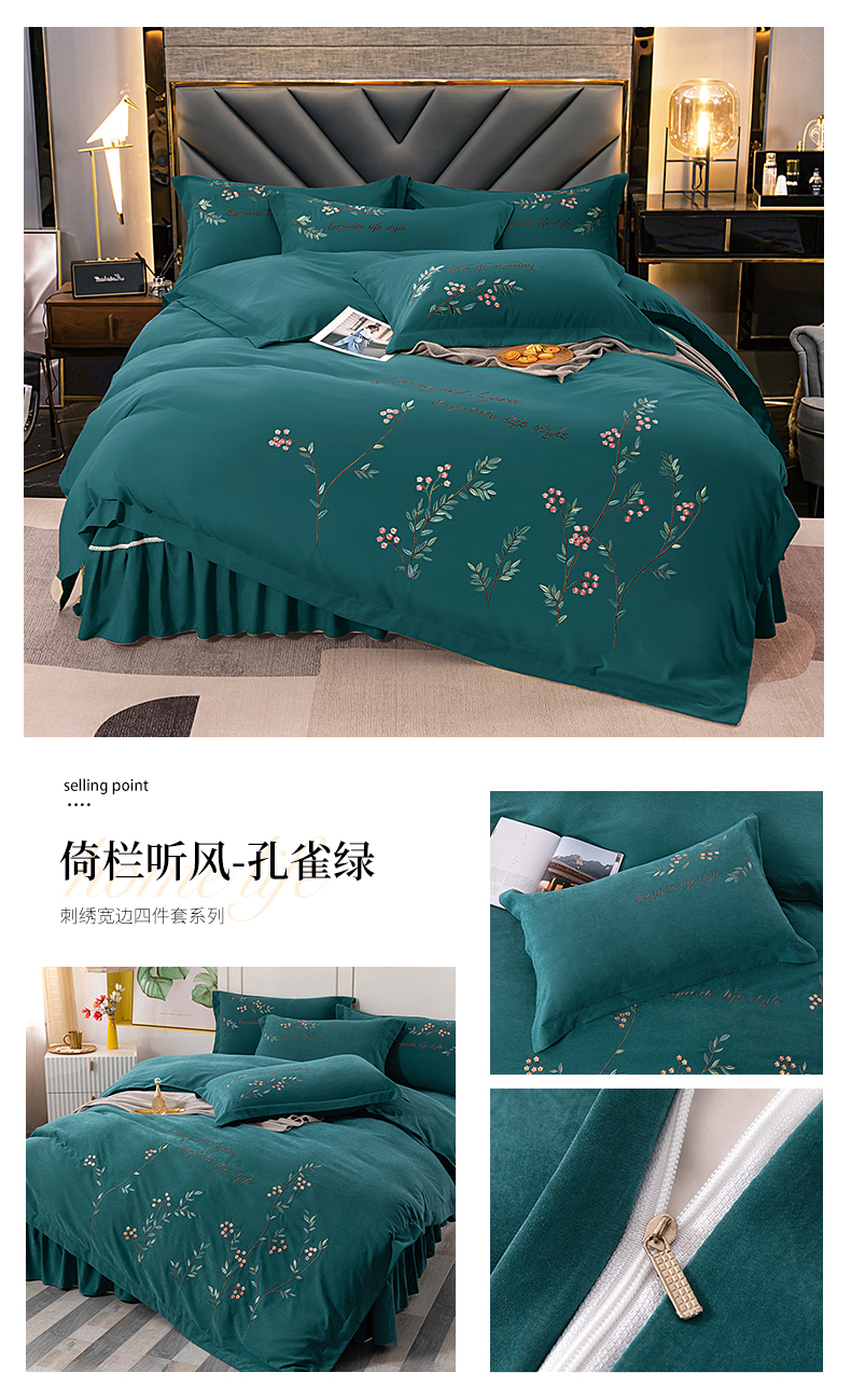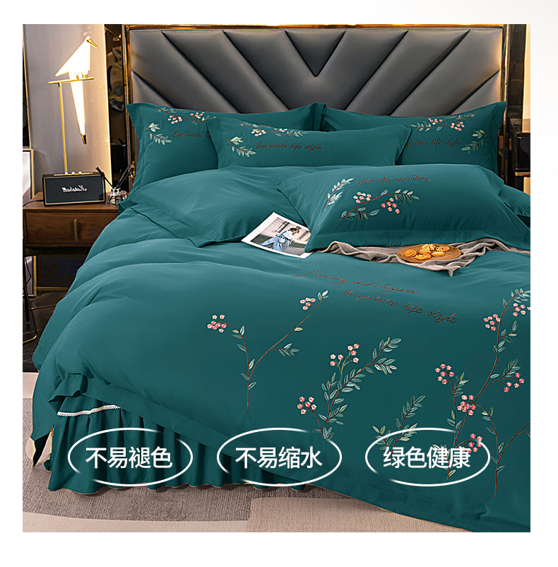 商品名称:伊而梦 2023新款锦棉宽边绣花四件套--倚栏听风 倚栏听风-孔雀绿