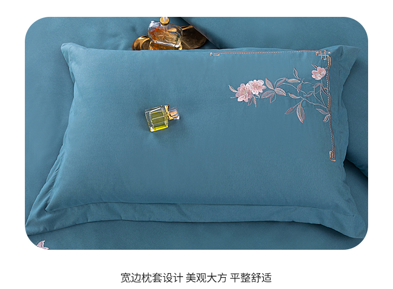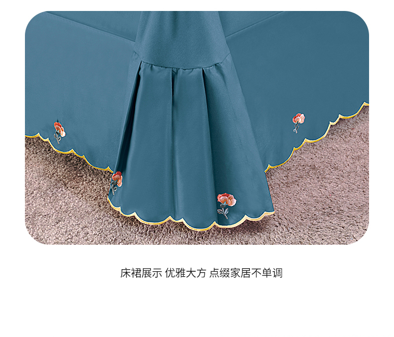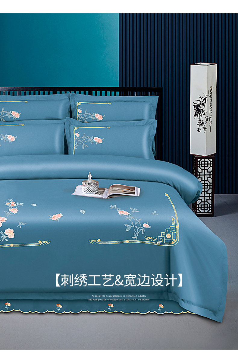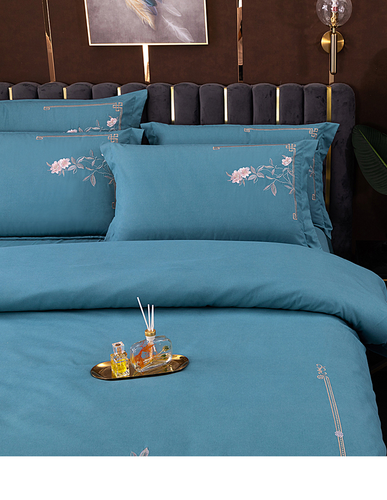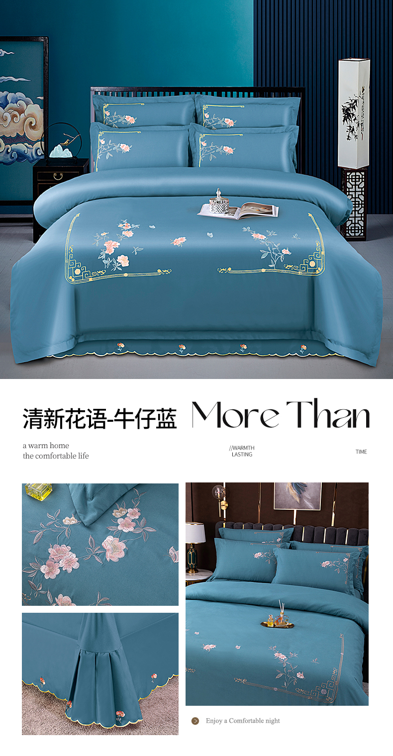 商品名称:伊而梦 2023新款精纺磨毛重工刺绣四件套--清心花语 清新花语-牛仔蓝