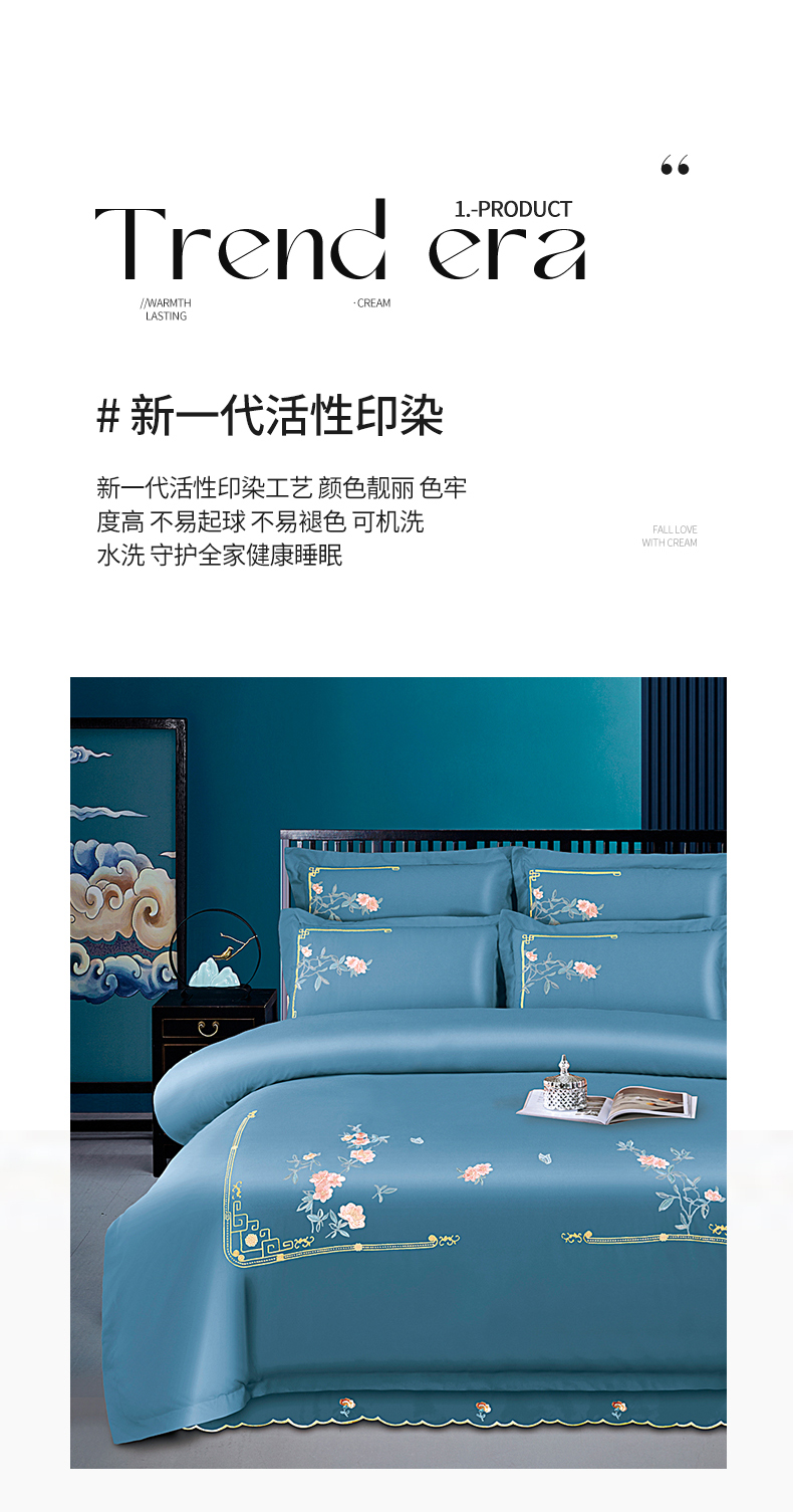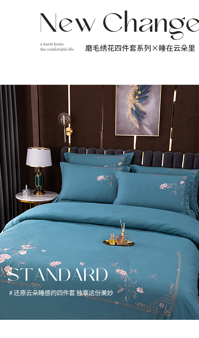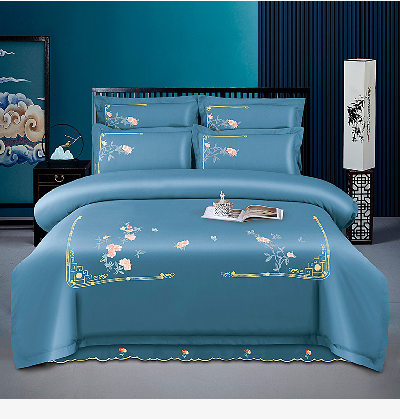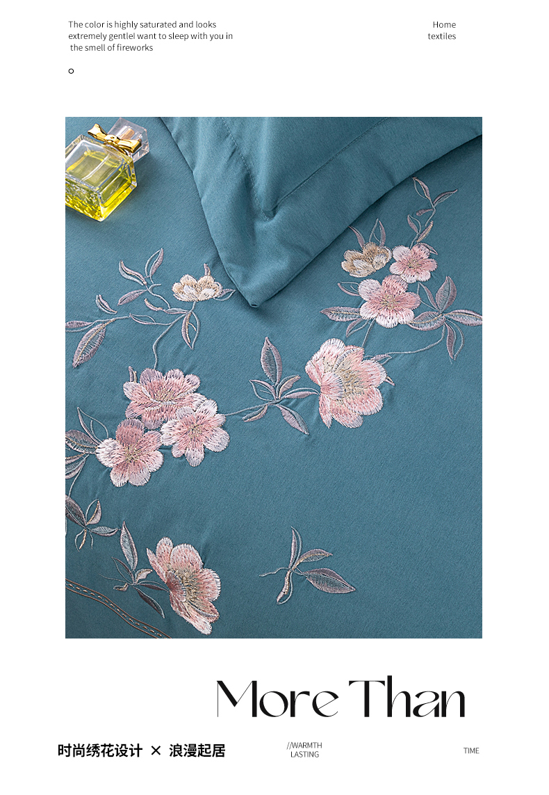 商品名称:伊而梦 2023新款精纺磨毛重工刺绣四件套--清心花语 清新花语-牛仔蓝