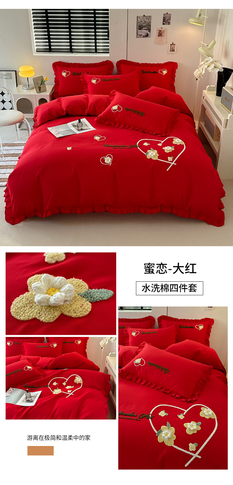 金米诺 2024新款水洗磨毛花边四件套夏被四件套-蜜恋 蜜恋-大红
