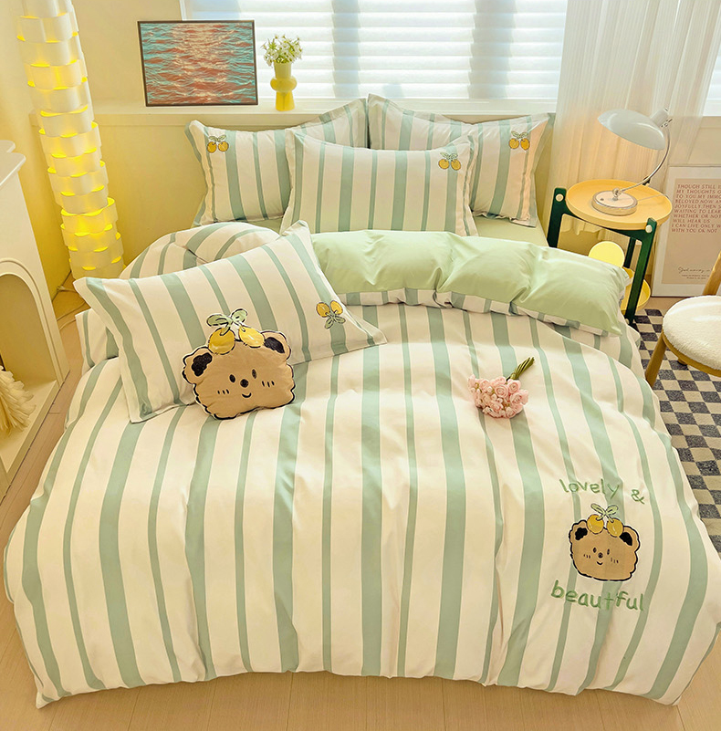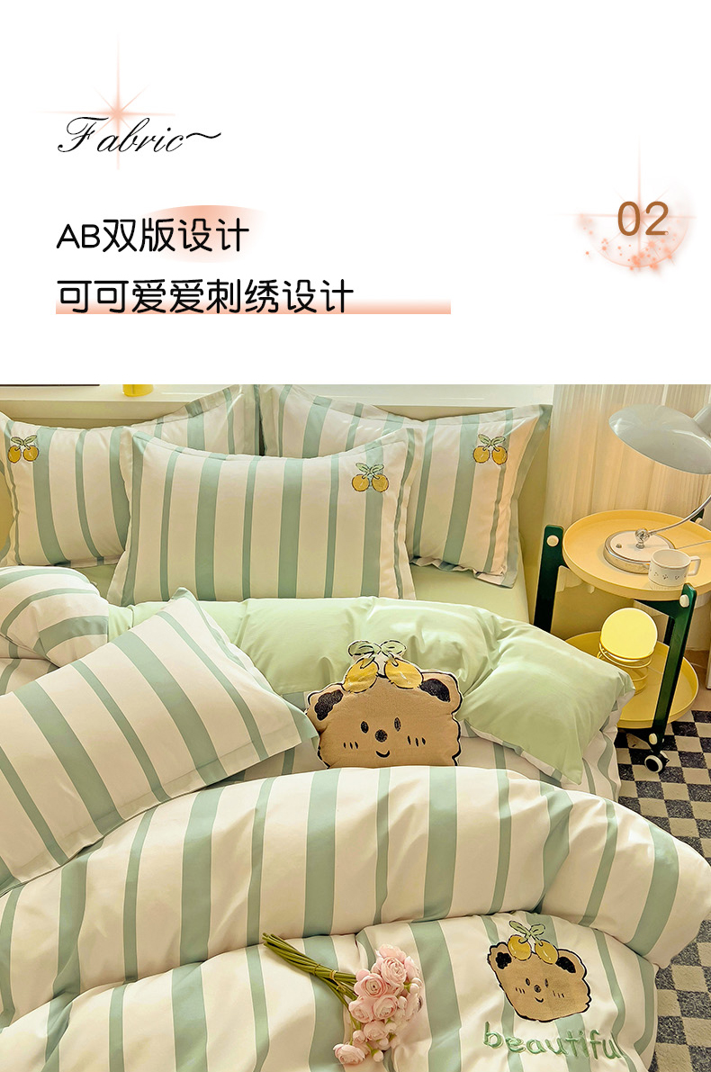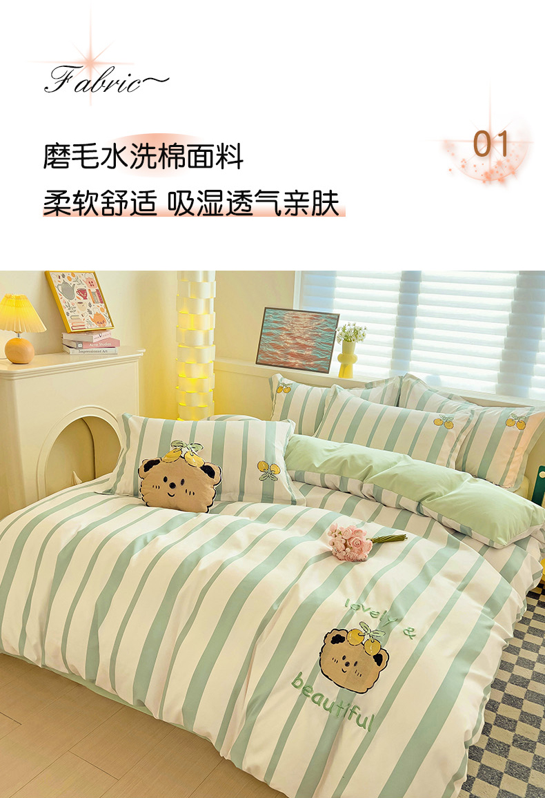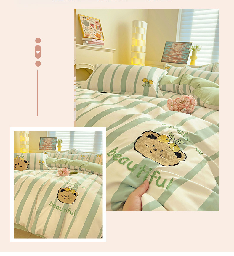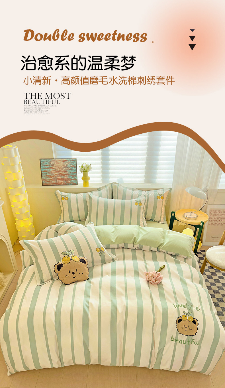 娜娜 2024新款磨毛水洗棉刺绣四件套 樱桃小熊-绿