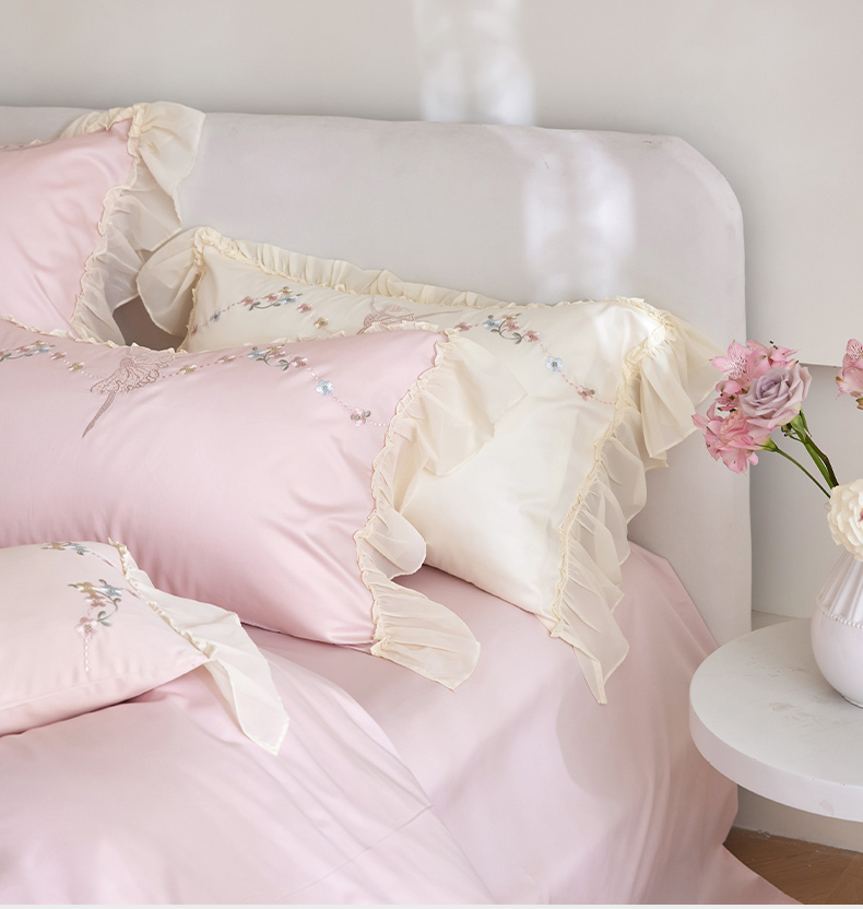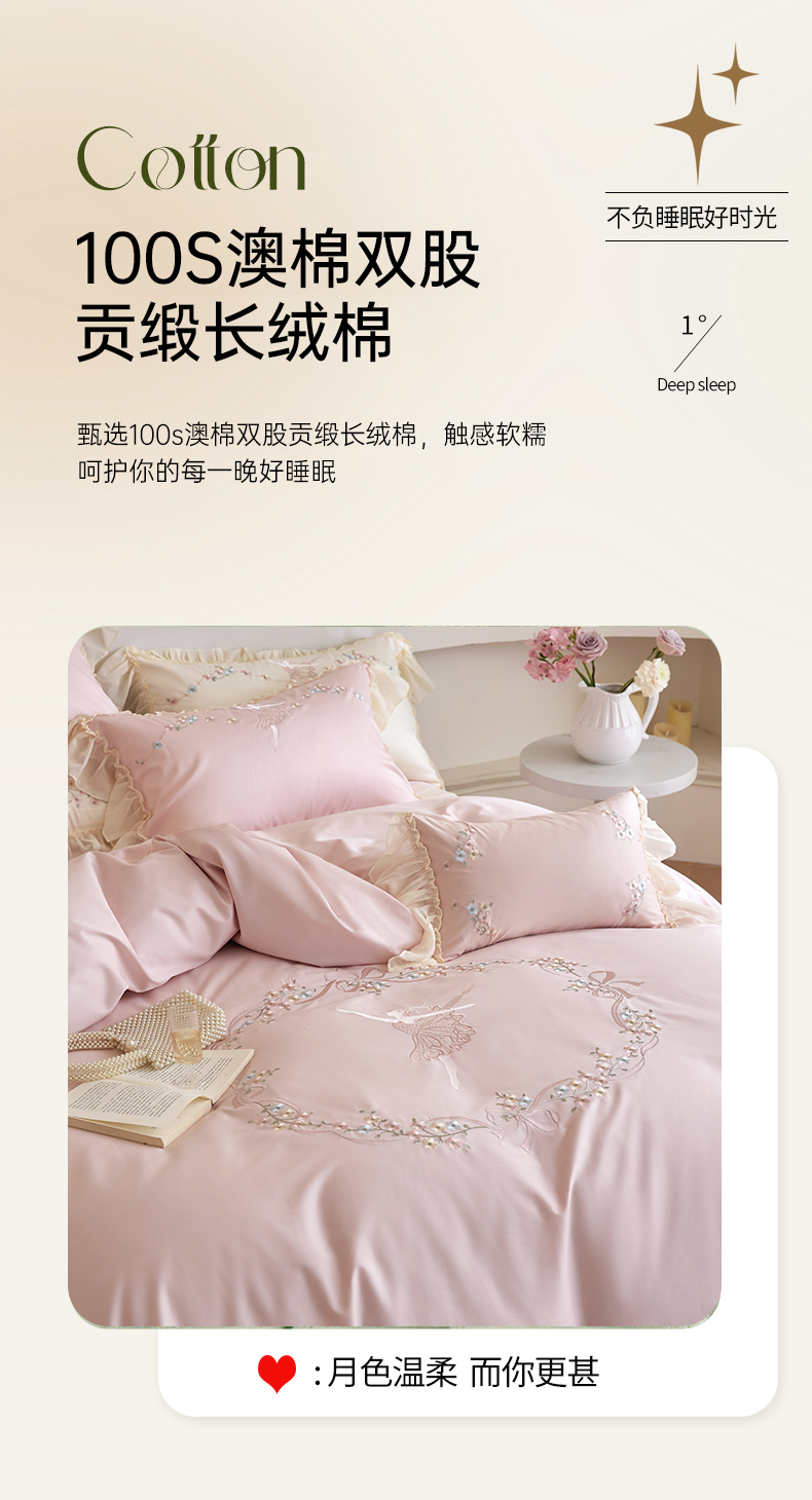 嘉汀兰2024新款100S澳棉双股贡缎刺绣长绒棉六件套 樱花粉