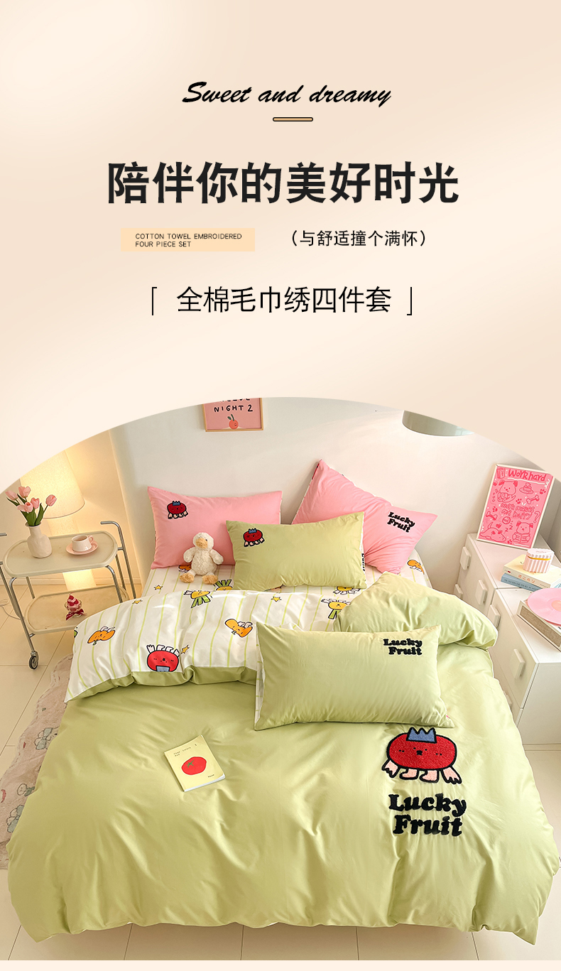 金丝鸟家纺 2024新款全棉混搭毛巾绣四件套可爱卡通库洛米系列 绿色果蔬乐园