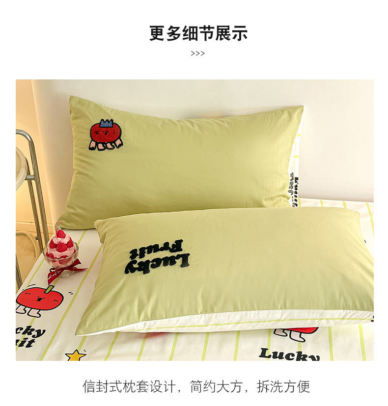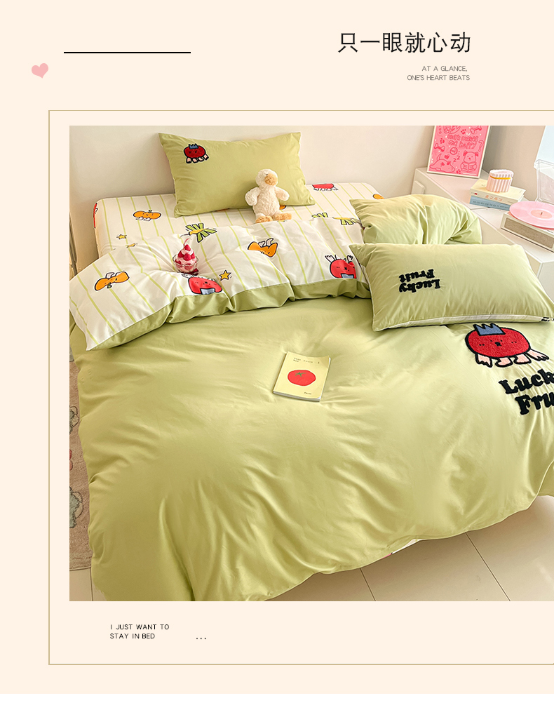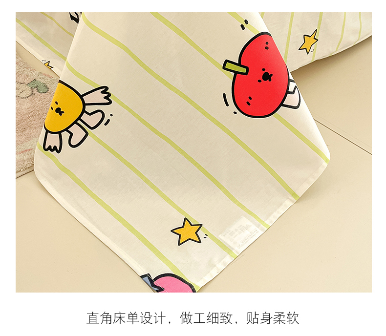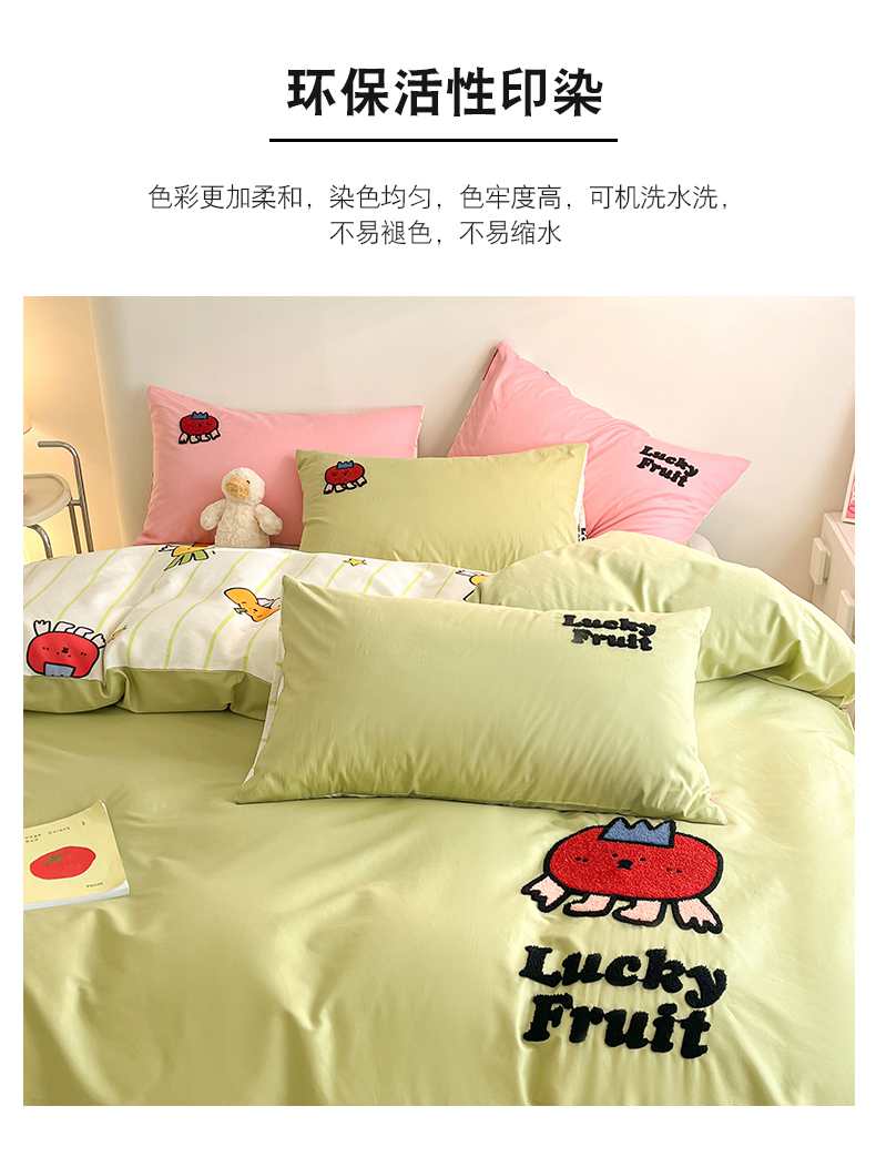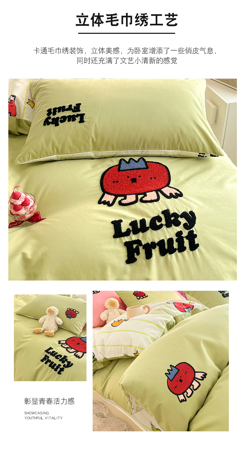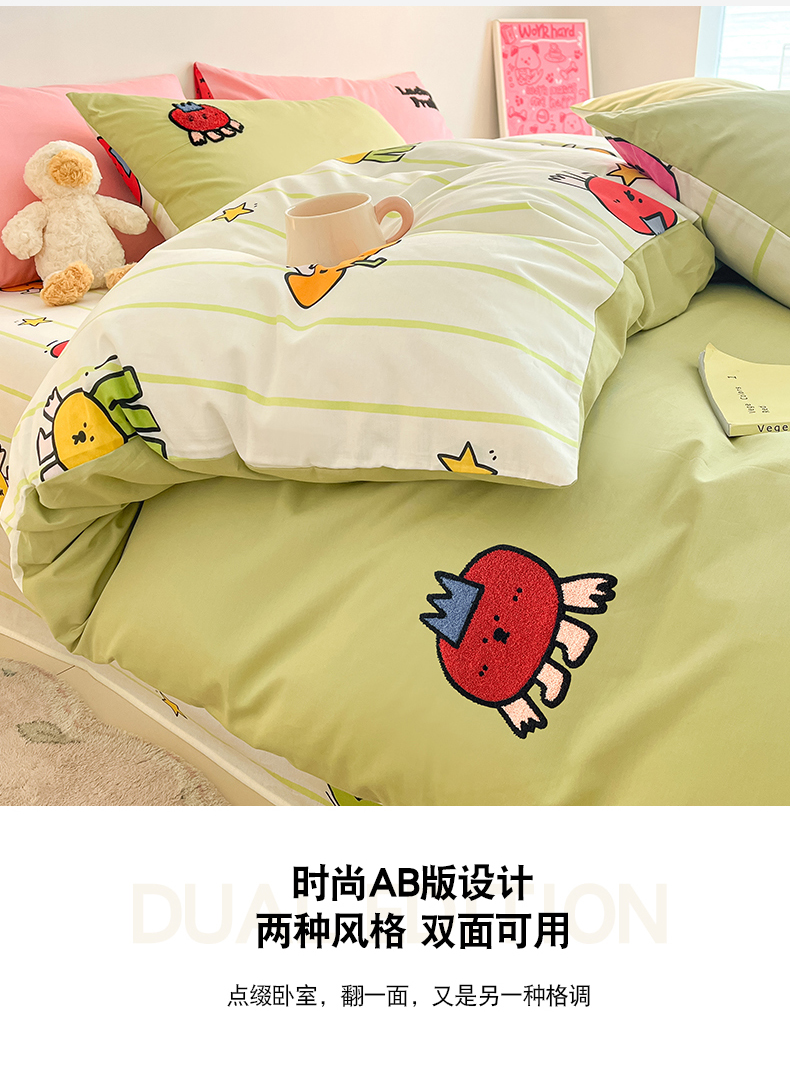 商品名称:金丝鸟家纺 2024新款全棉混搭毛巾绣四件套可爱卡通库洛米系列 绿色果蔬乐园