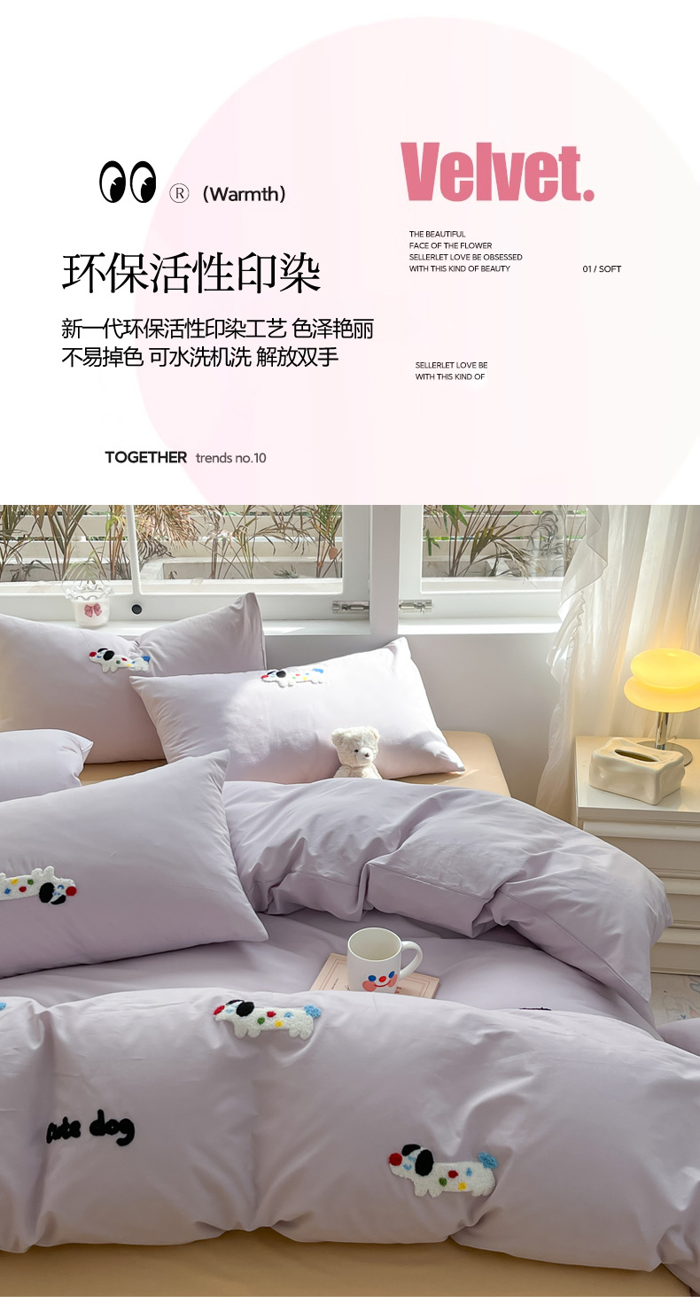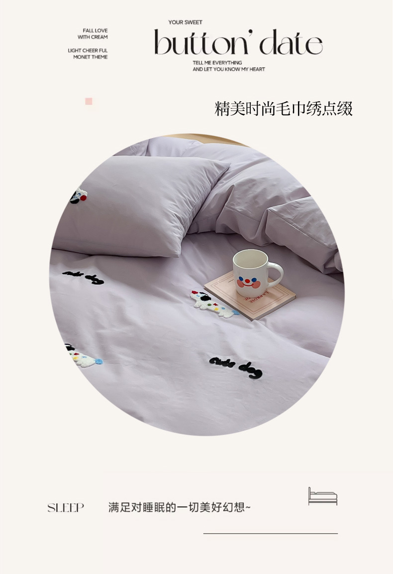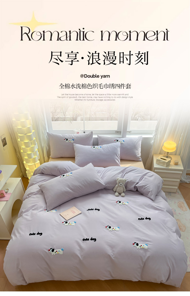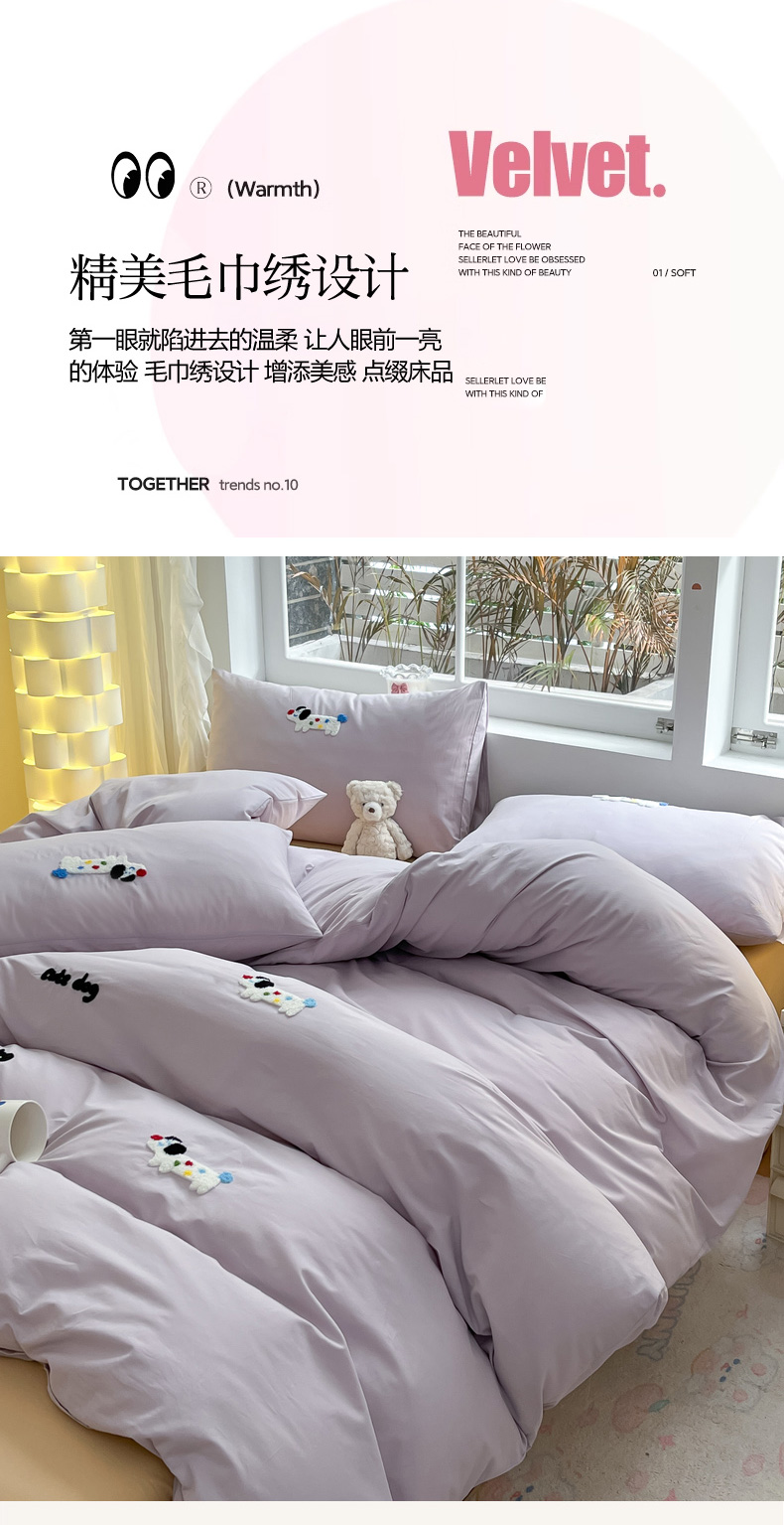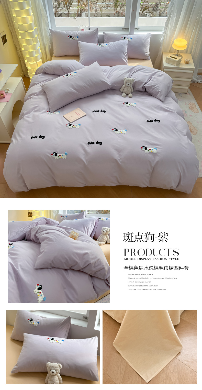 商品名称:寐居家纺 2024新款全棉水洗棉毛巾绣色织四件套 斑点狗-紫