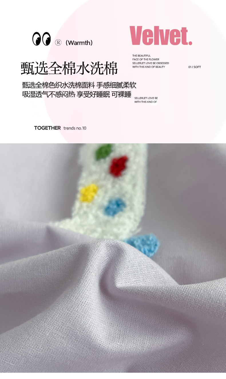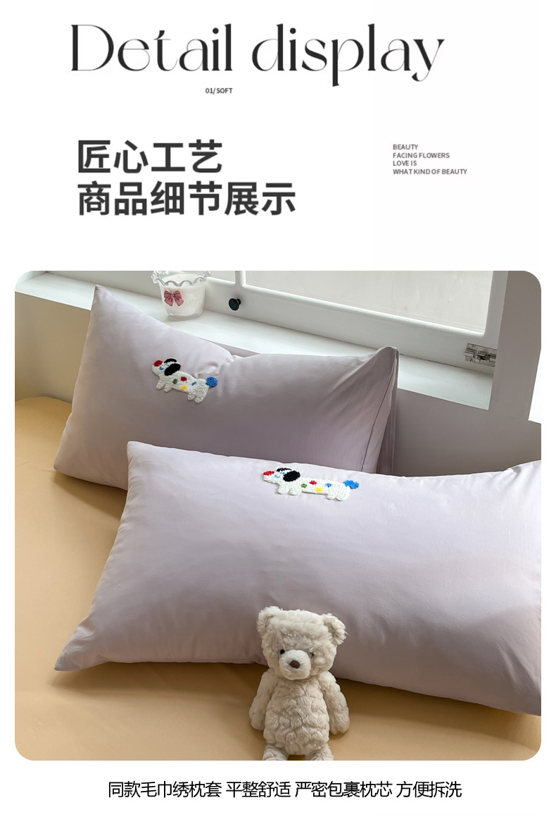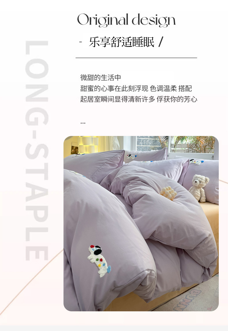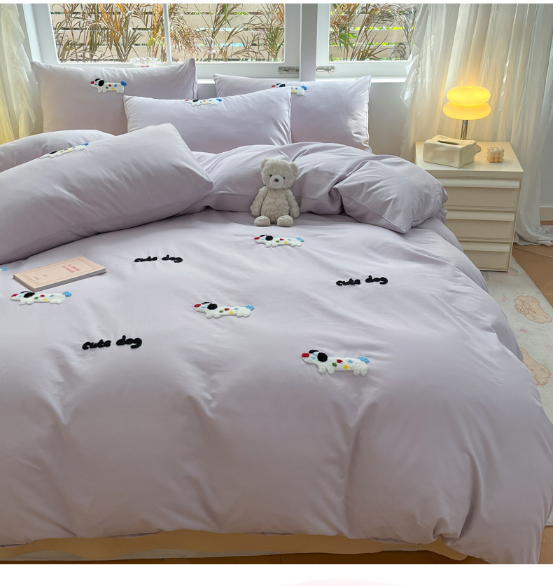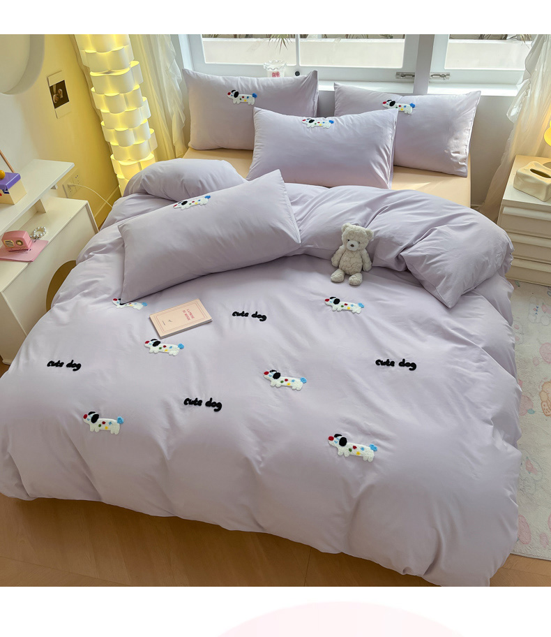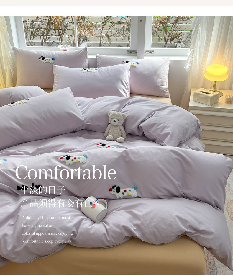 商品名称:寐居家纺 2024新款全棉水洗棉毛巾绣色织四件套 斑点狗-紫