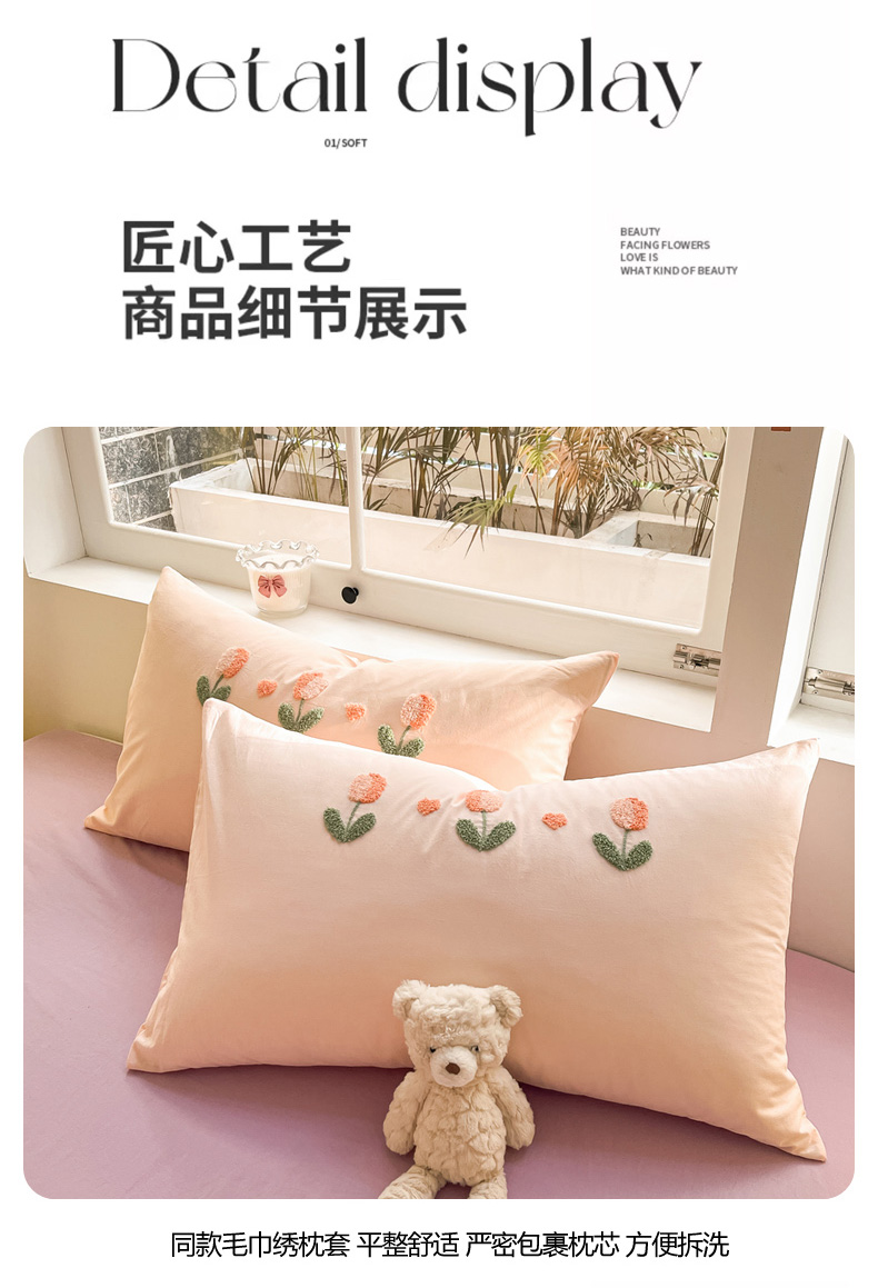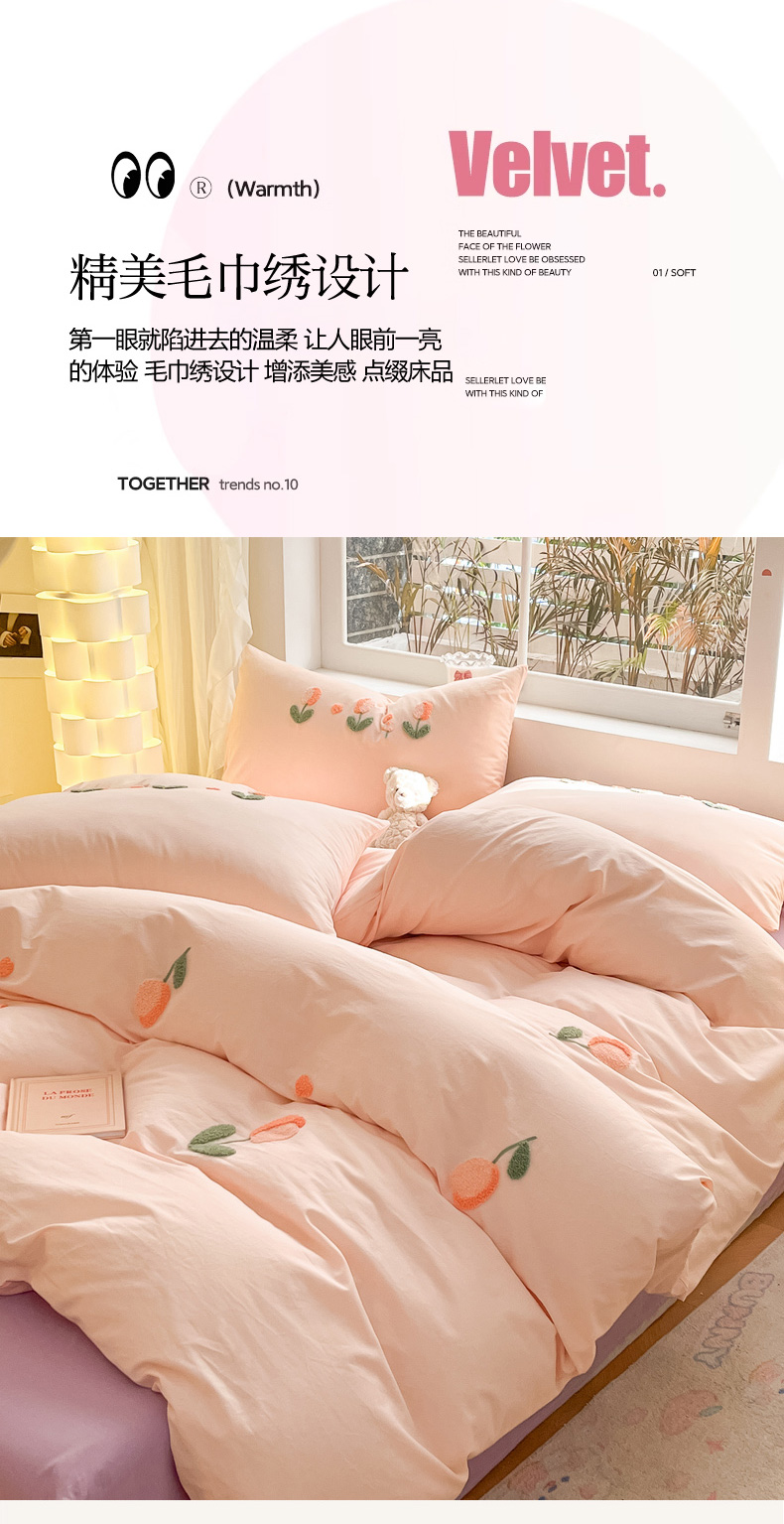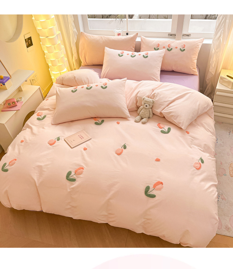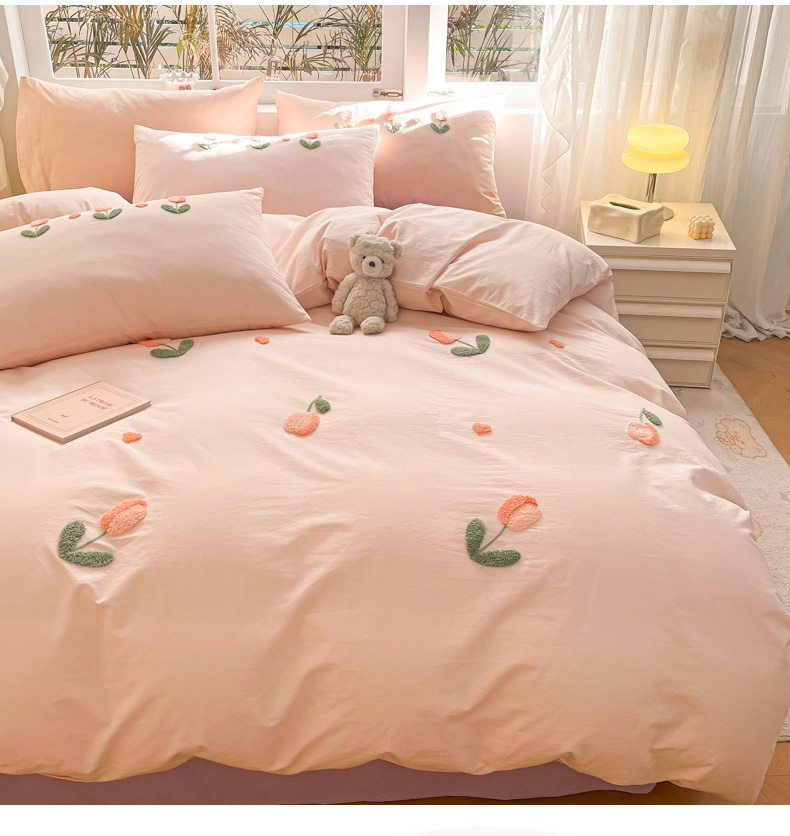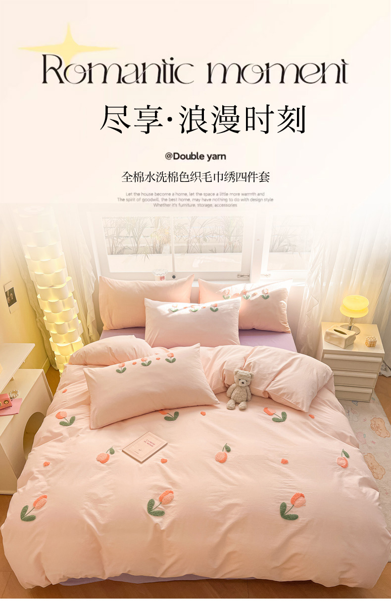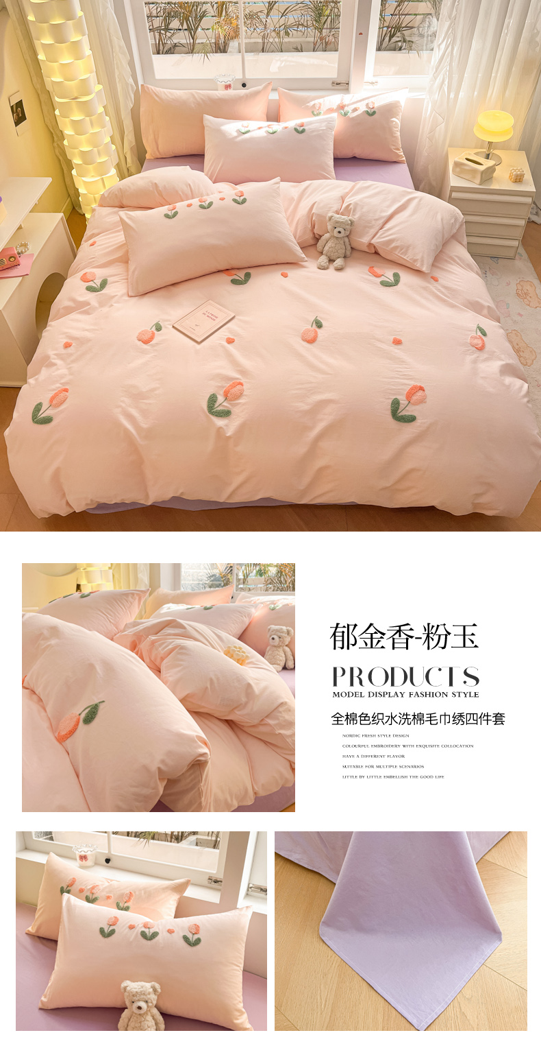 商品名称:寐居家纺 2024新款全棉水洗棉毛巾绣色织四件套 郁金香-粉玉
