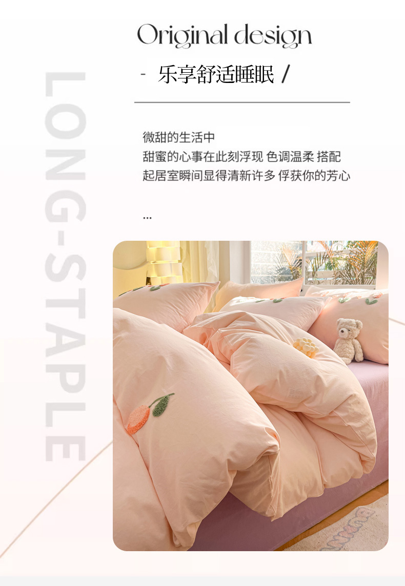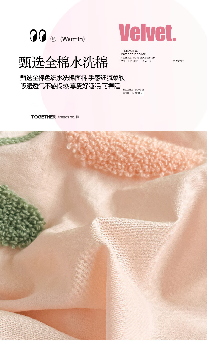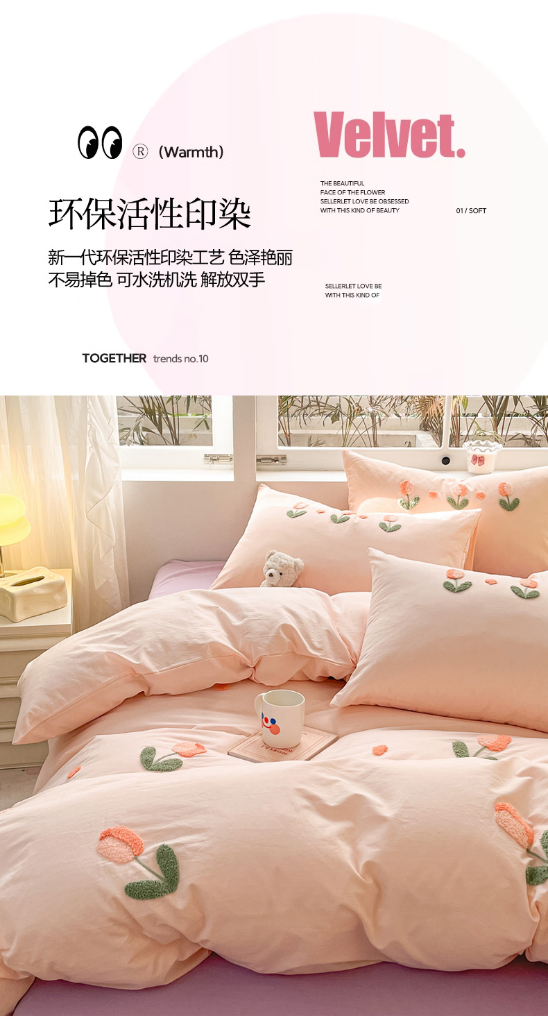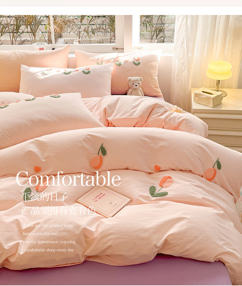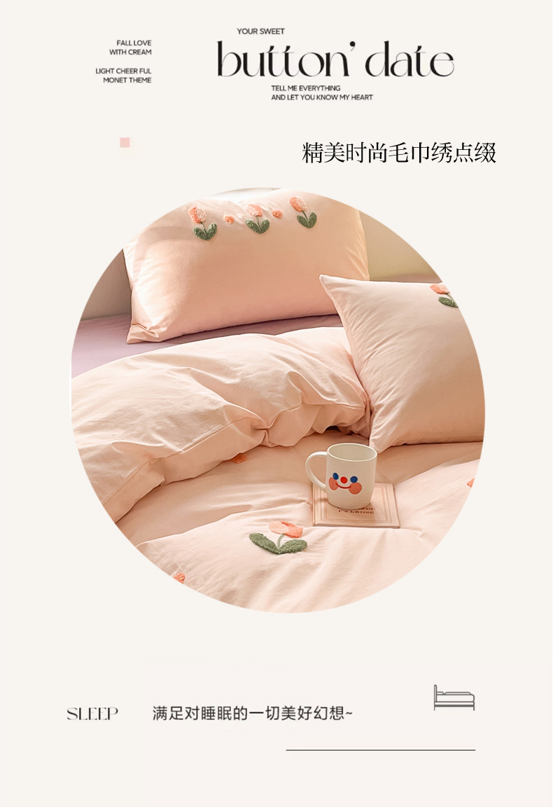 商品名称:寐居家纺 2024新款全棉水洗棉毛巾绣色织四件套 郁金香-粉玉