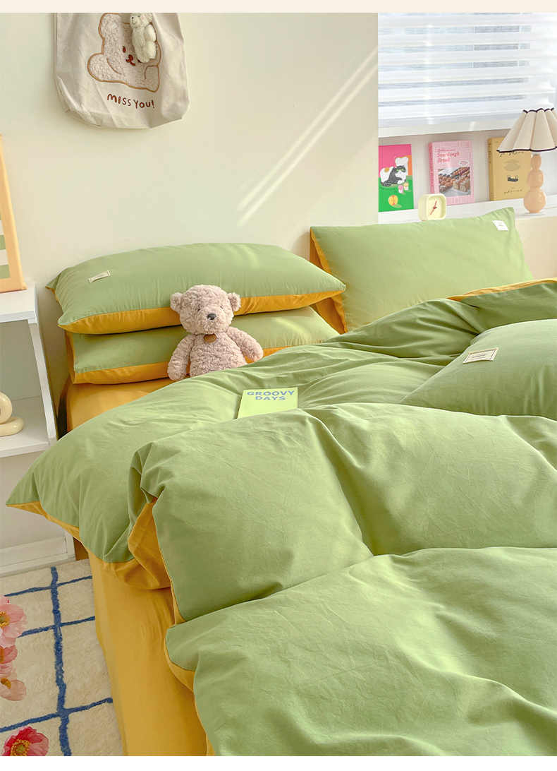 雅居纺家纺 2024新款全棉素色水洗棉四件套 果绿绅士黄