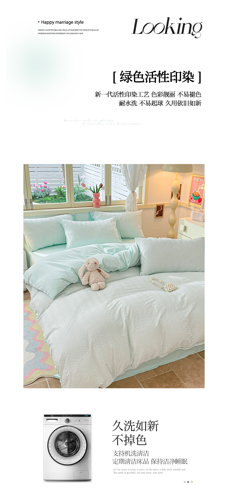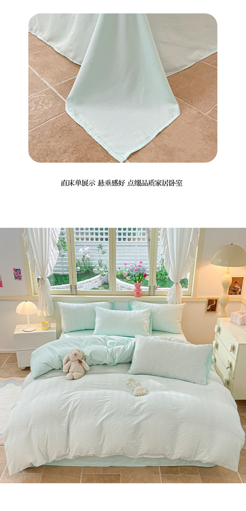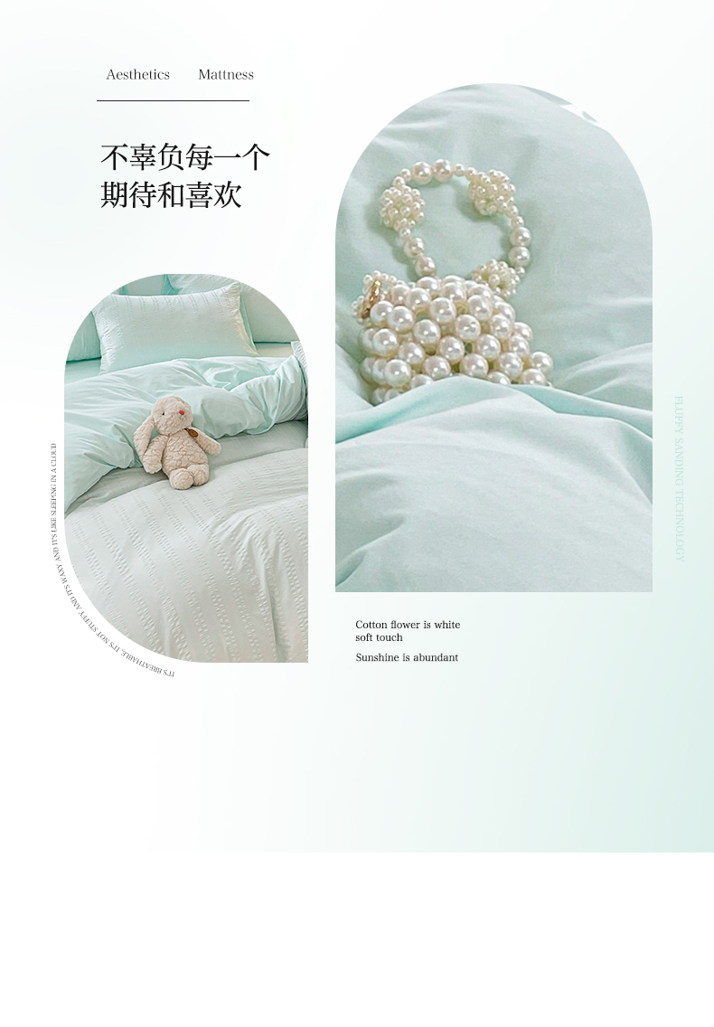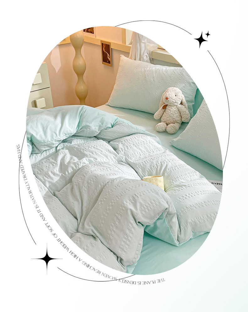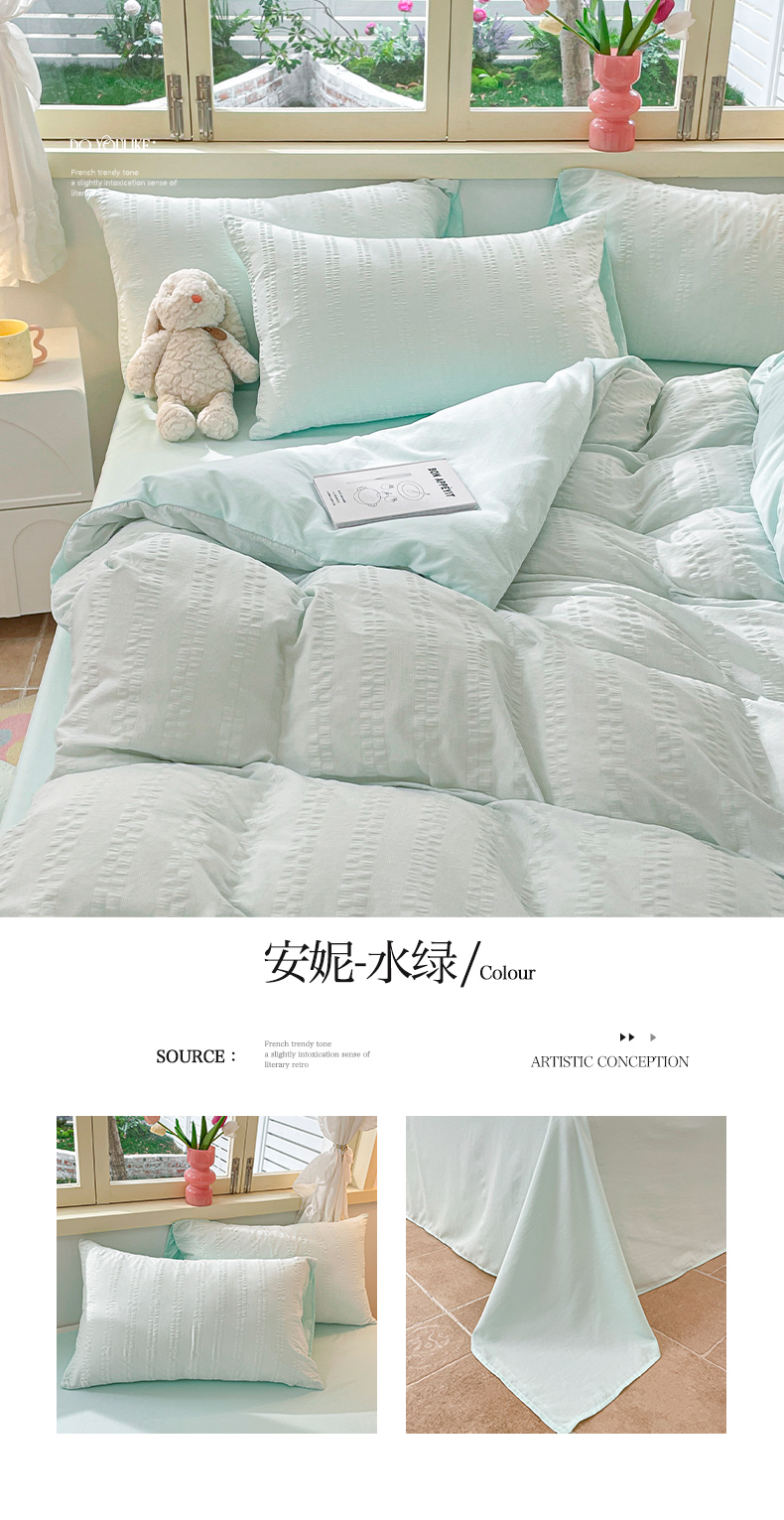 当前位置: 91家纺网 > 商品网购 > 床品套件 > 四件套 > 普通磨毛四件套 > 梦之岛 2024新款小清新泡泡纱安妮系列水洗磨毛四件套 安妮-水绿