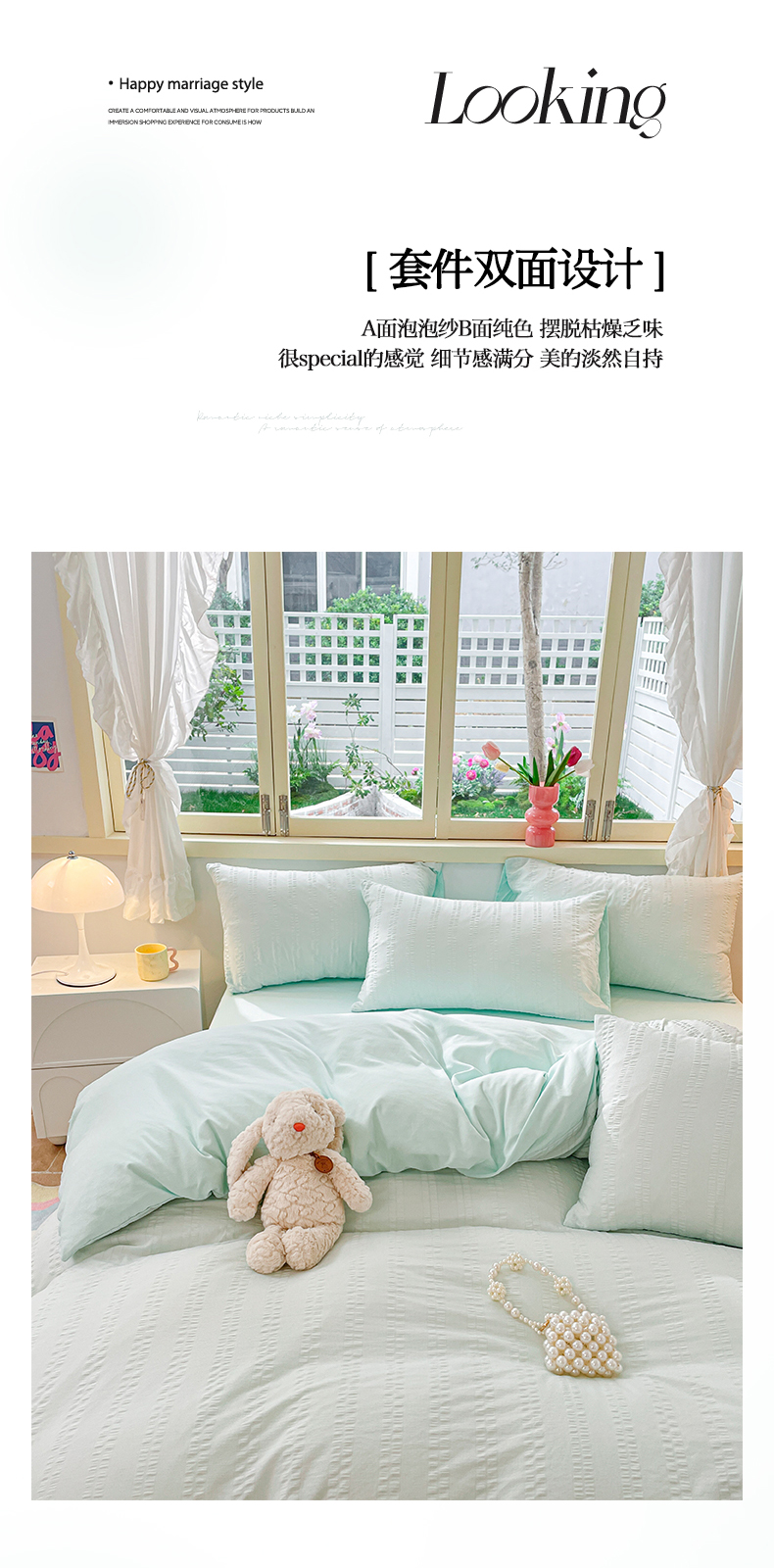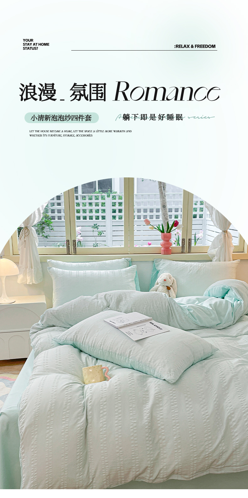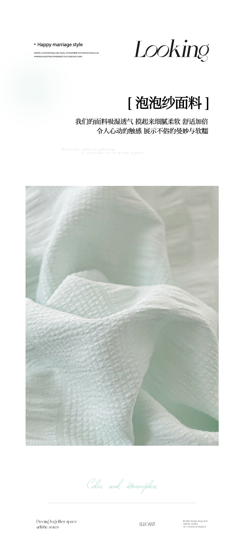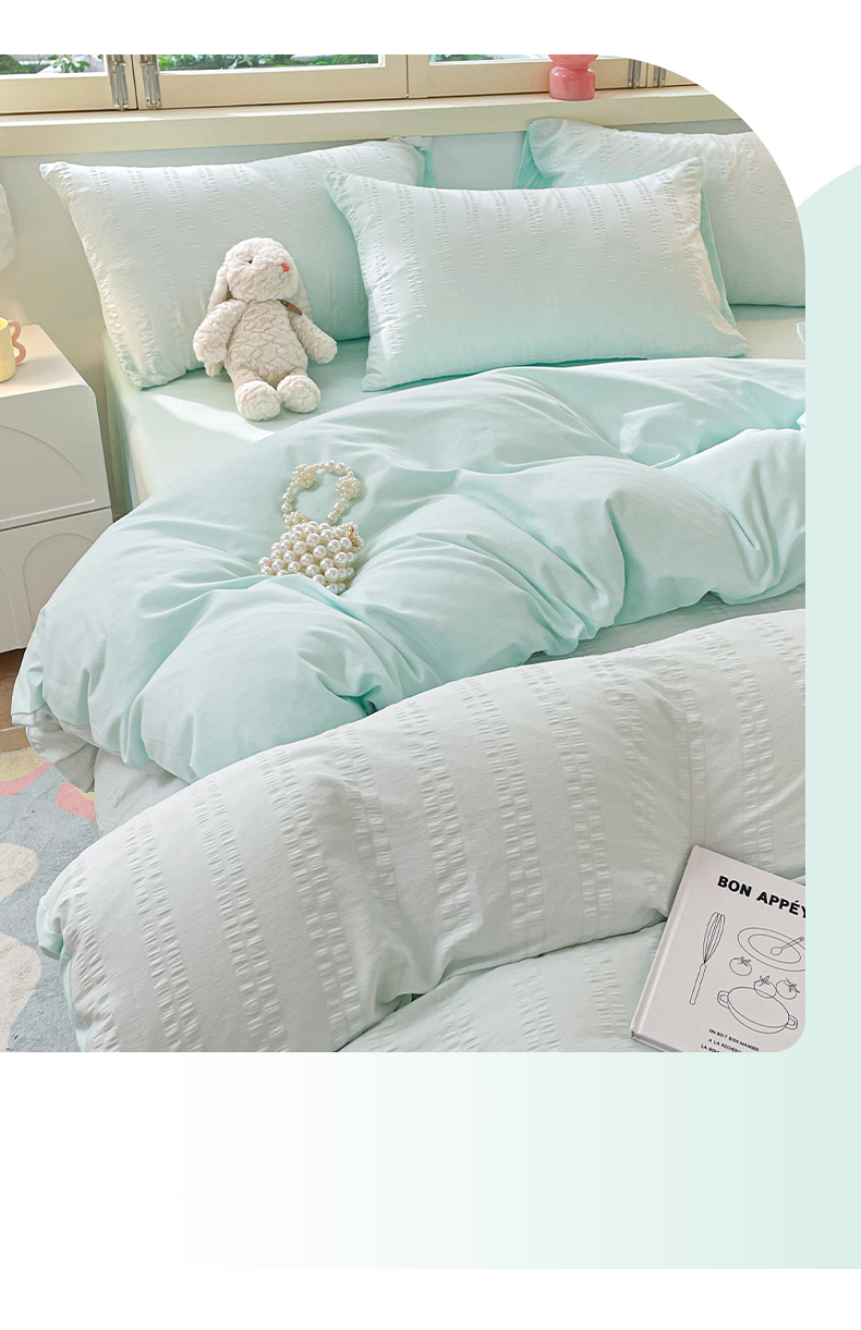当前位置: 91家纺网 > 商品网购 > 床品套件 > 四件套 > 普通磨毛四件套 > 梦之岛 2024新款小清新泡泡纱安妮系列水洗磨毛四件套 安妮-水绿