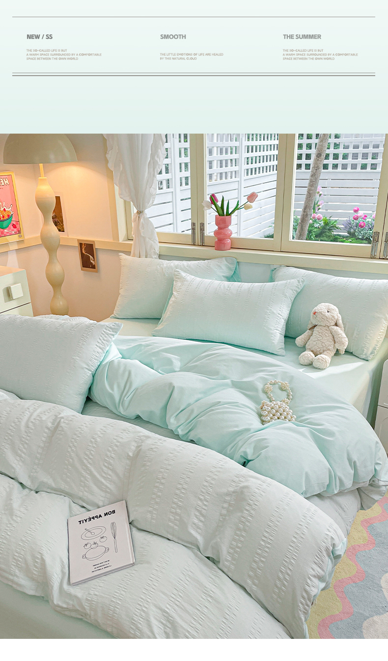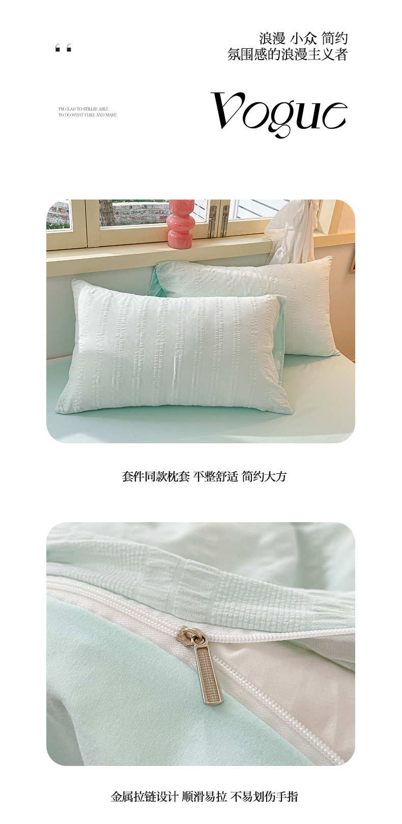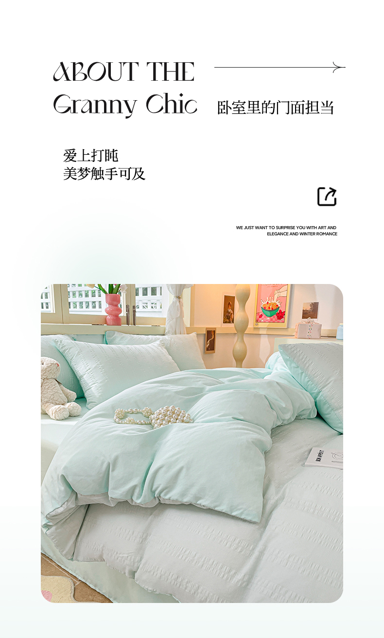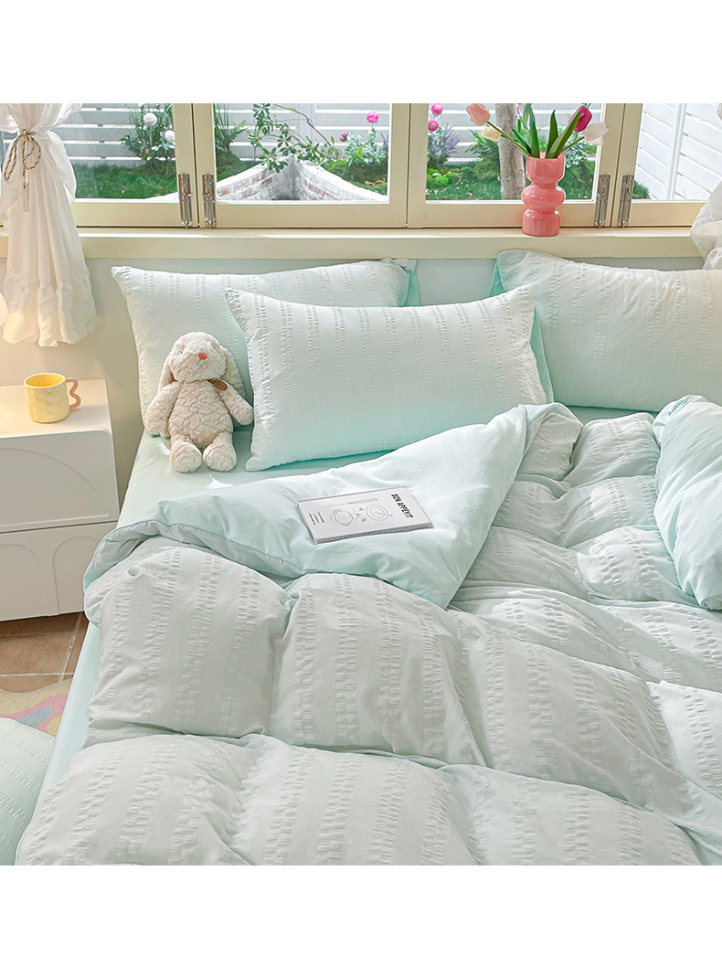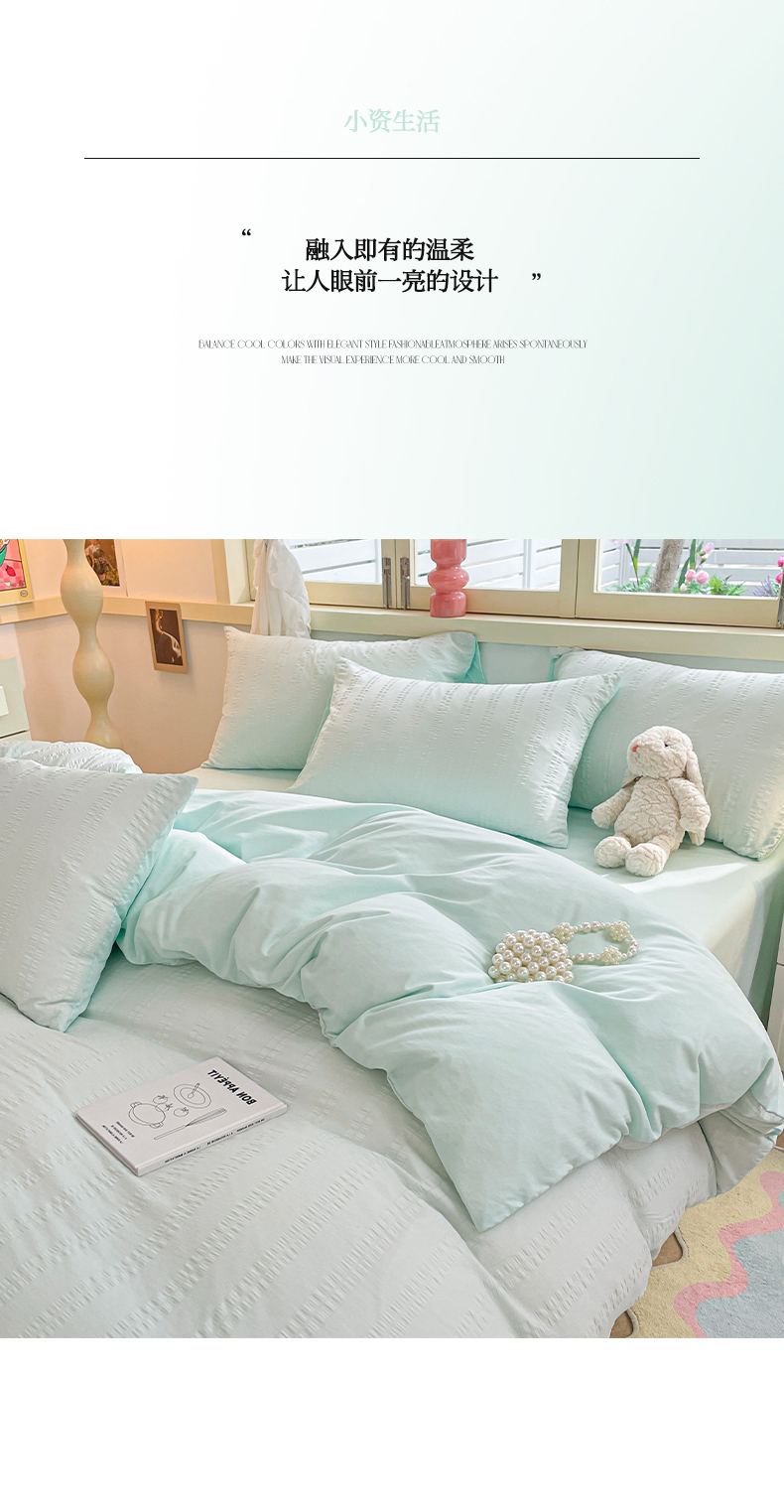 当前位置: 91家纺网 > 商品网购 > 床品套件 > 四件套 > 普通磨毛四件套 > 梦之岛 2024新款小清新泡泡纱安妮系列水洗磨毛四件套 安妮-水绿