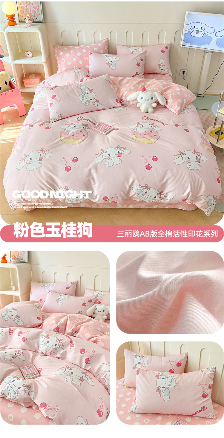 当前位置: 91家纺网 > 商品网购 > 床品套件 > 四件套 > 全棉普通四件套 > 博雅 2024新款全棉三丽鸥AB版活性印花四件套 粉色玉桂狗